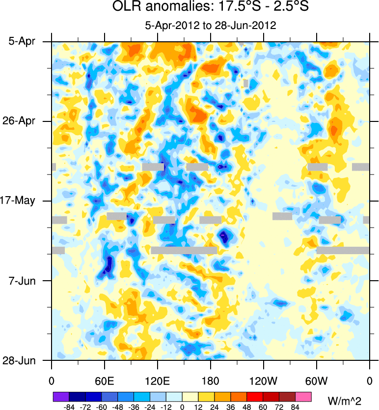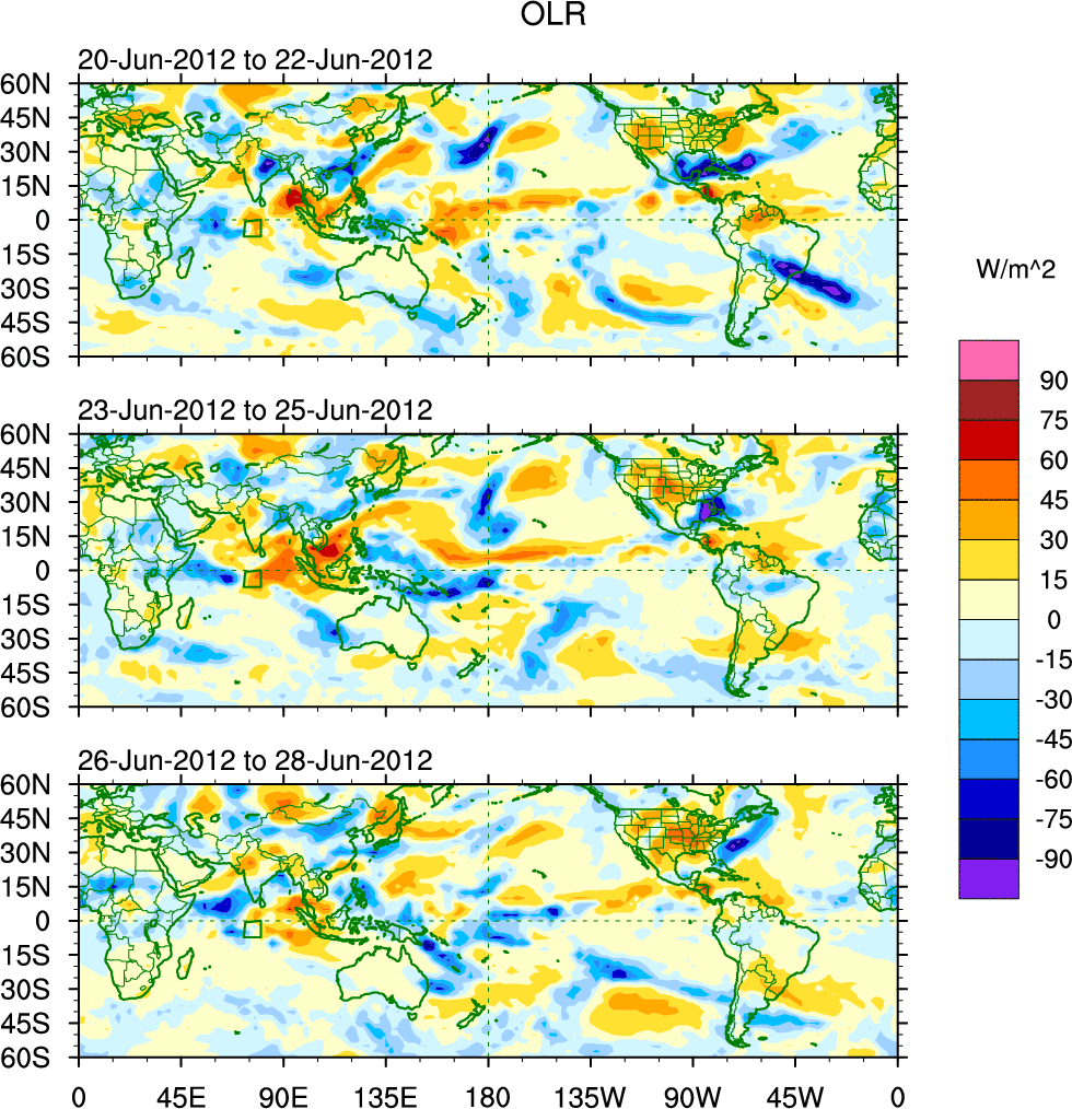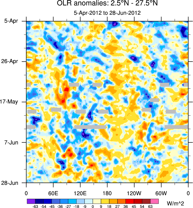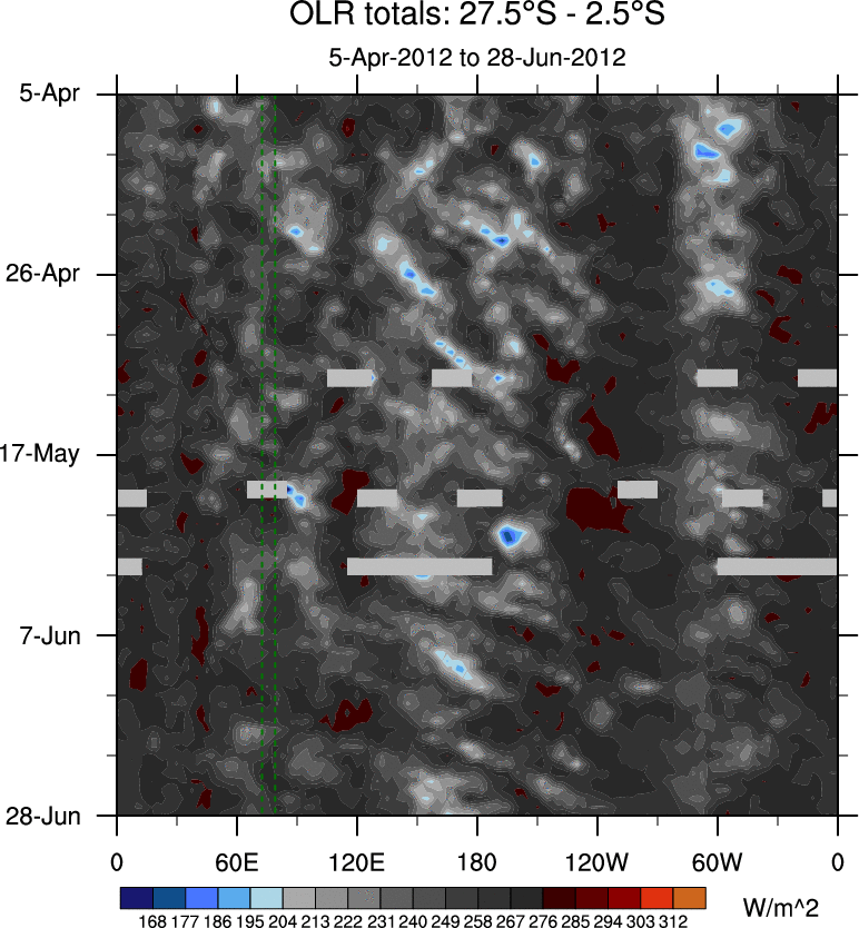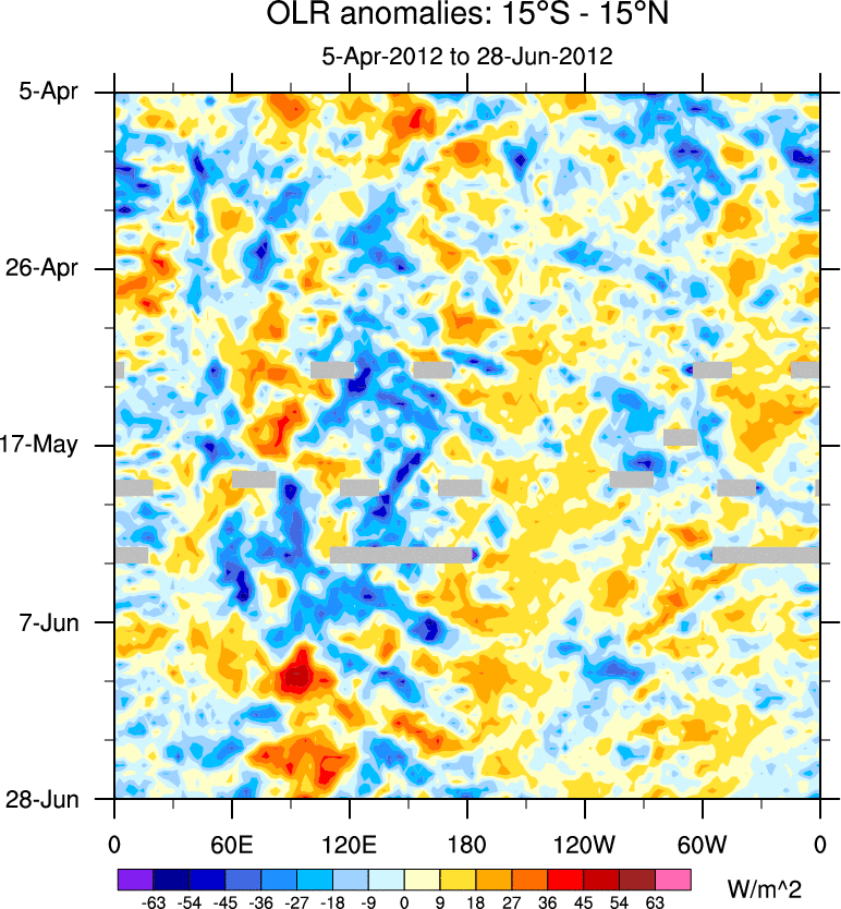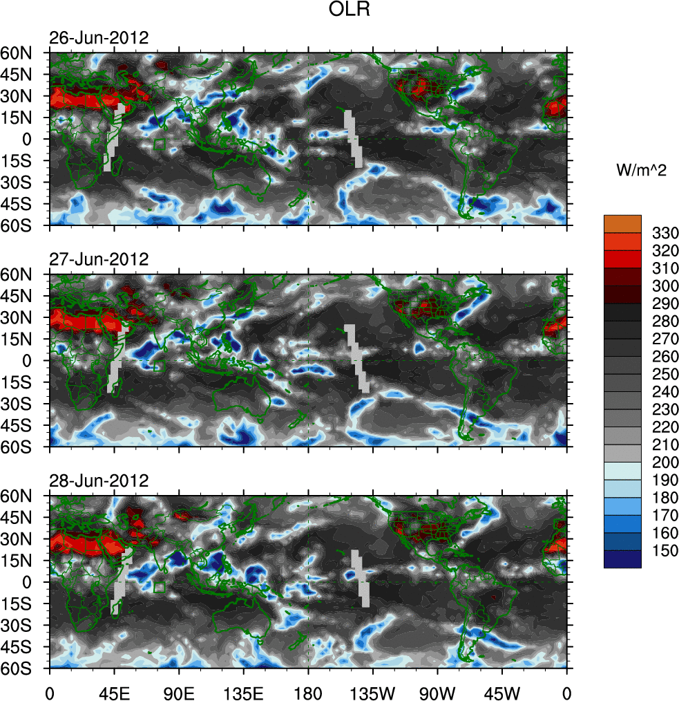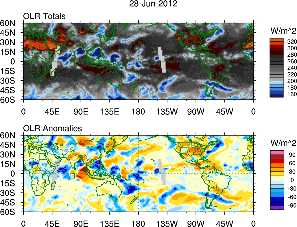 To identify tropical waves in near real-time, the OLR and UTWV data are filtered following Wheeler & Weickmann (2001 MWR). The daily anomalies are calculated using the first 3 harmonics of the seasonal cycle for 1979–2009. Missing values are then filled using linear interpolation in space and time. The most recent 365 days of anomalies are padded with 659 days of zeroes, and the result is filtered for each wave type.