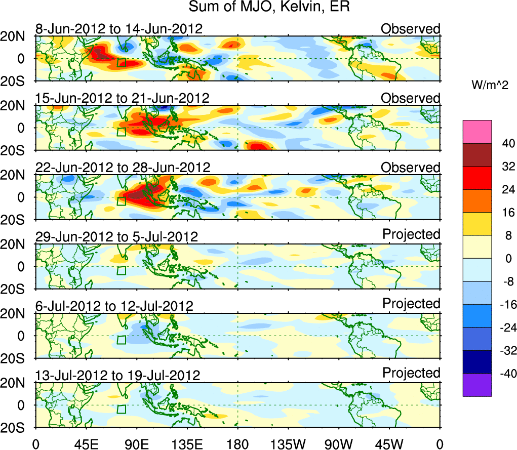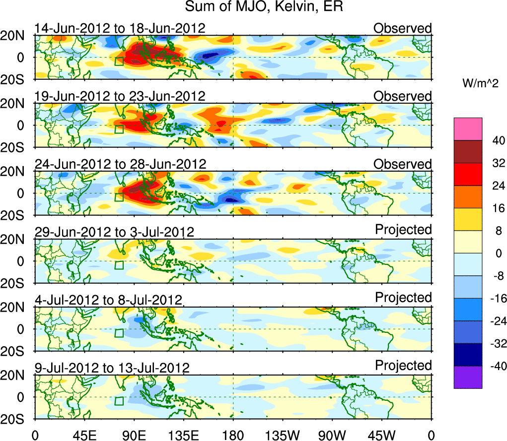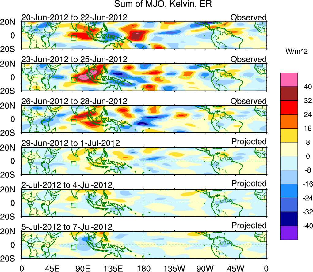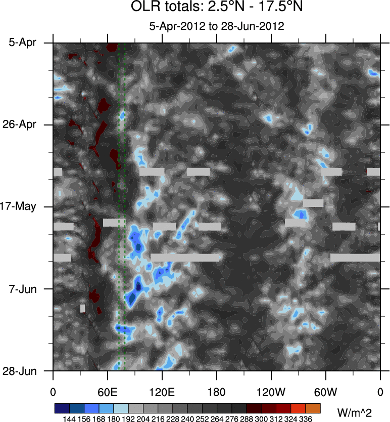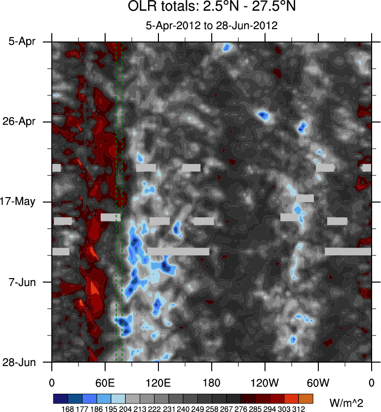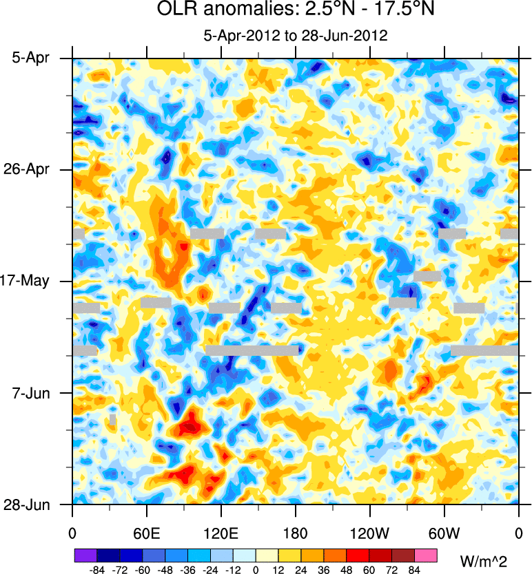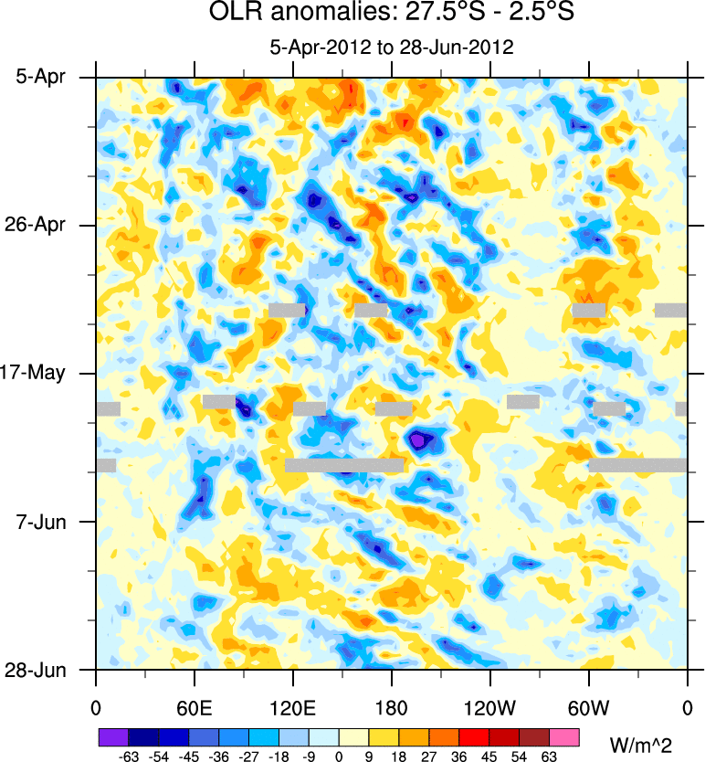 To identify tropical waves in near real-time, the OLR and UTWV data are filtered following Wheeler & Weickmann (2001 MWR). The daily anomalies are calculated using the first 3 harmonics of the seasonal cycle for 1979–2009. Missing values are then filled using linear interpolation in space and time. The most recent 365 days of anomalies are padded with 659 days of zeroes, and the result is filtered for each wave type.