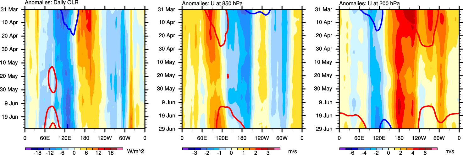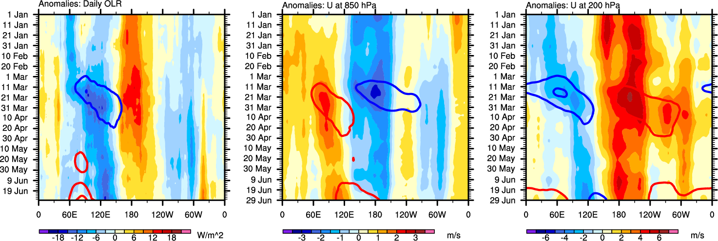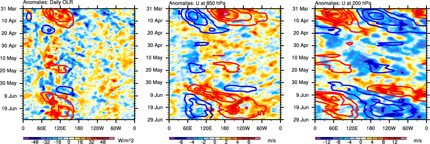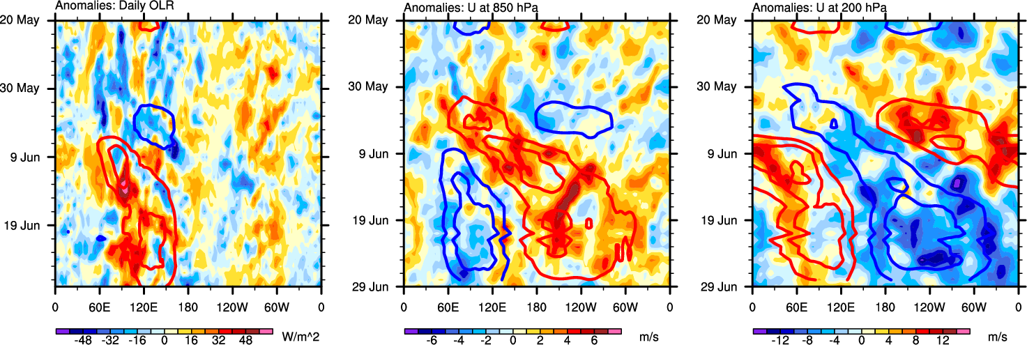 The Hovmollers show longitude-time plots for OLR, U-850, and U-200. The shading indicates the observed anomalies, while the contours are the projection of those anomalies onto the RMM EOFs.