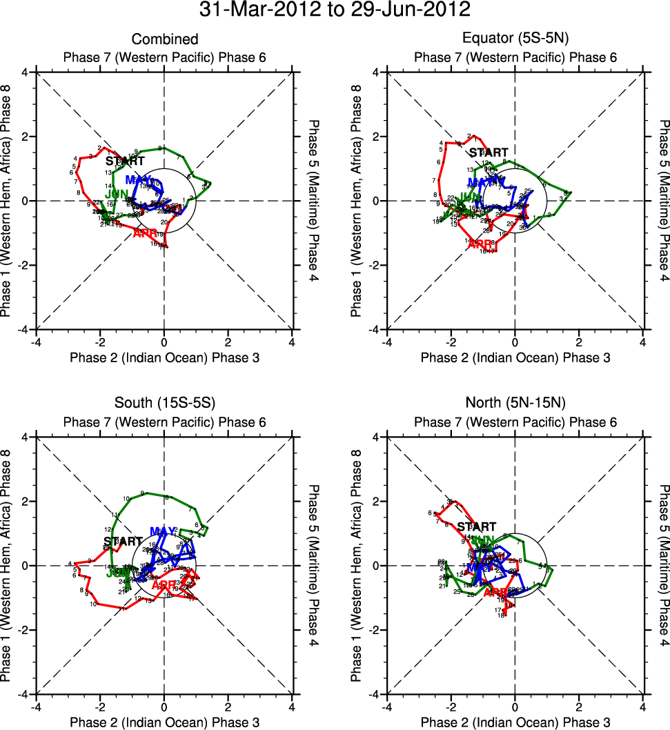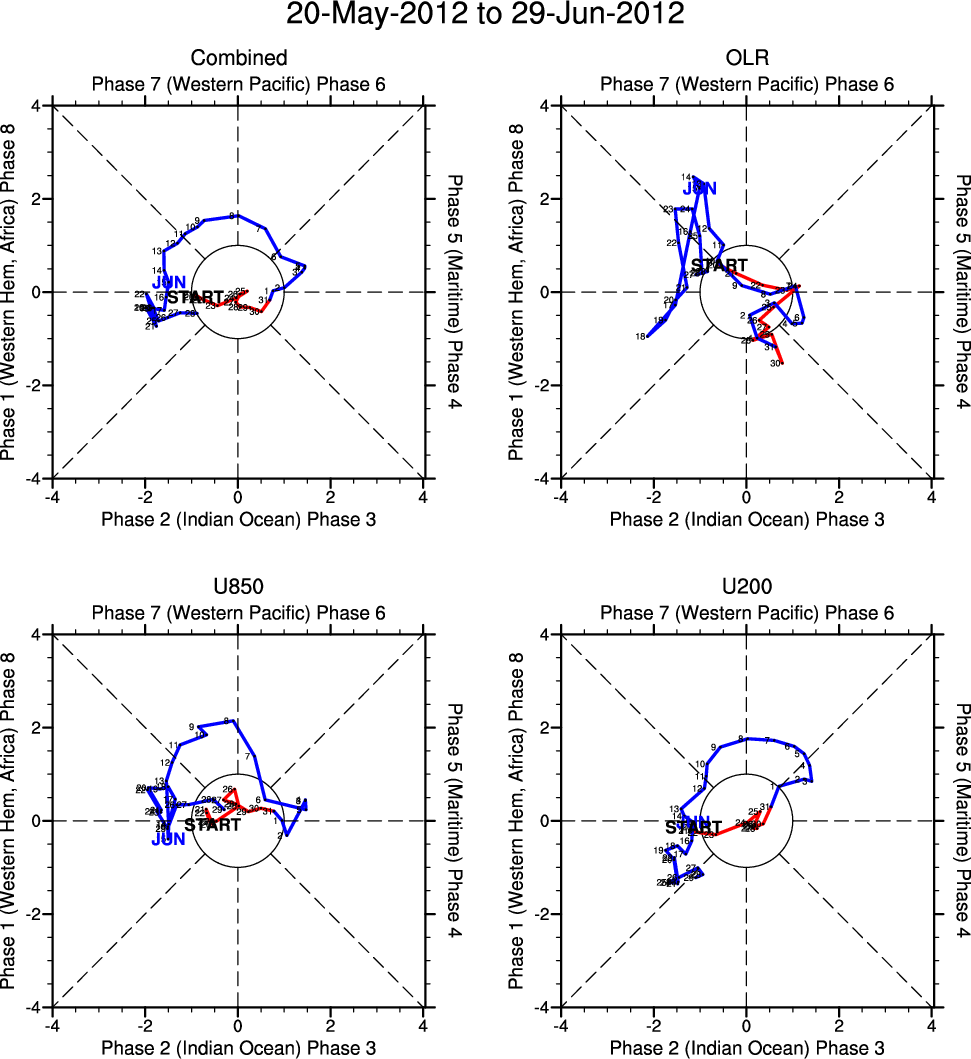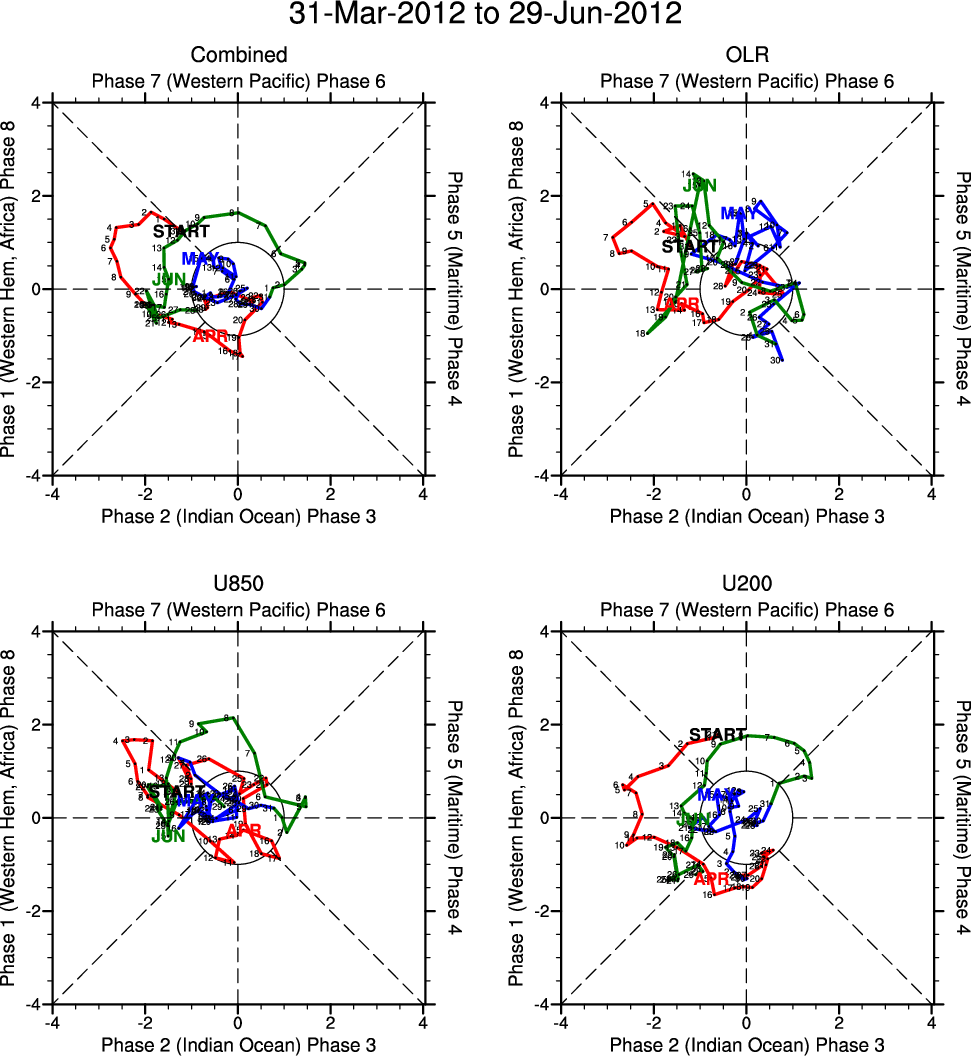 Wheeler and Hendon (2004) constructed the RMM index for monitoring the MJO. This index consists of the first two principal components (PCs) of OLR, 850-hPa zonal wind, and 200-hPa zonal wind averaged 15S-15N.