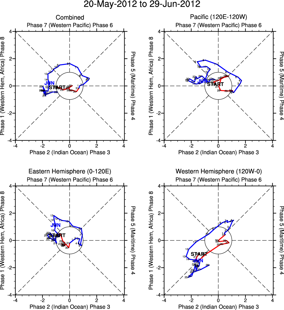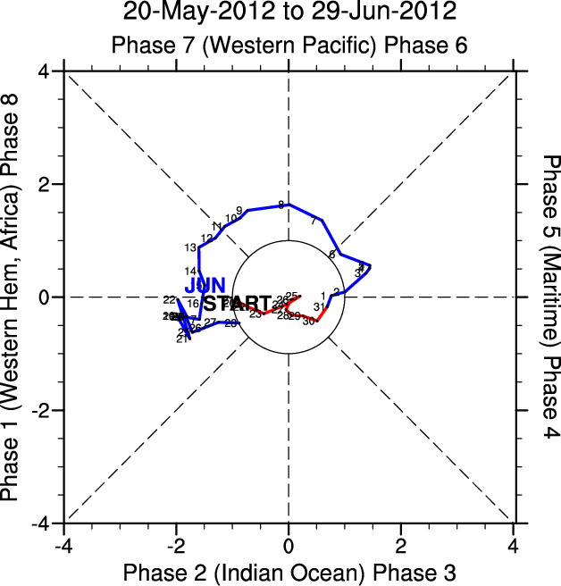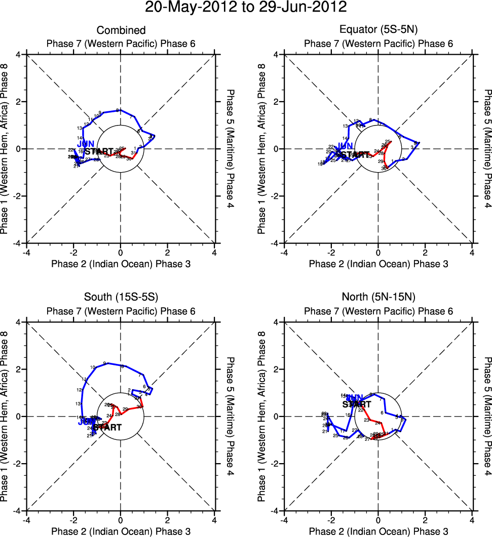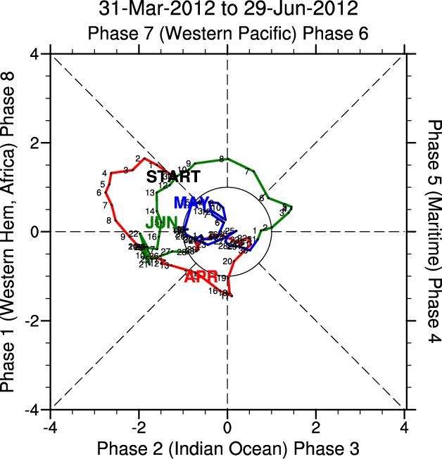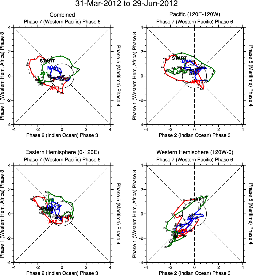 Wheeler and Hendon (2004) constructed the RMM index for monitoring the MJO. This index consists of the first two principal components (PCs) of OLR, 850-hPa zonal wind, and 200-hPa zonal wind averaged 15S-15N.