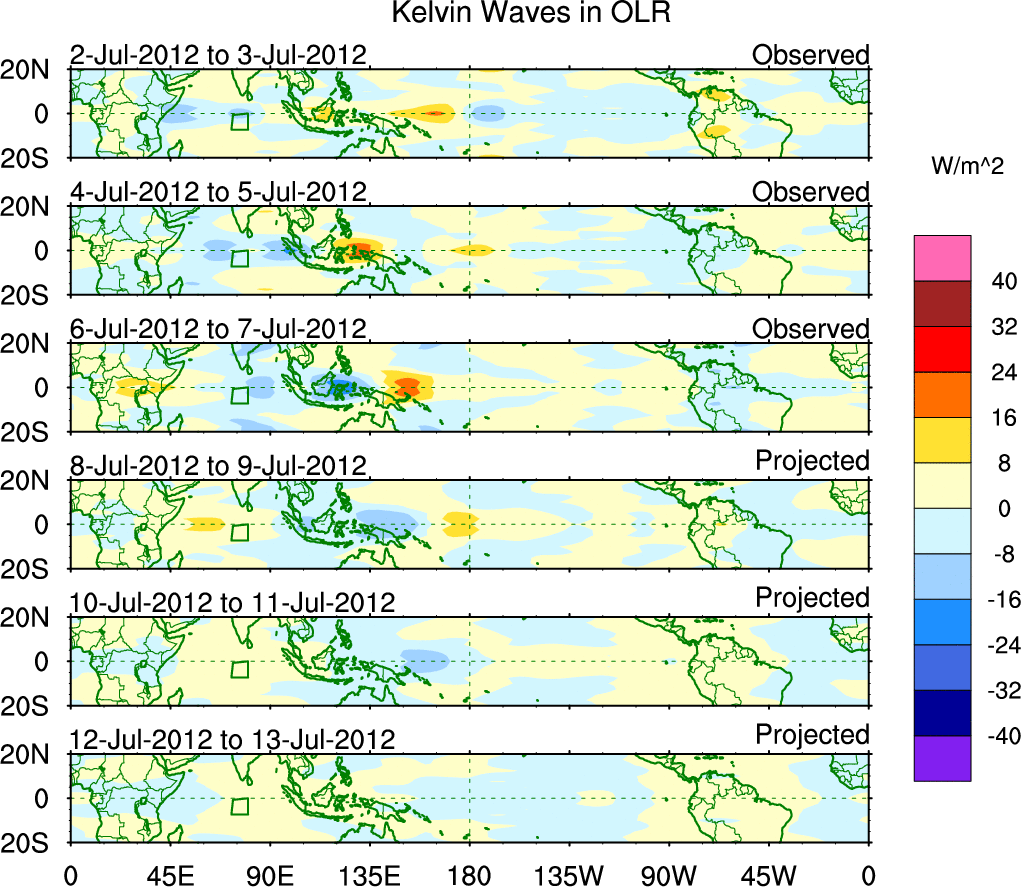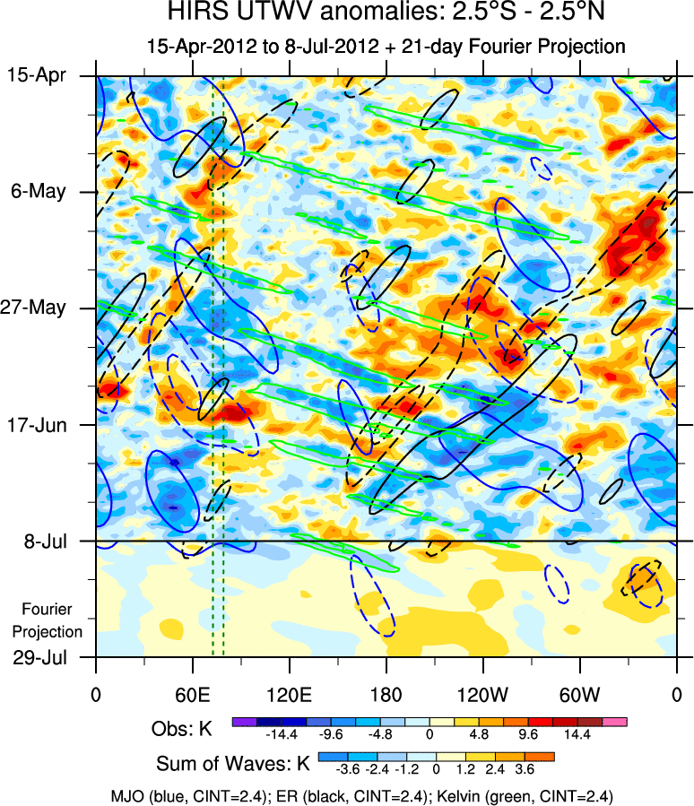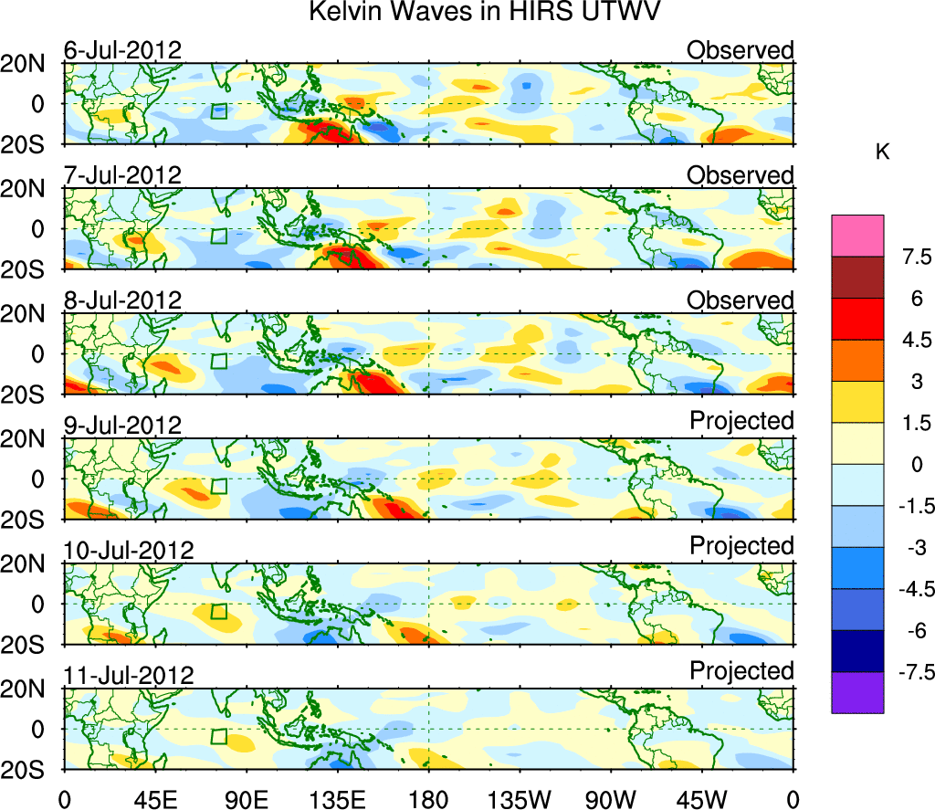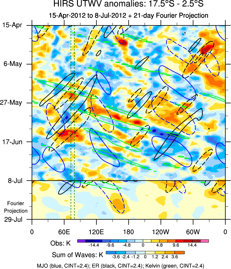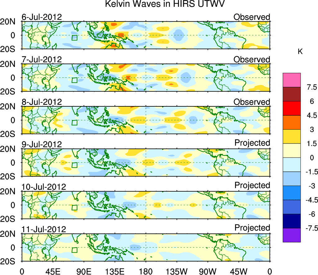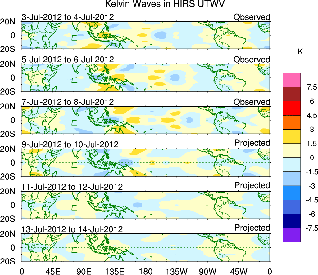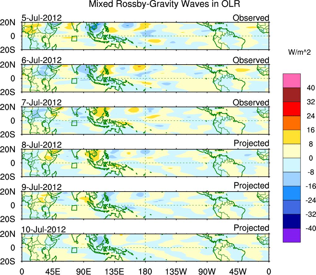 To identify tropical waves in near real-time, the OLR and UTWV data are filtered following Wheeler & Weickmann (2001 MWR). The daily anomalies are calculated using the first 3 harmonics of the seasonal cycle for 1979–2009. Missing values are then filled using linear interpolation in space and time. The most recent 365 days of anomalies are padded with 659 days of zeroes, and the result is filtered for each wave type.