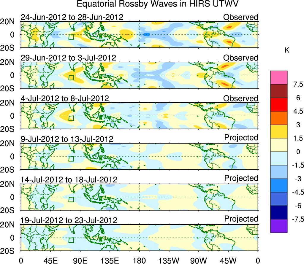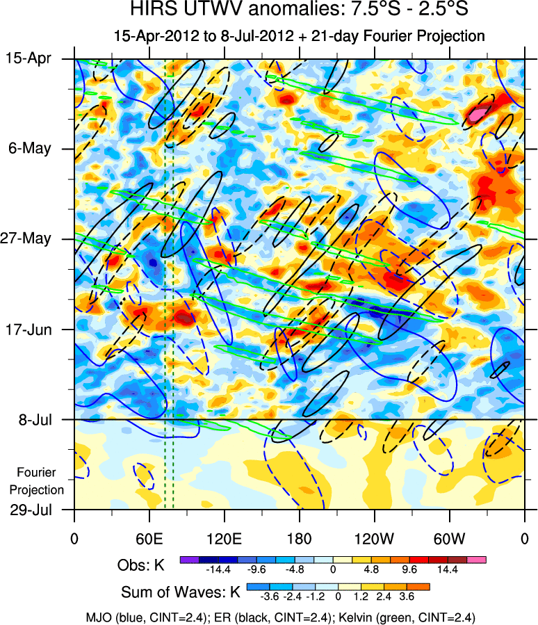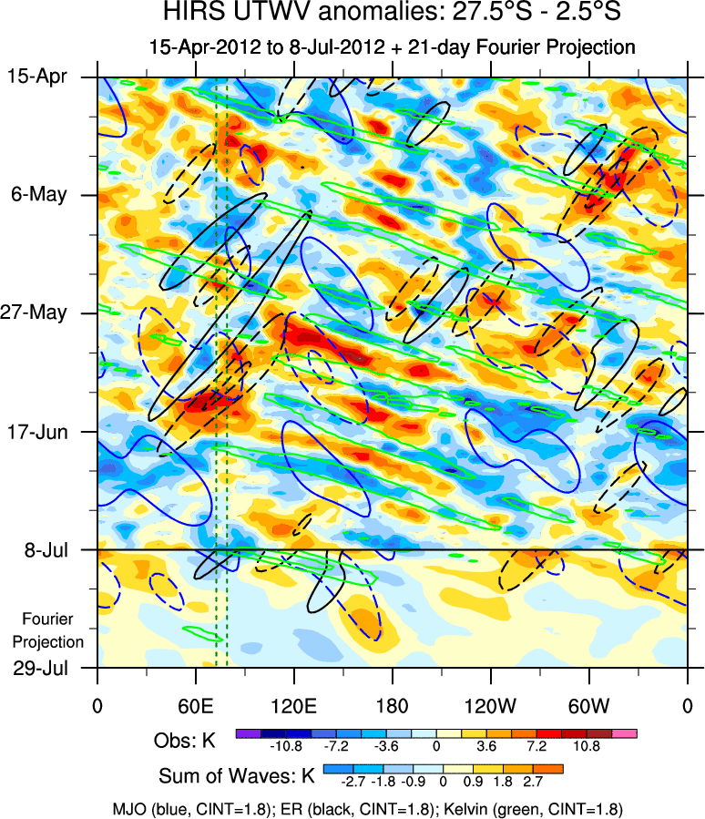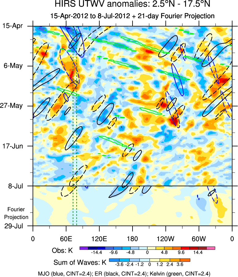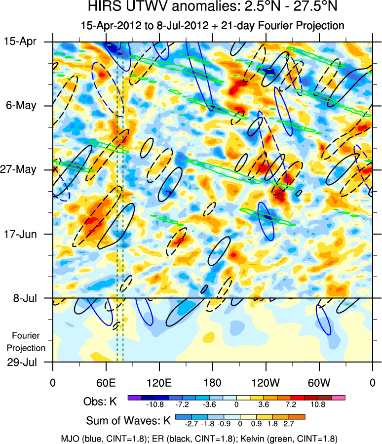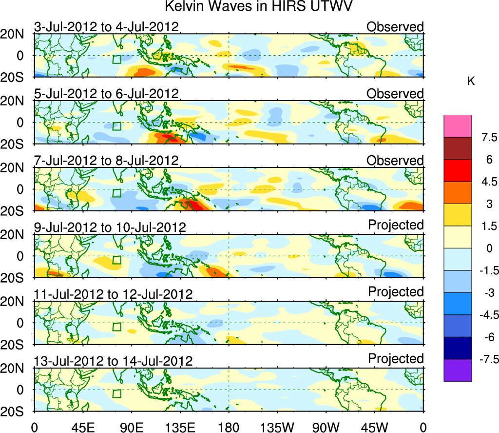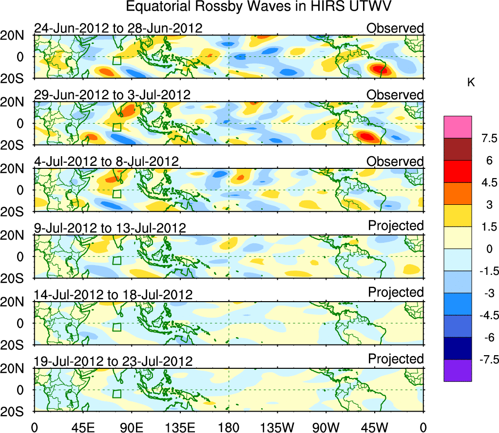 To identify tropical waves in near real-time, the OLR and UTWV data are filtered following Wheeler & Weickmann (2001 MWR). The daily anomalies are calculated using the first 3 harmonics of the seasonal cycle for 1979–2009. Missing values are then filled using linear interpolation in space and time. The most recent 365 days of anomalies are padded with 659 days of zeroes, and the result is filtered for each wave type.