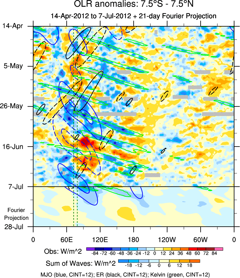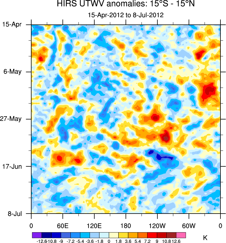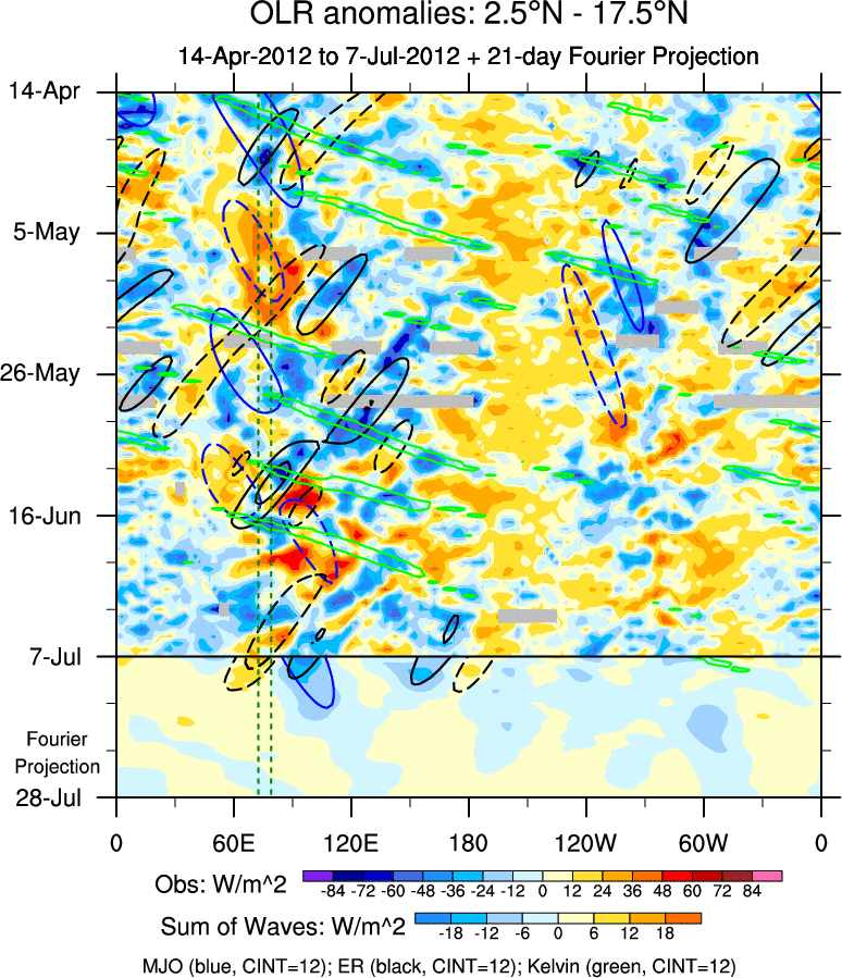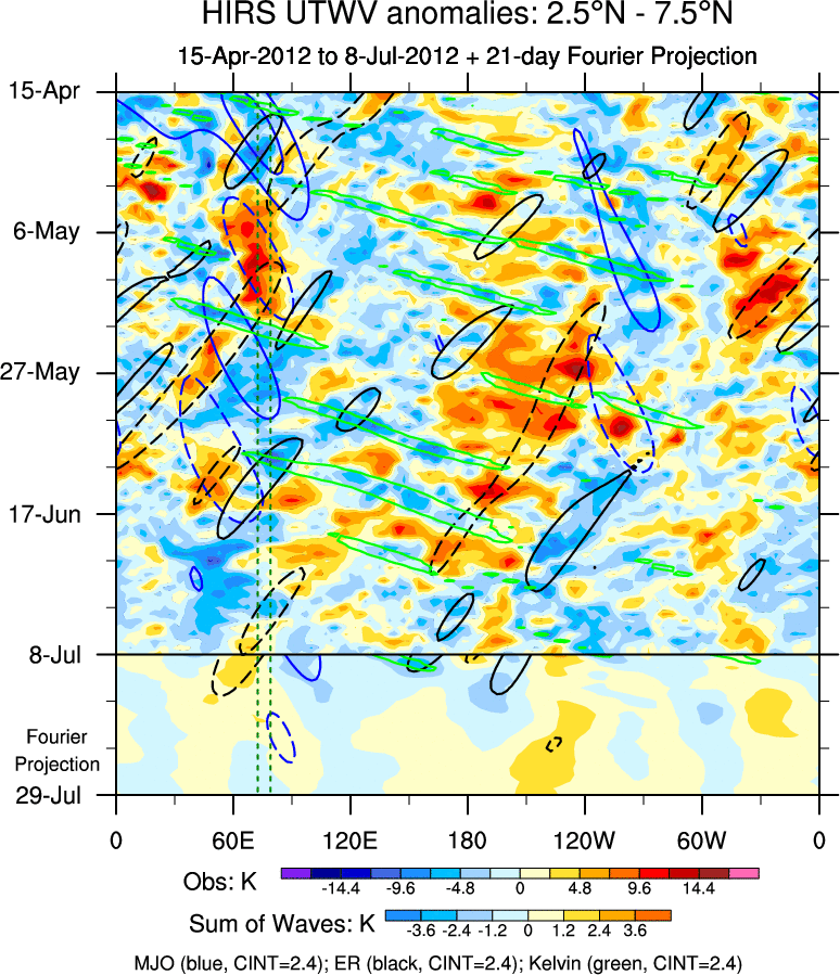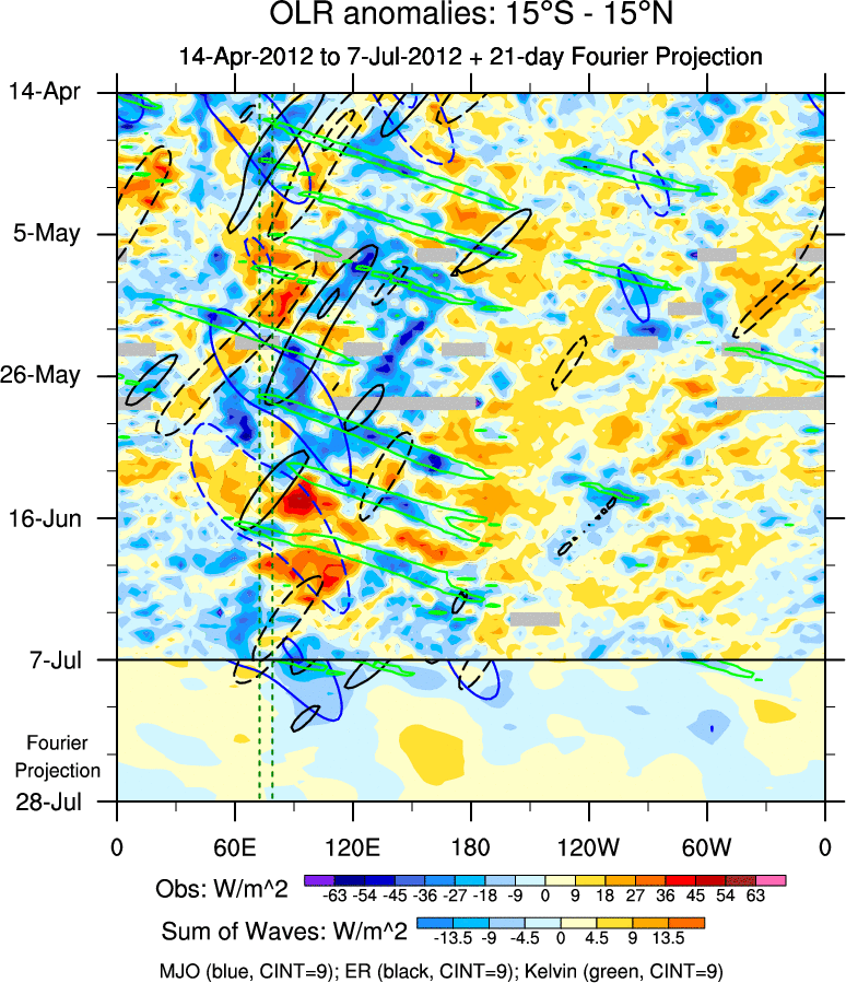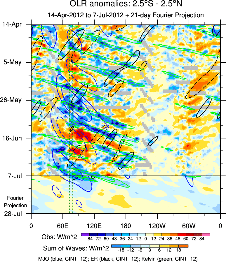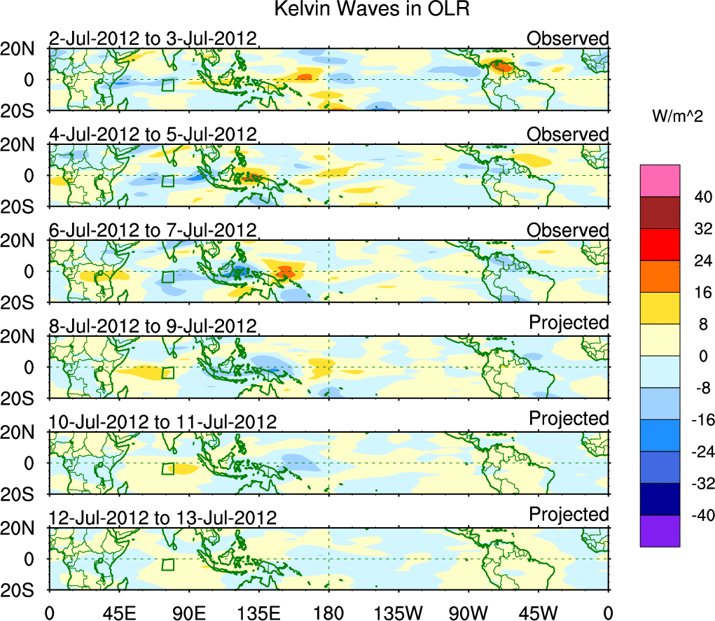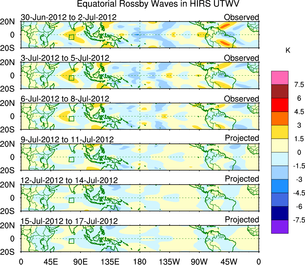 To identify tropical waves in near real-time, the OLR and UTWV data are filtered following Wheeler & Weickmann (2001 MWR). The daily anomalies are calculated using the first 3 harmonics of the seasonal cycle for 1979–2009. Missing values are then filled using linear interpolation in space and time. The most recent 365 days of anomalies are padded with 659 days of zeroes, and the result is filtered for each wave type.