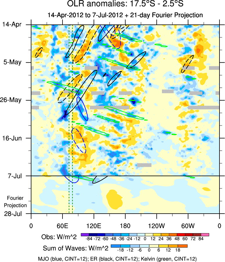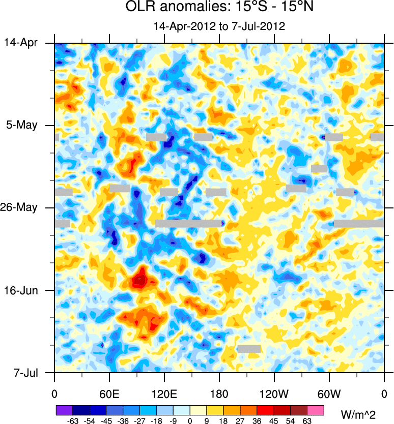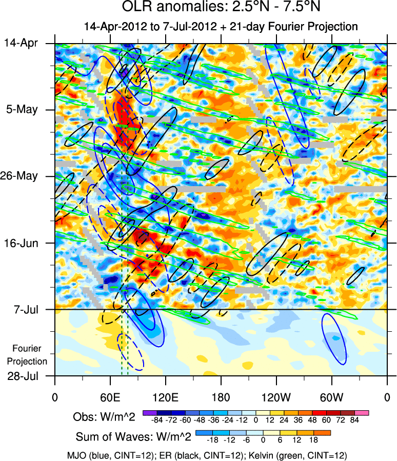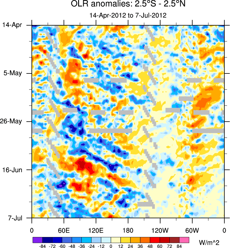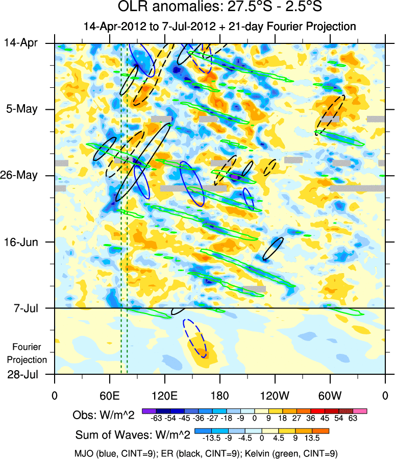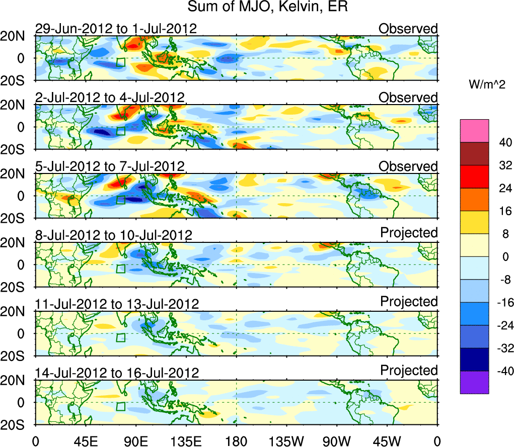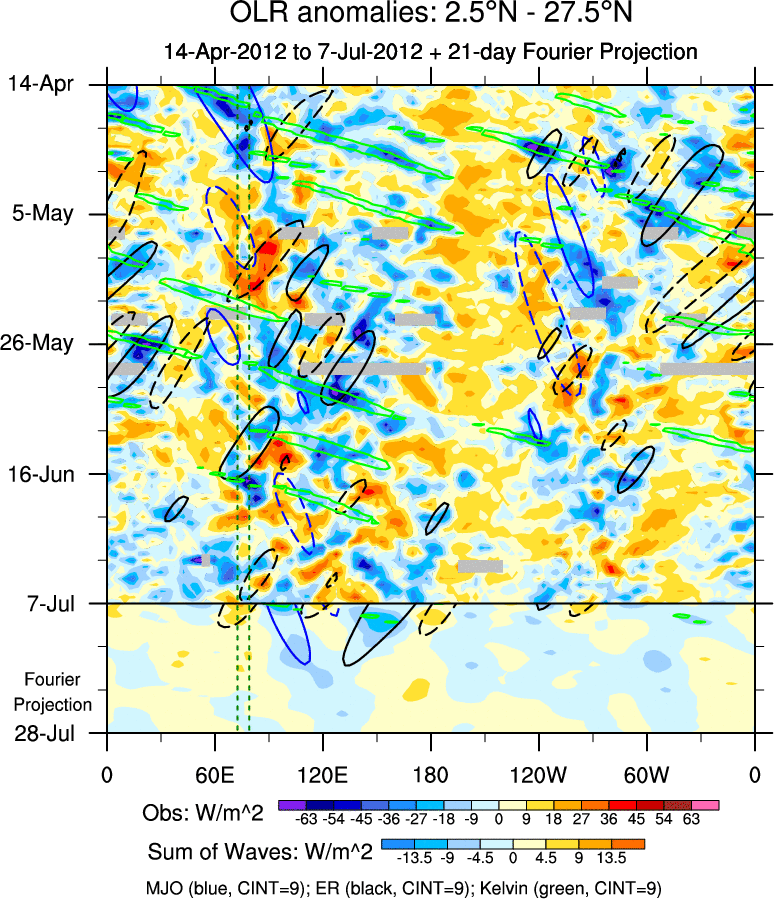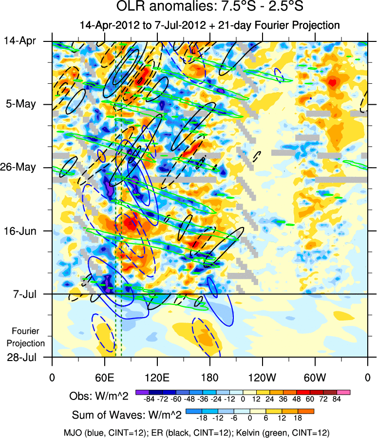 To identify tropical waves in near real-time, the OLR and UTWV data are filtered following Wheeler & Weickmann (2001 MWR). The daily anomalies are calculated using the first 3 harmonics of the seasonal cycle for 1979–2009. Missing values are then filled using linear interpolation in space and time. The most recent 365 days of anomalies are padded with 659 days of zeroes, and the result is filtered for each wave type.