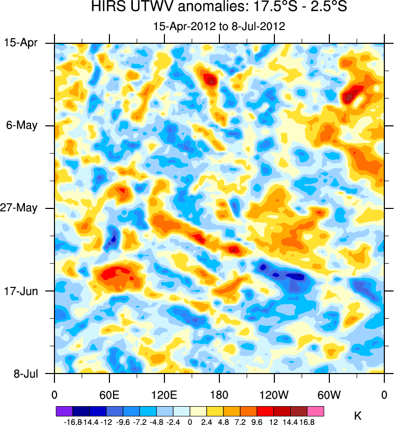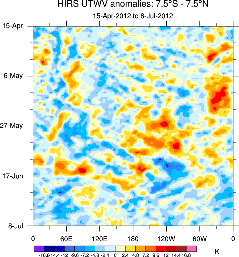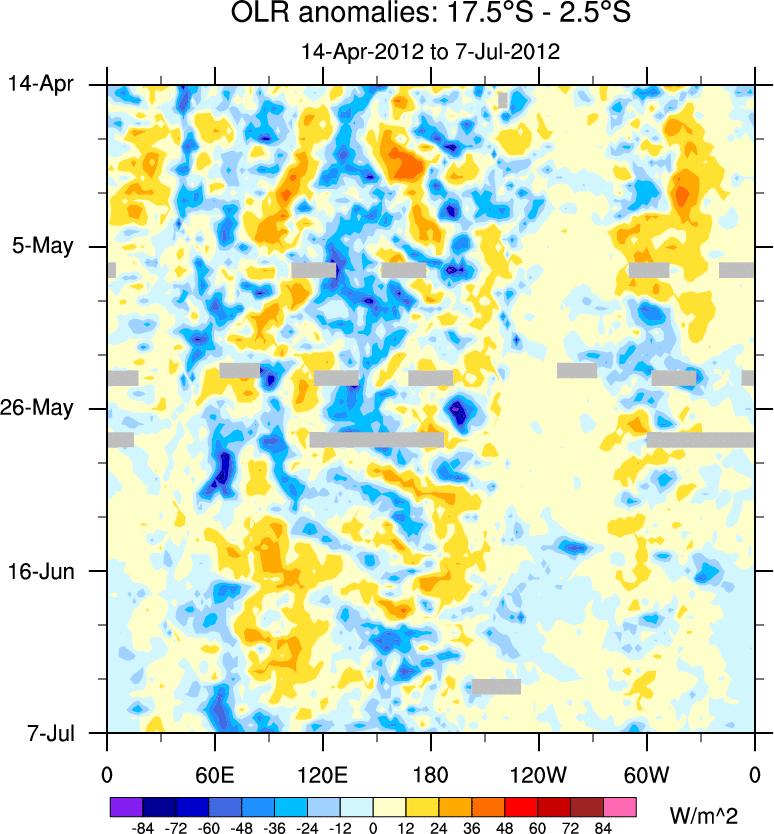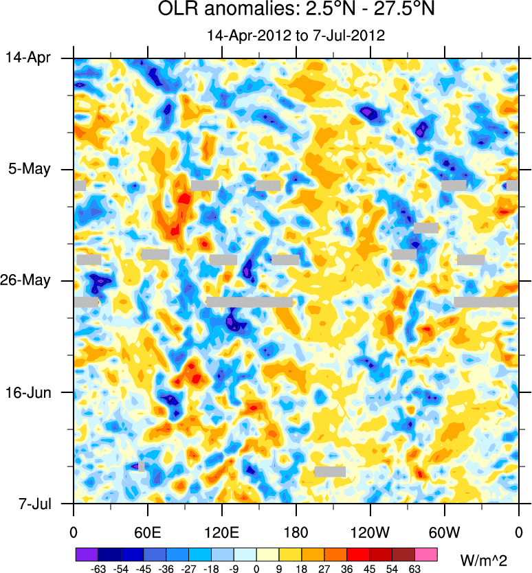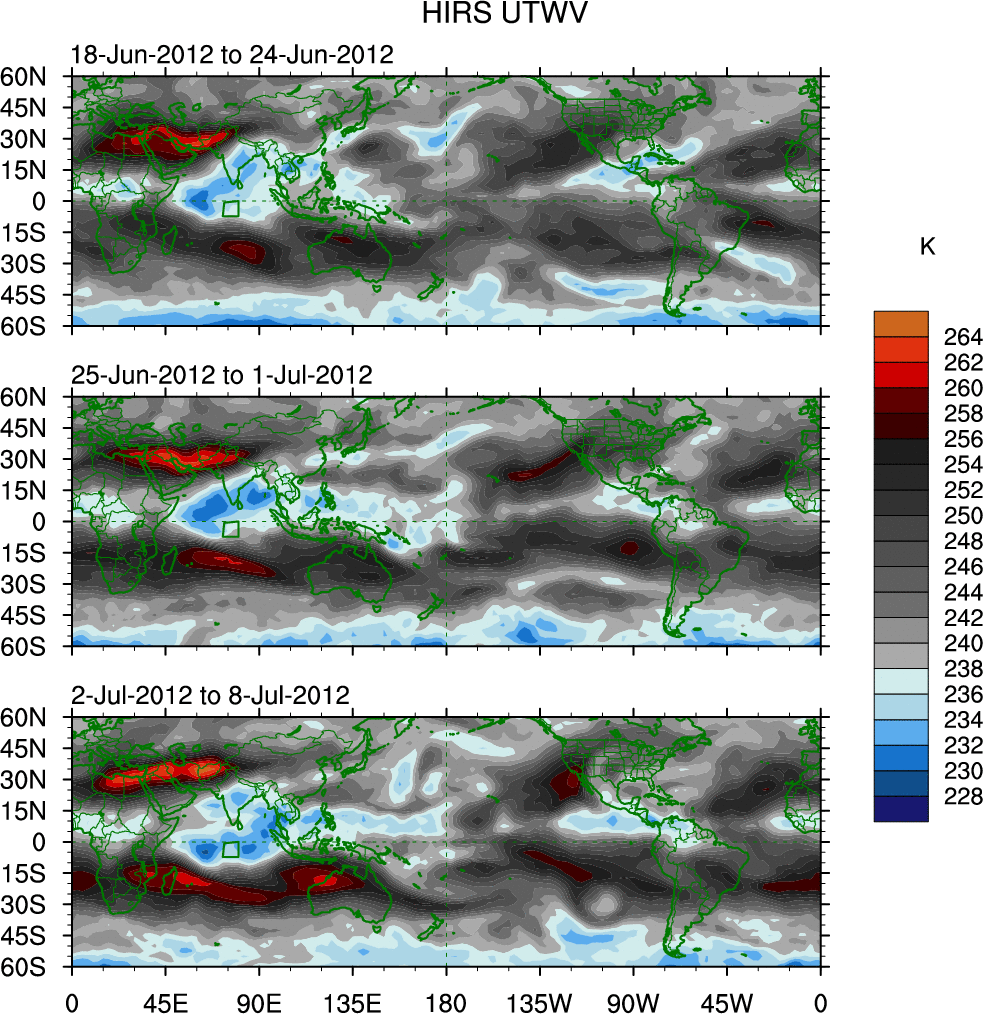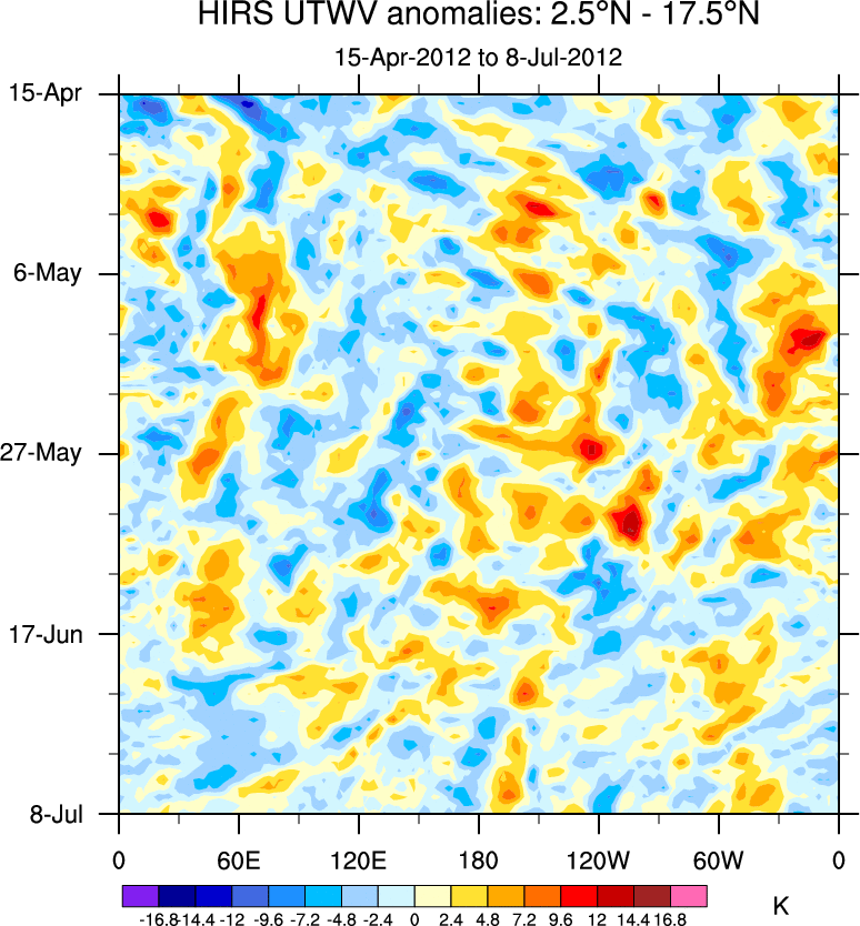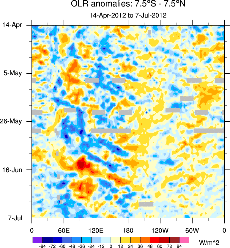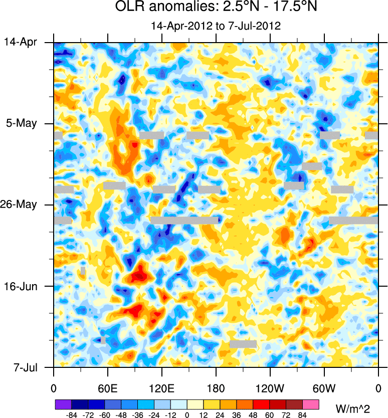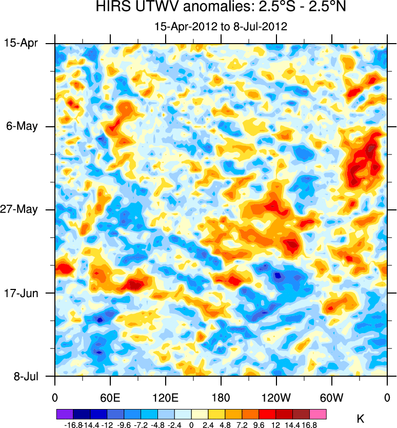 To identify tropical waves in near real-time, the OLR and UTWV data are filtered following Wheeler & Weickmann (2001 MWR). The daily anomalies are calculated using the first 3 harmonics of the seasonal cycle for 1979–2009. Missing values are then filled using linear interpolation in space and time. The most recent 365 days of anomalies are padded with 659 days of zeroes, and the result is filtered for each wave type.