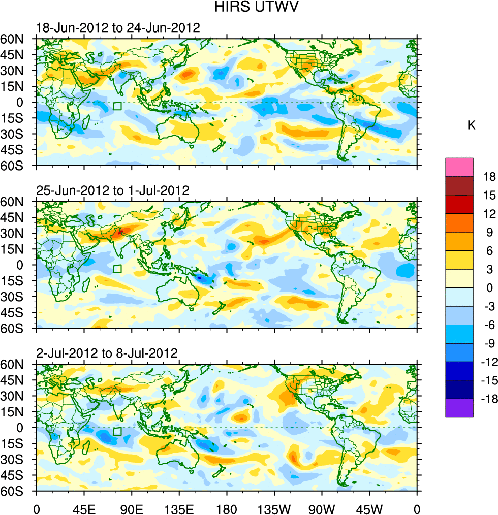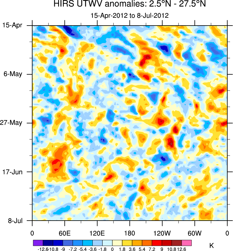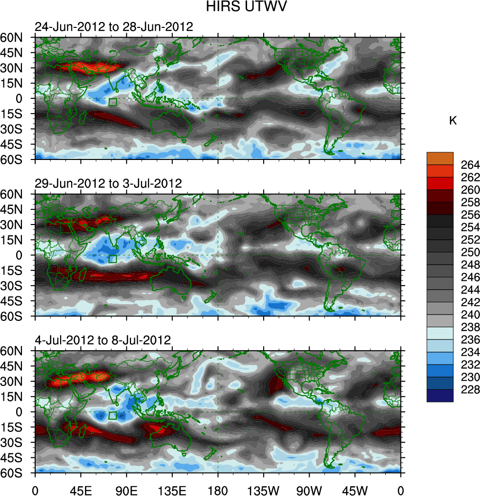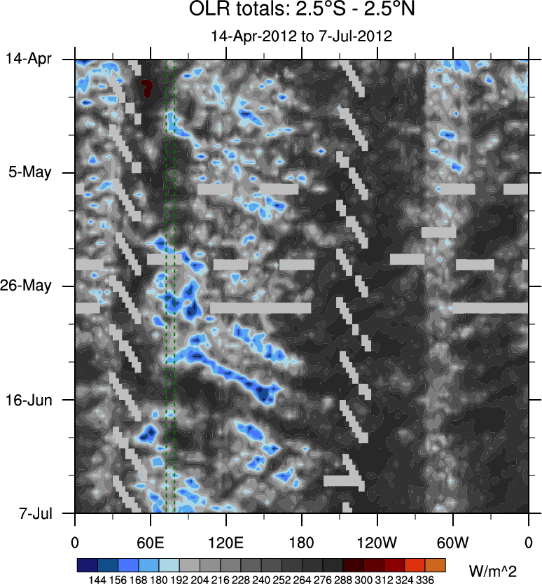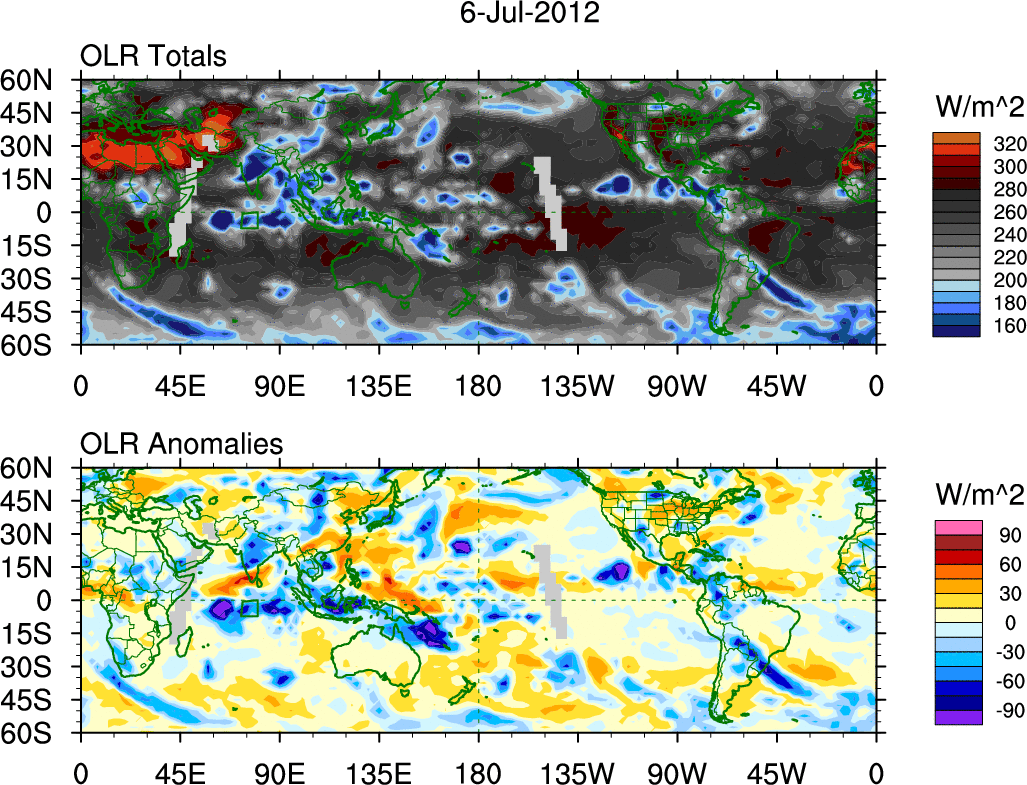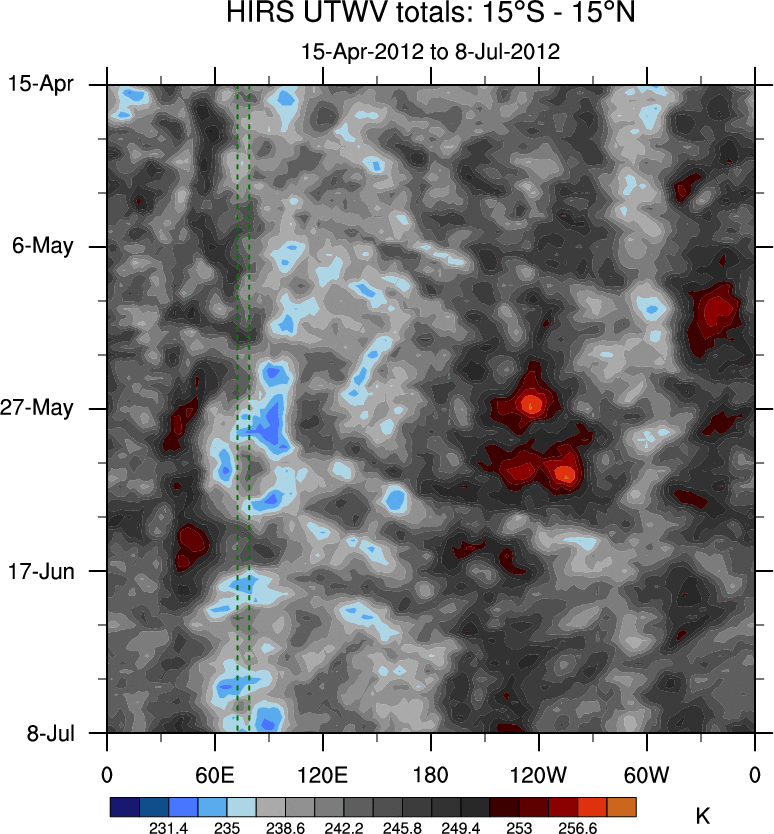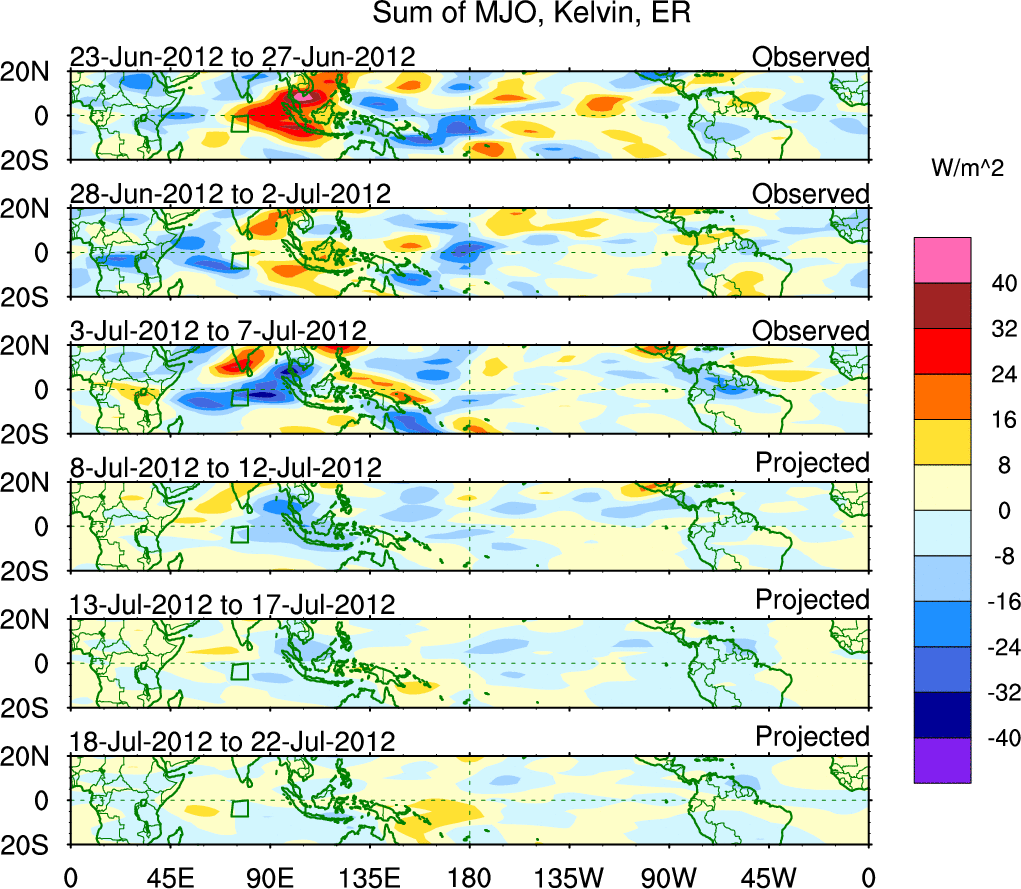To identify tropical waves in near real-time, the OLR and UTWV data are filtered following Wheeler & Weickmann (2001 MWR). The daily anomalies are calculated using the first 3 harmonics of the seasonal cycle for 1979–2009. Missing values are then filled using linear interpolation in space and time. The most recent 365 days of anomalies are padded with 659 days of zeroes, and the result is filtered for each wave type.