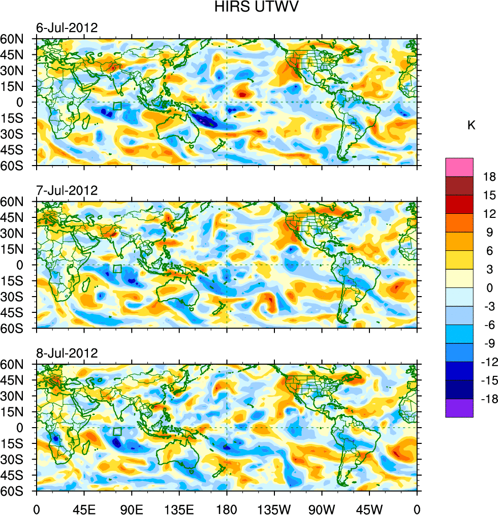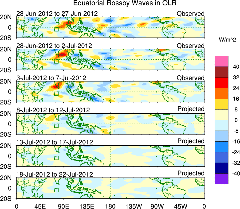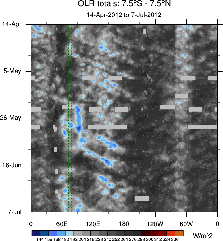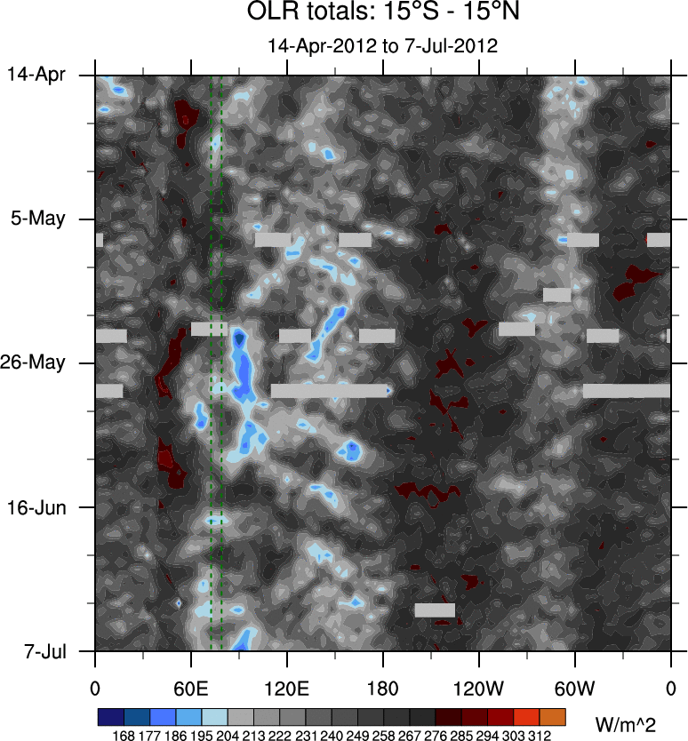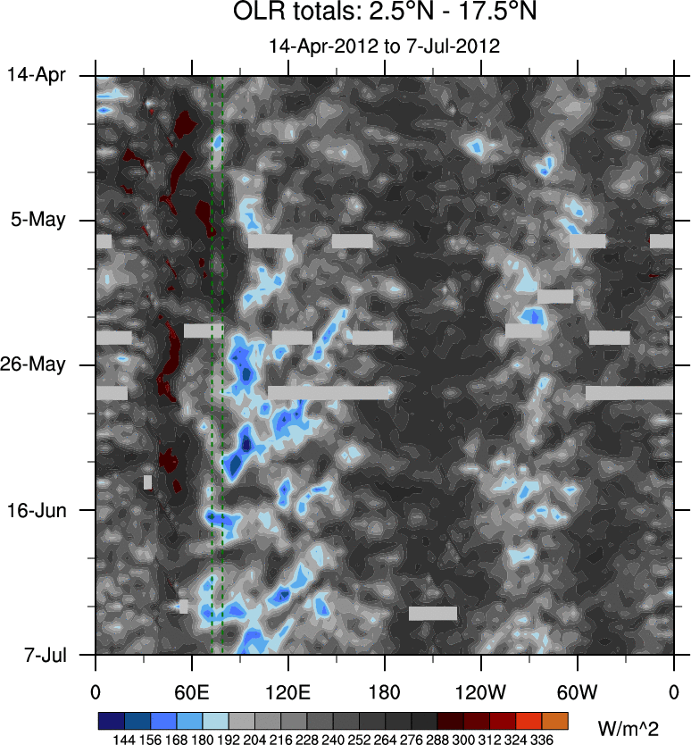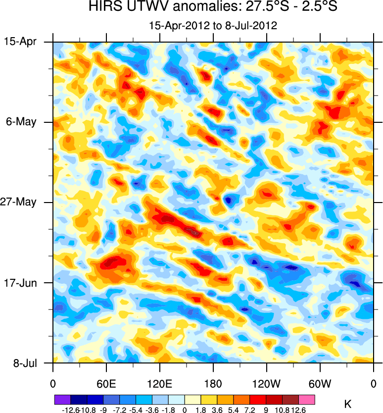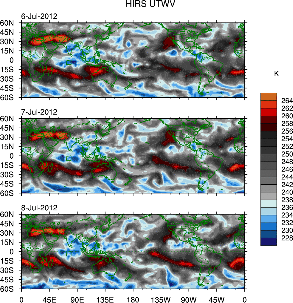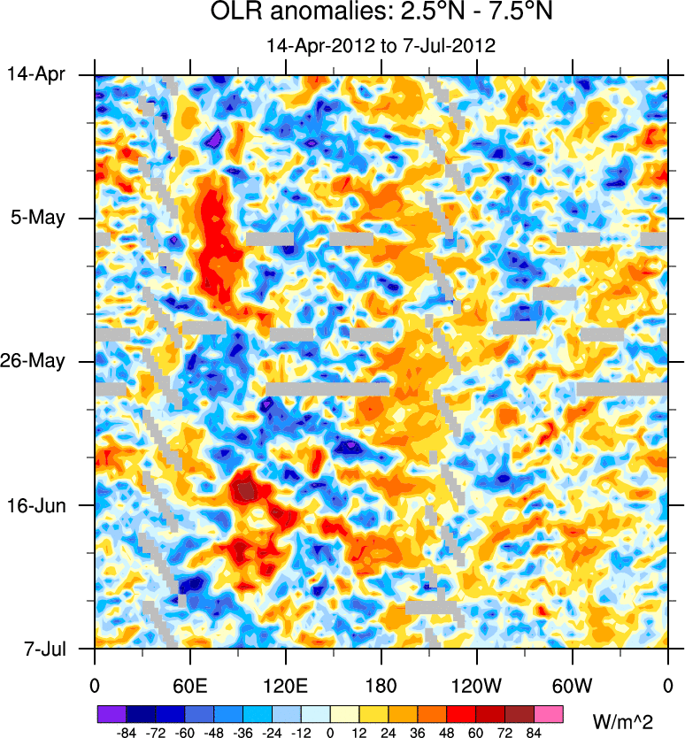 To identify tropical waves in near real-time, the OLR and UTWV data are filtered following Wheeler & Weickmann (2001 MWR). The daily anomalies are calculated using the first 3 harmonics of the seasonal cycle for 1979–2009. Missing values are then filled using linear interpolation in space and time. The most recent 365 days of anomalies are padded with 659 days of zeroes, and the result is filtered for each wave type.