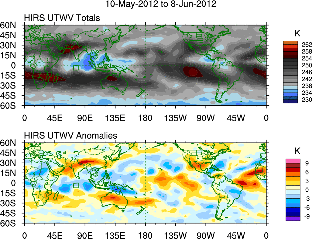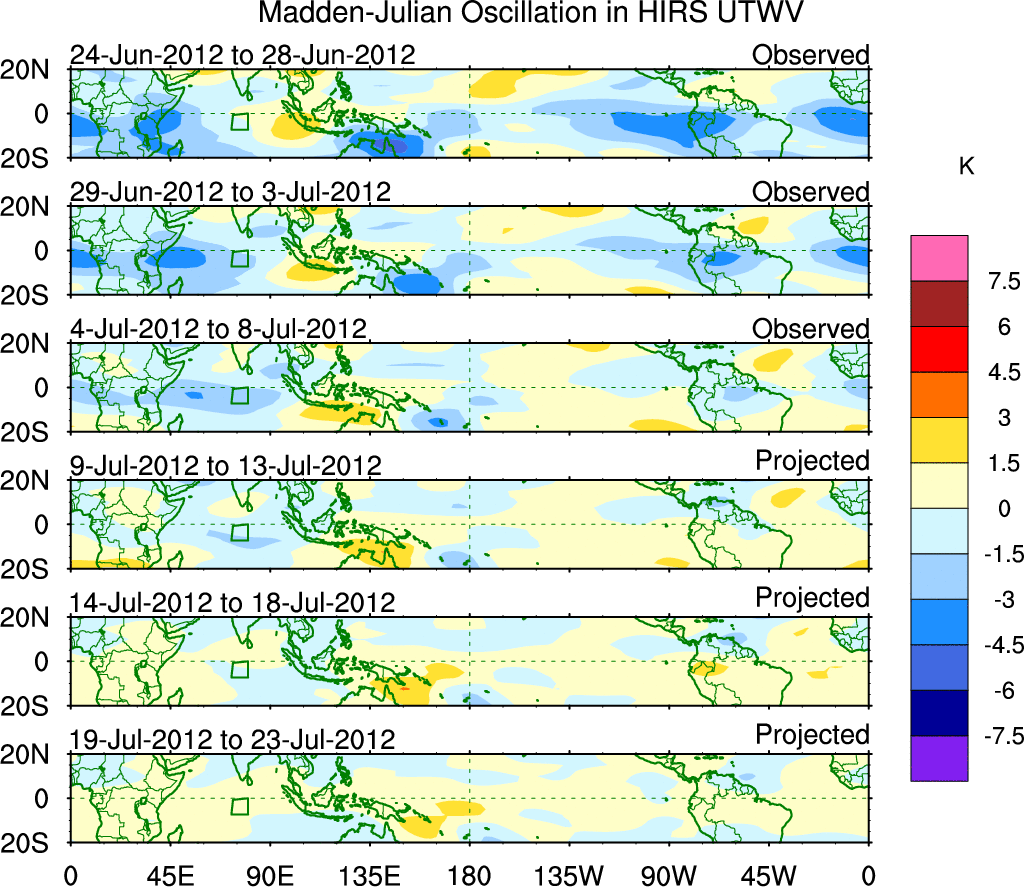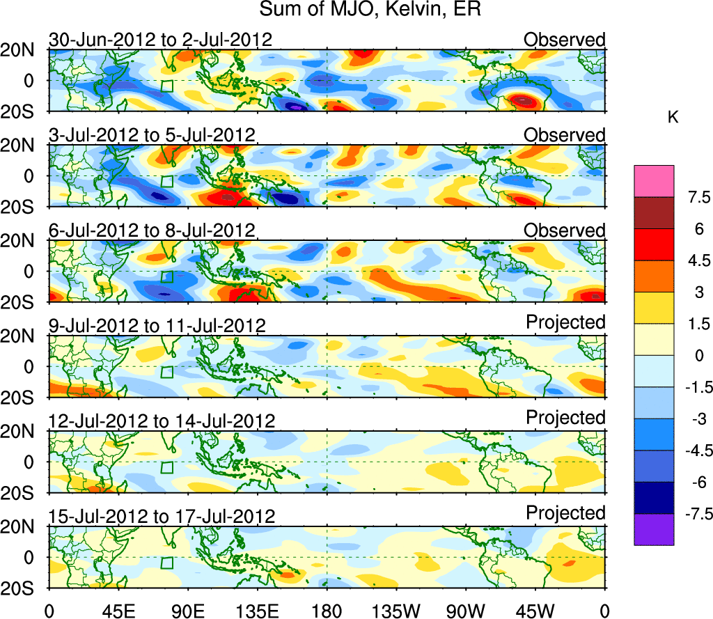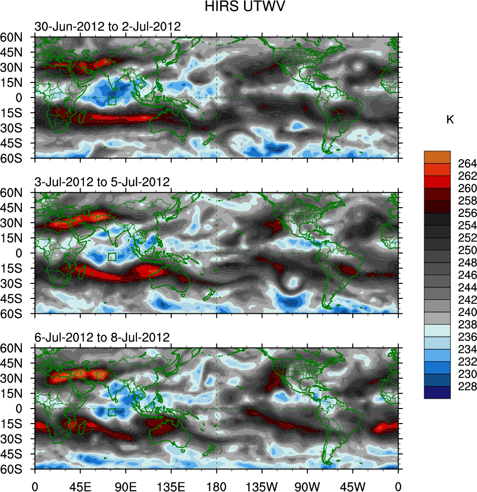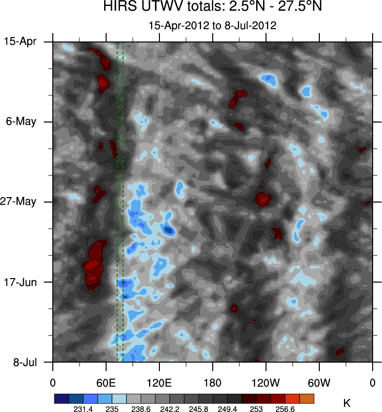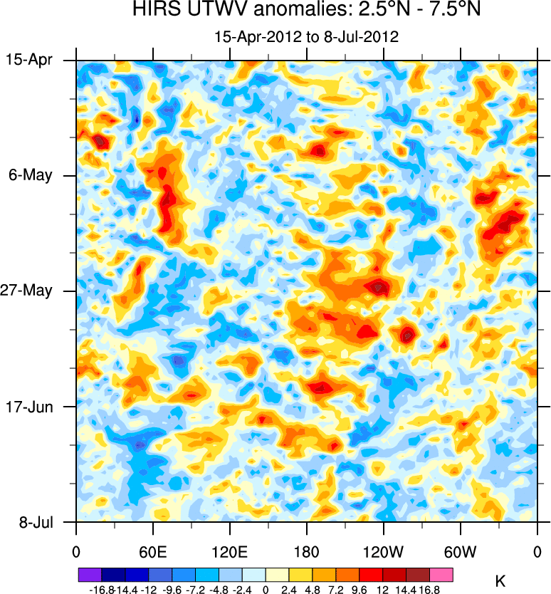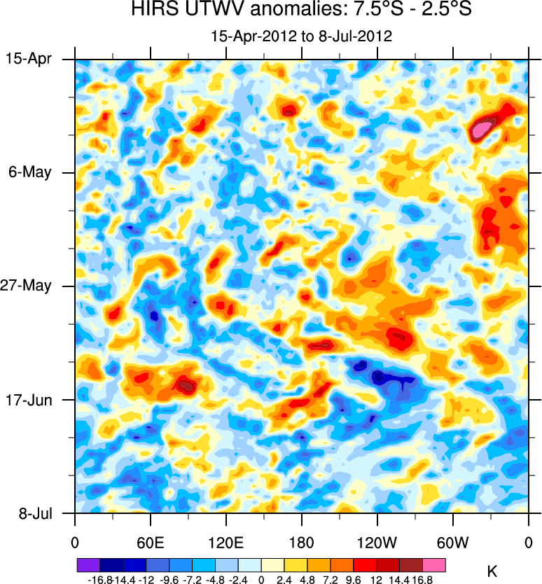 To identify tropical waves in near real-time, the OLR and UTWV data are filtered following Wheeler & Weickmann (2001 MWR). The daily anomalies are calculated using the first 3 harmonics of the seasonal cycle for 1979–2009. Missing values are then filled using linear interpolation in space and time. The most recent 365 days of anomalies are padded with 659 days of zeroes, and the result is filtered for each wave type.