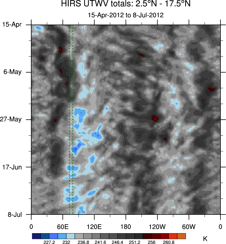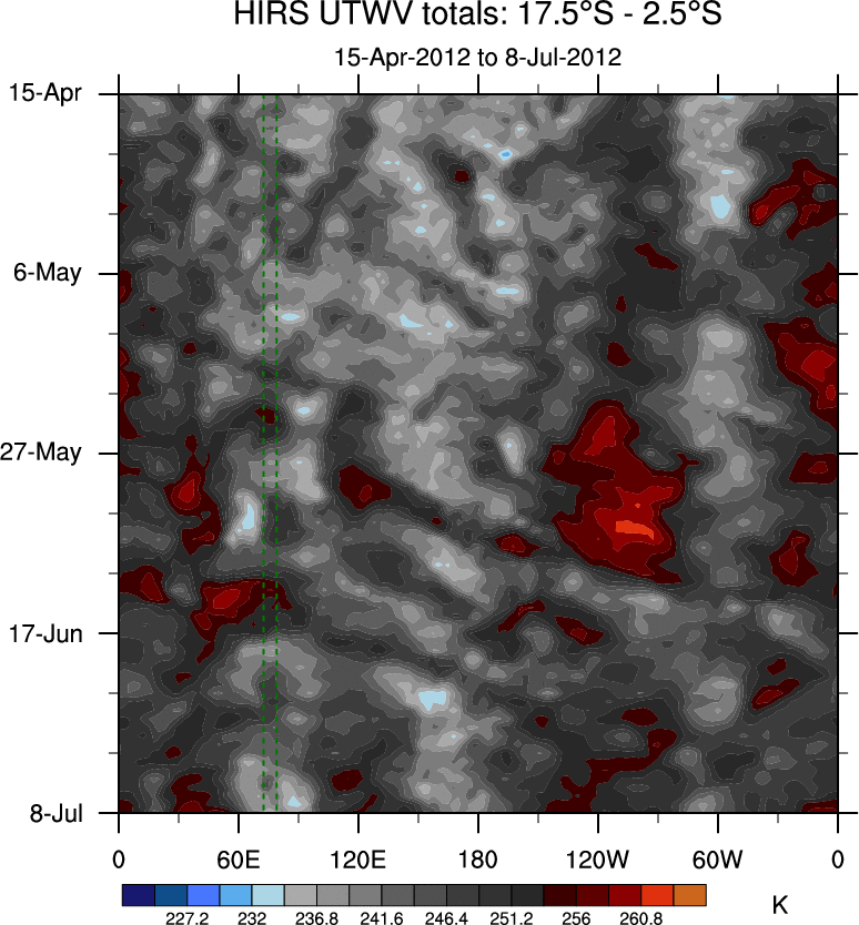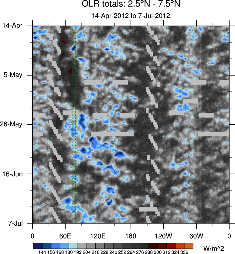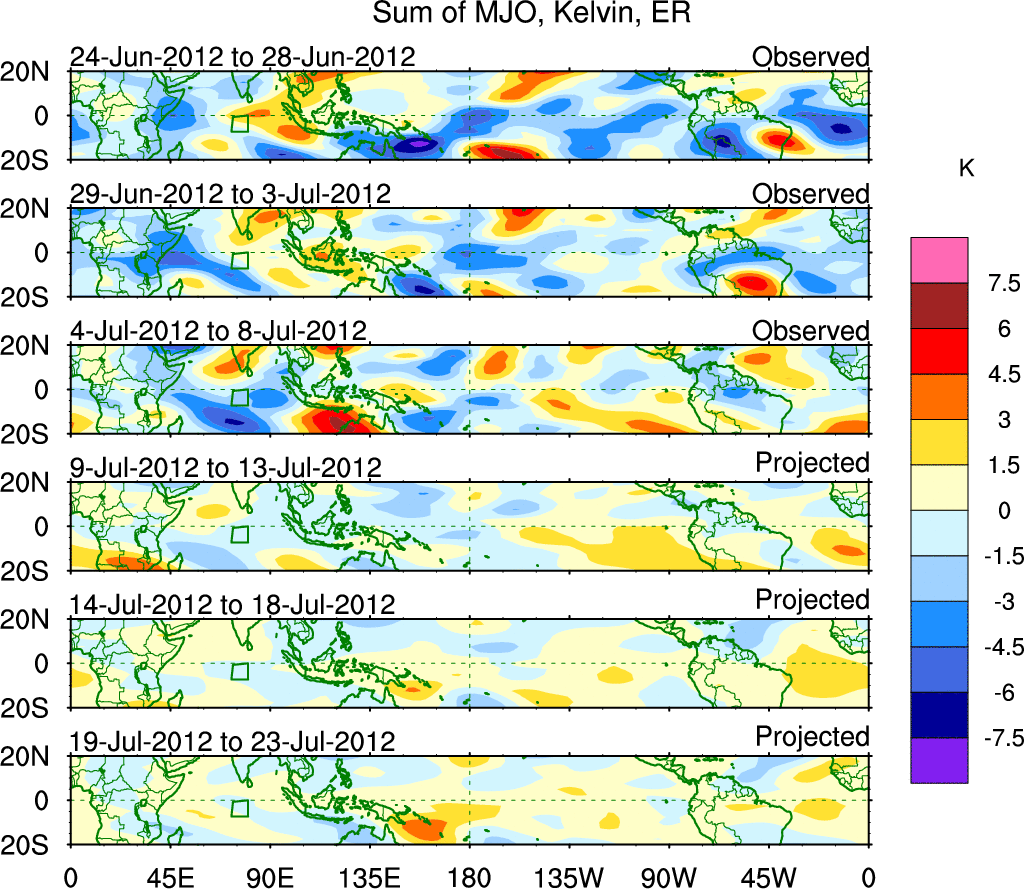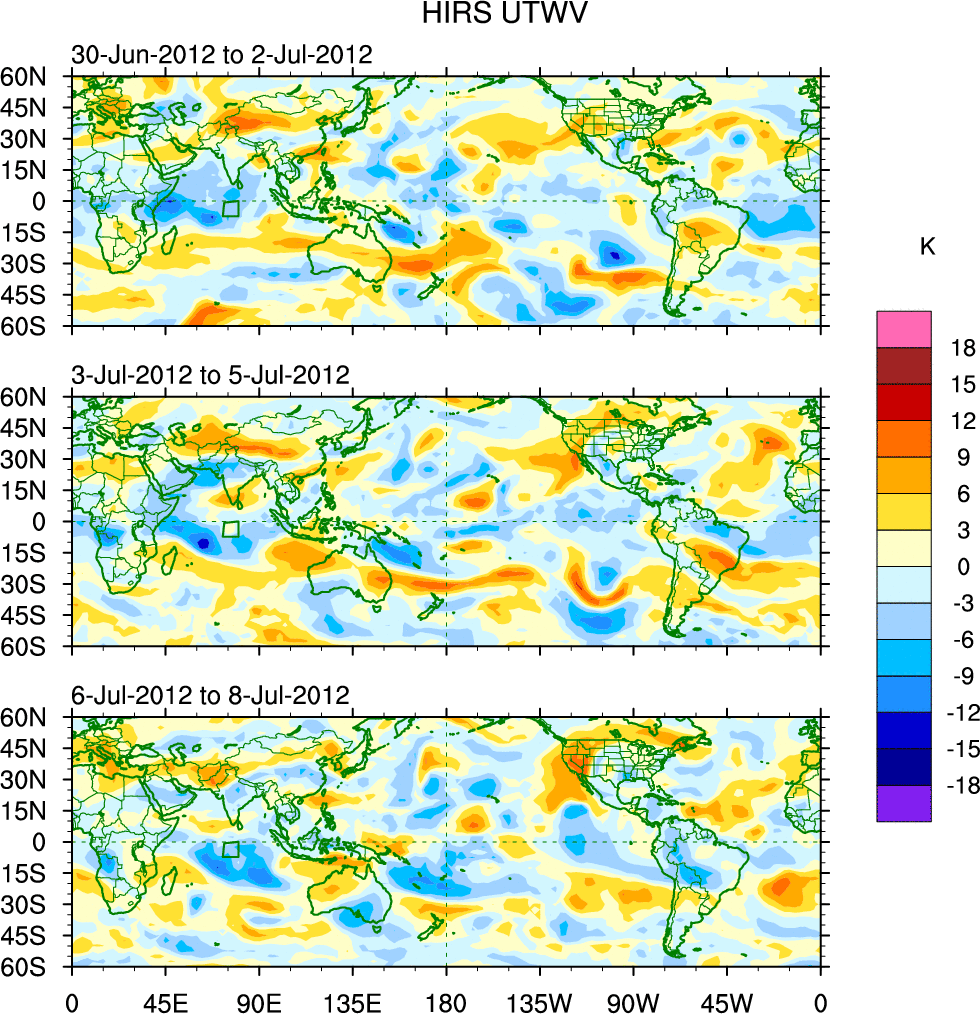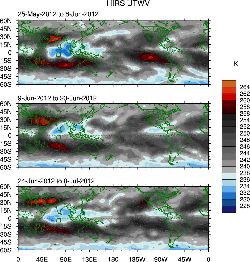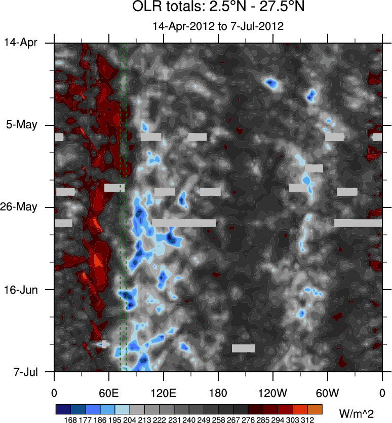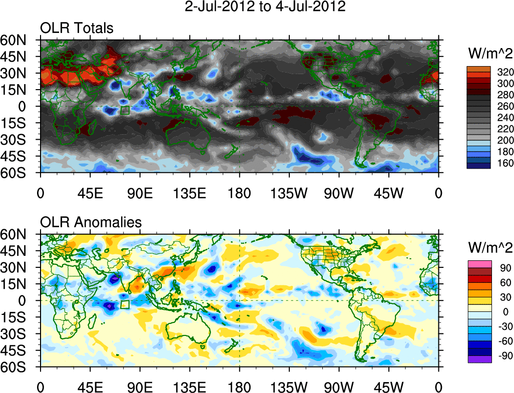 To identify tropical waves in near real-time, the OLR and UTWV data are filtered following Wheeler & Weickmann (2001 MWR). The daily anomalies are calculated using the first 3 harmonics of the seasonal cycle for 1979–2009. Missing values are then filled using linear interpolation in space and time. The most recent 365 days of anomalies are padded with 659 days of zeroes, and the result is filtered for each wave type.