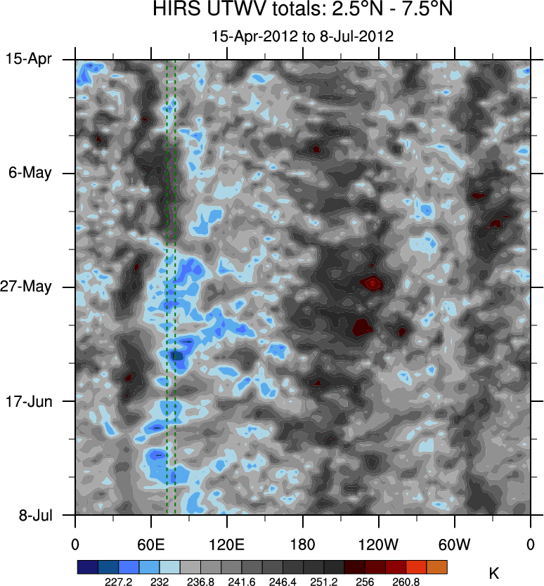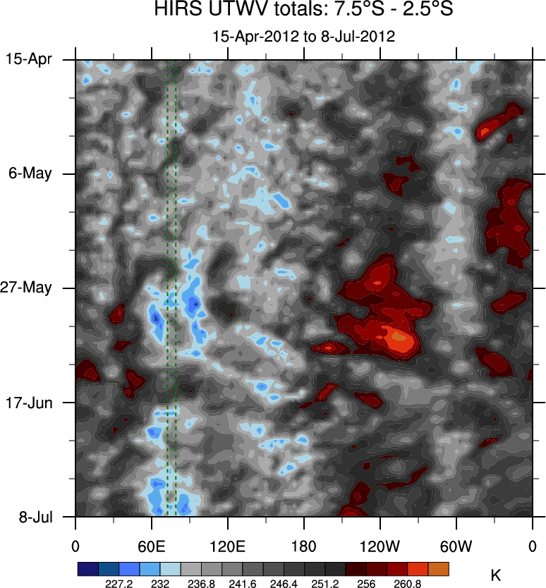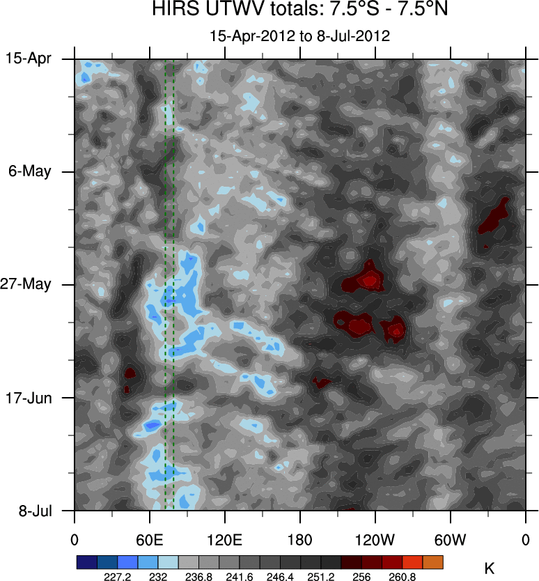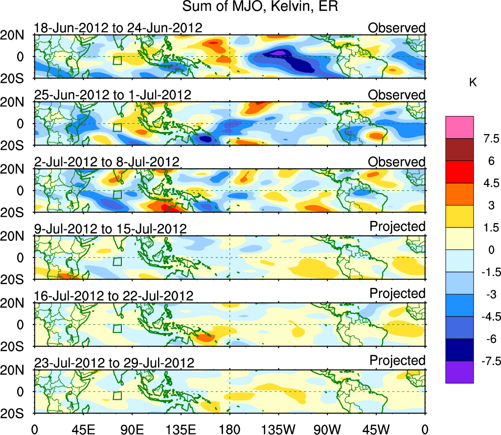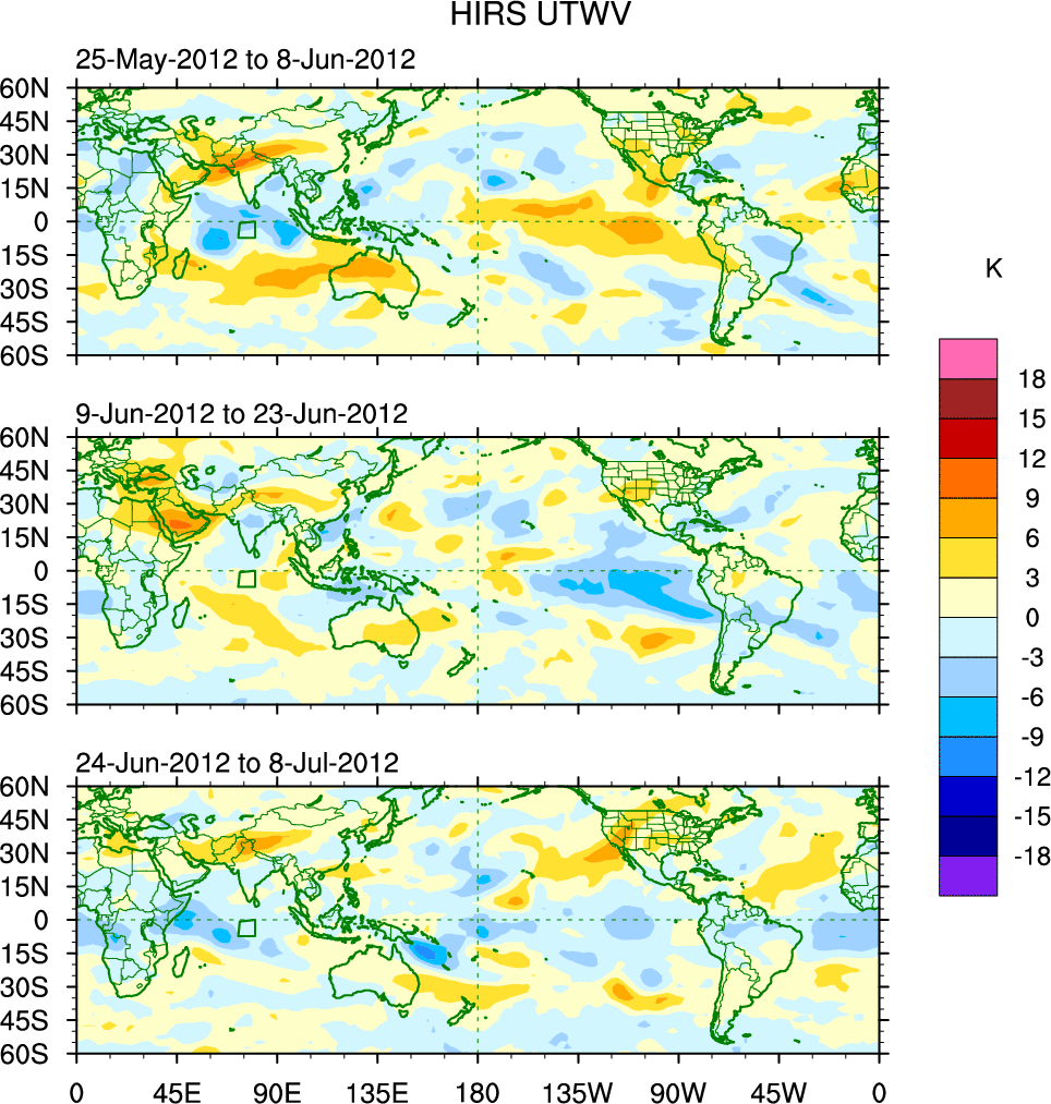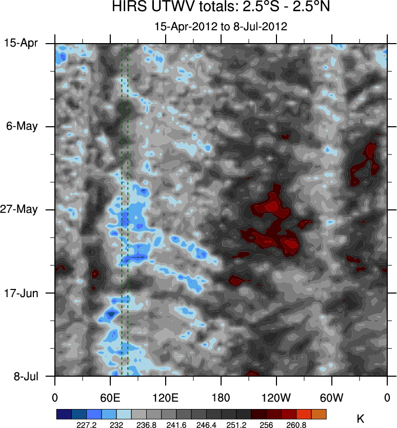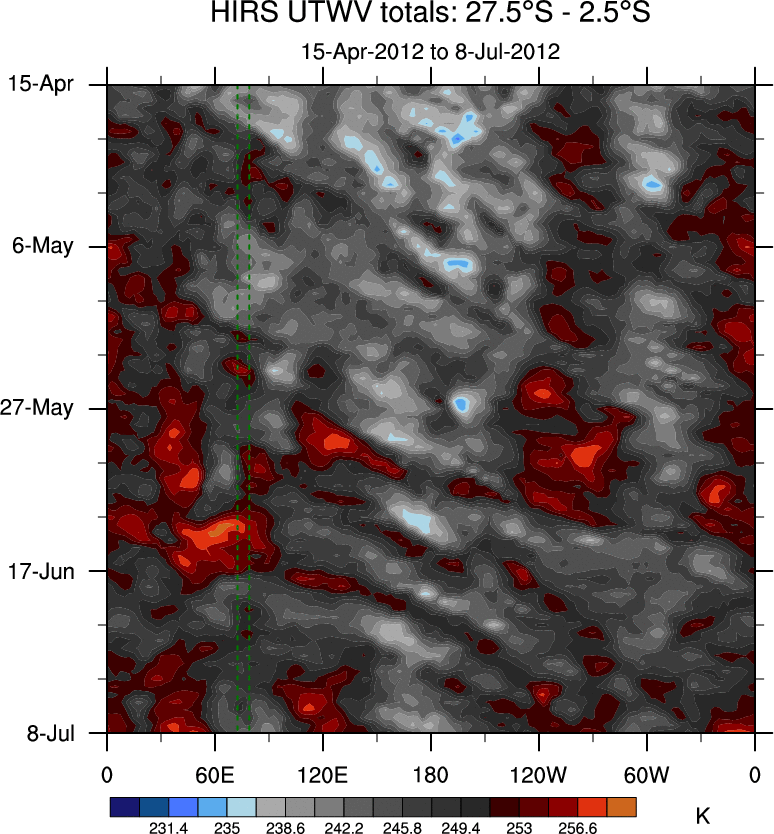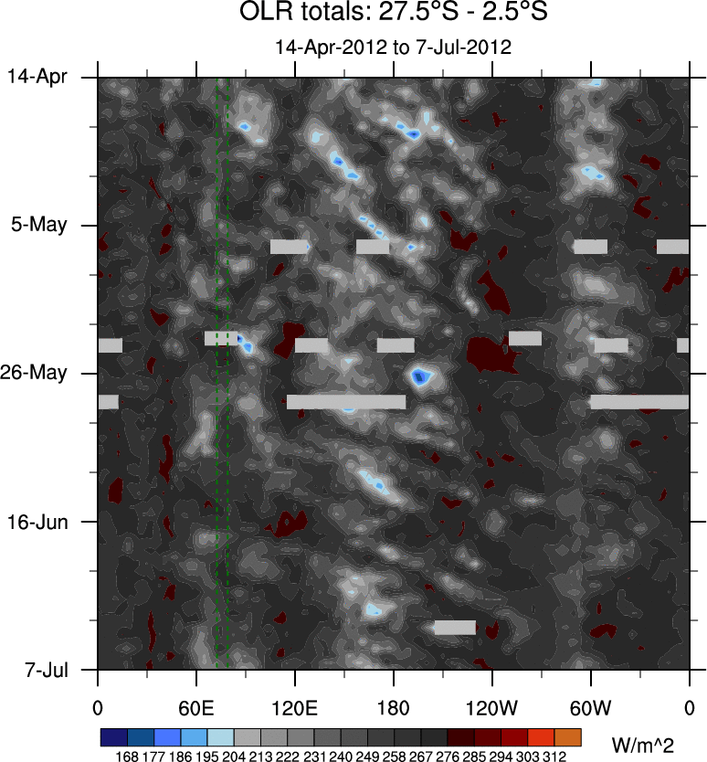 To identify tropical waves in near real-time, the OLR and UTWV data are filtered following Wheeler & Weickmann (2001 MWR). The daily anomalies are calculated using the first 3 harmonics of the seasonal cycle for 1979–2009. Missing values are then filled using linear interpolation in space and time. The most recent 365 days of anomalies are padded with 659 days of zeroes, and the result is filtered for each wave type.