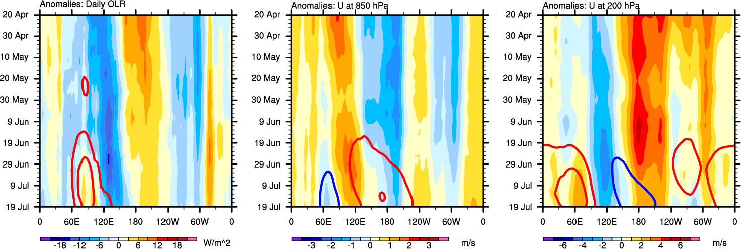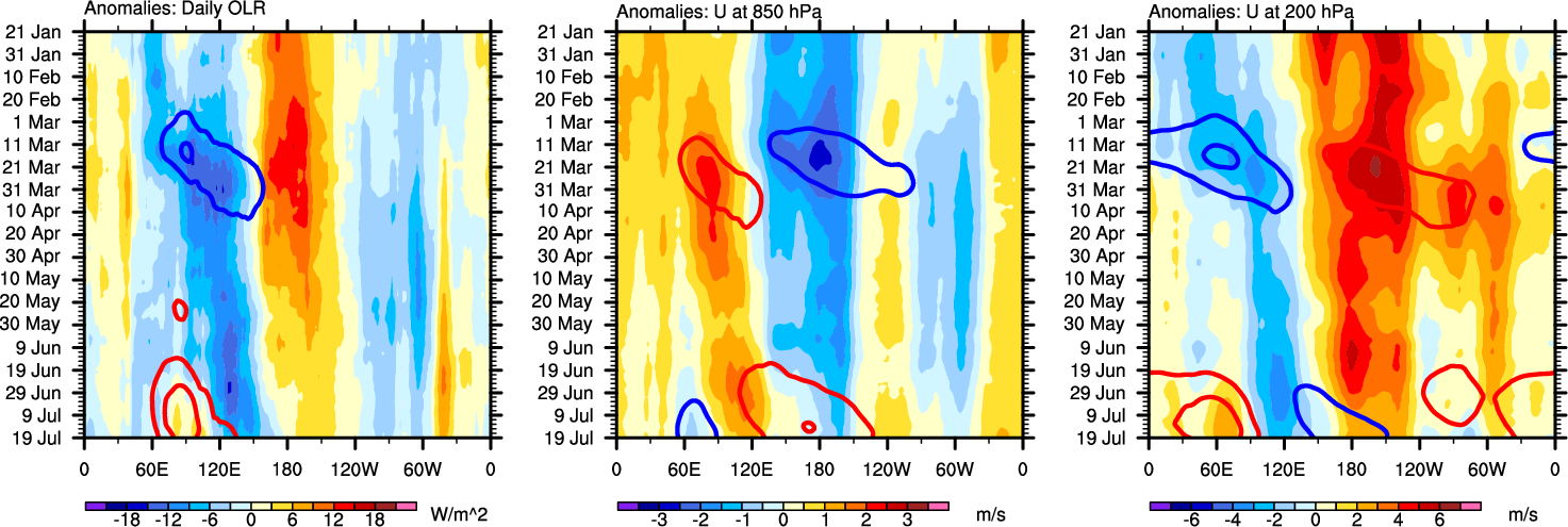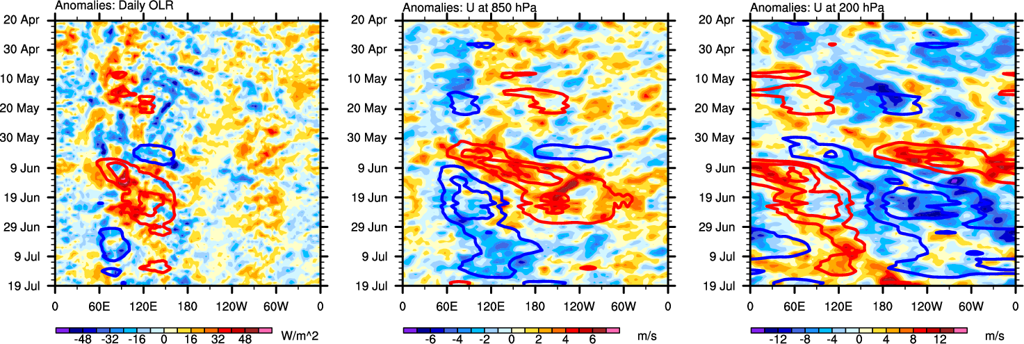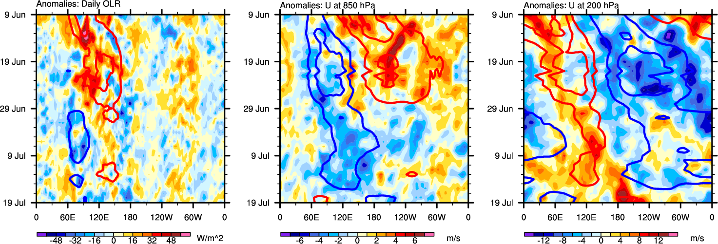The Hovmollers show longitude-time plots for OLR, U-850, and U-200. The shading indicates the observed anomalies, while the contours are the projection of those anomalies onto the RMM EOFs.