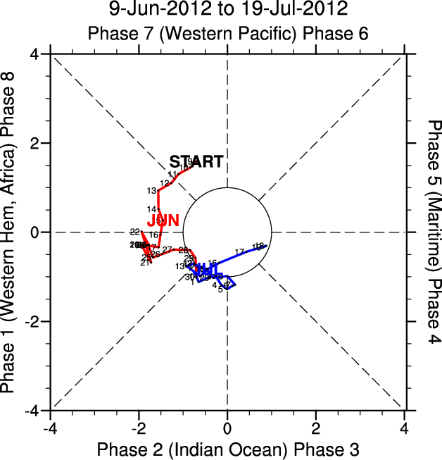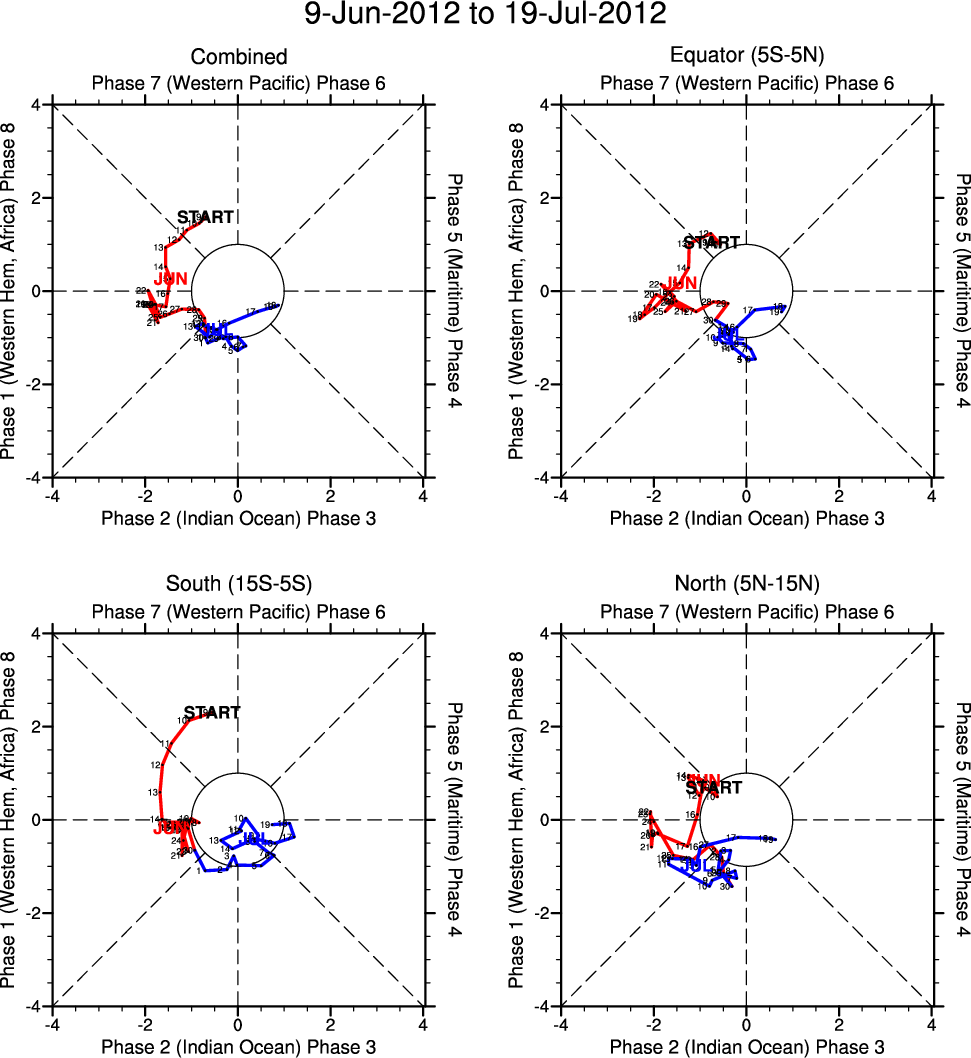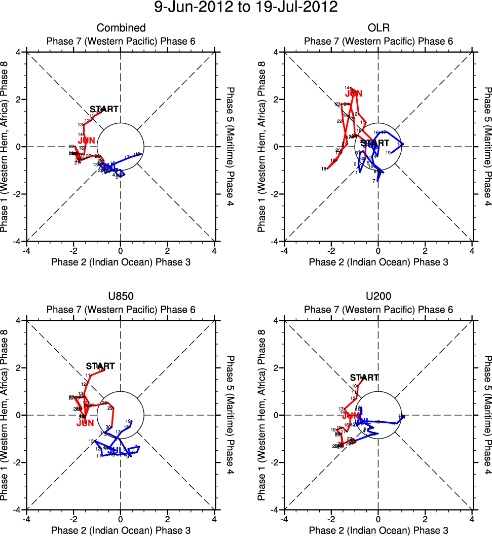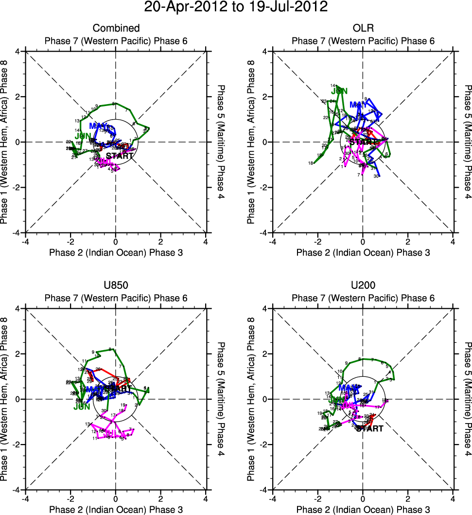Wheeler and Hendon (2004) constructed the RMM index for monitoring the MJO. This index consists of the first two principal components (PCs) of OLR, 850-hPa zonal wind, and 200-hPa zonal wind averaged 15S-15N.