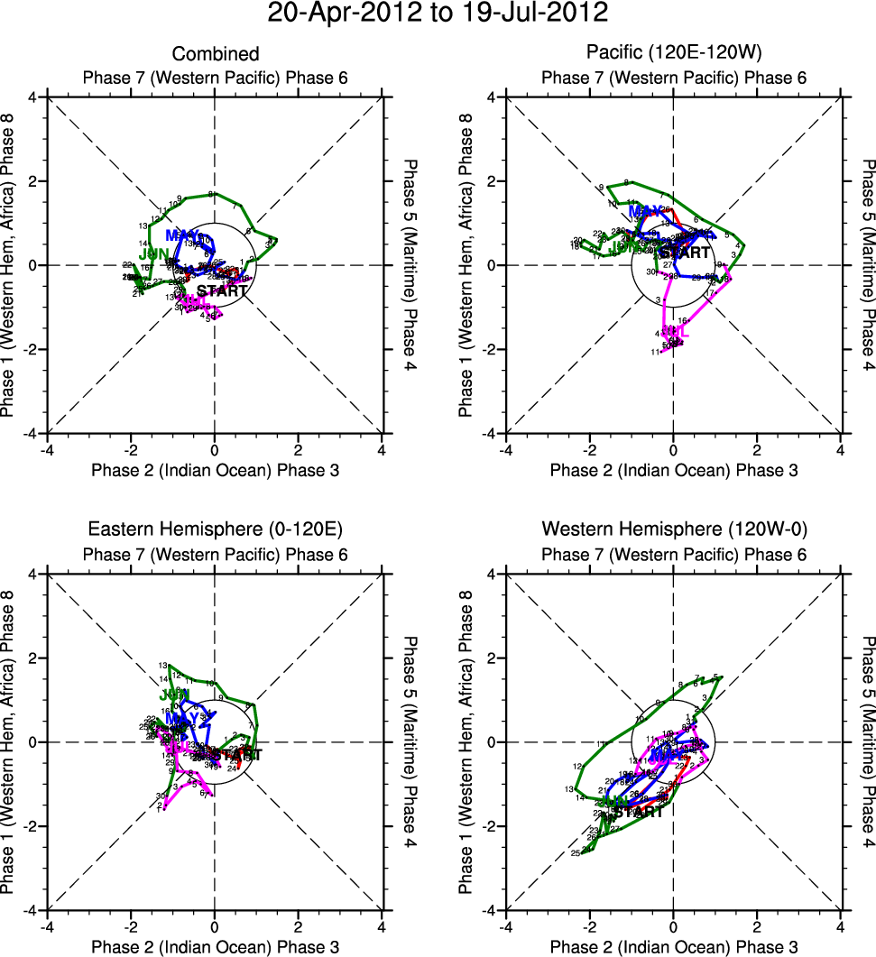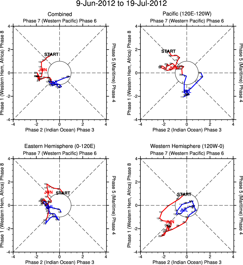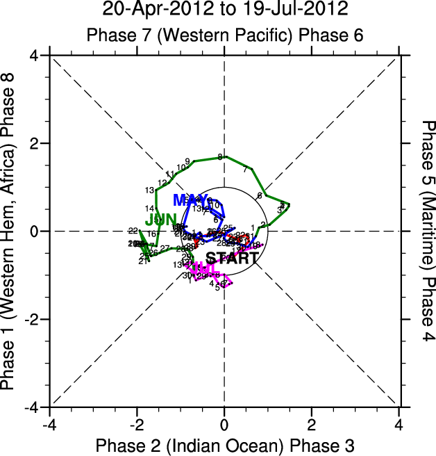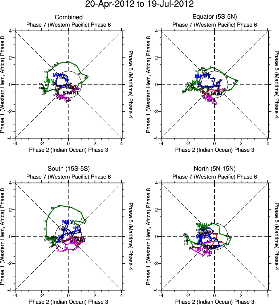 Wheeler and Hendon (2004) constructed the RMM index for monitoring the MJO. This index consists of the first two principal components (PCs) of OLR, 850-hPa zonal wind, and 200-hPa zonal wind averaged 15S-15N.