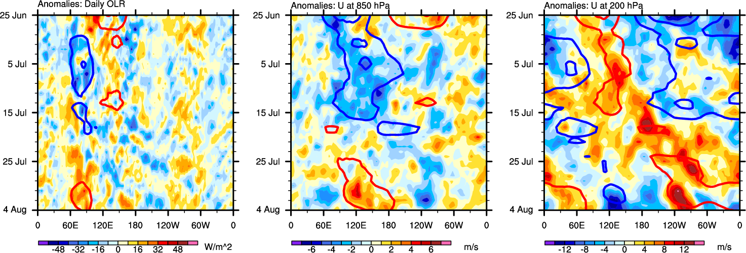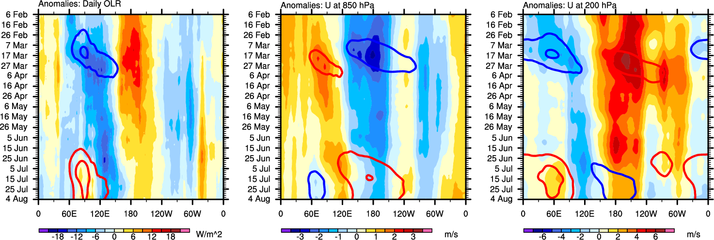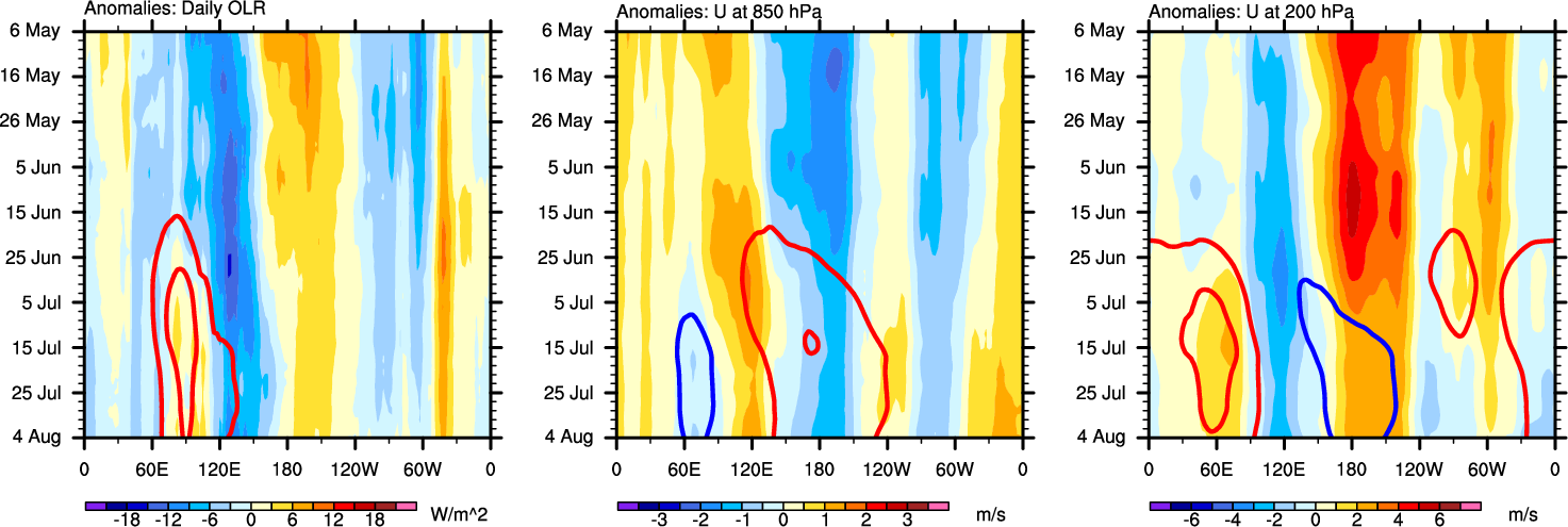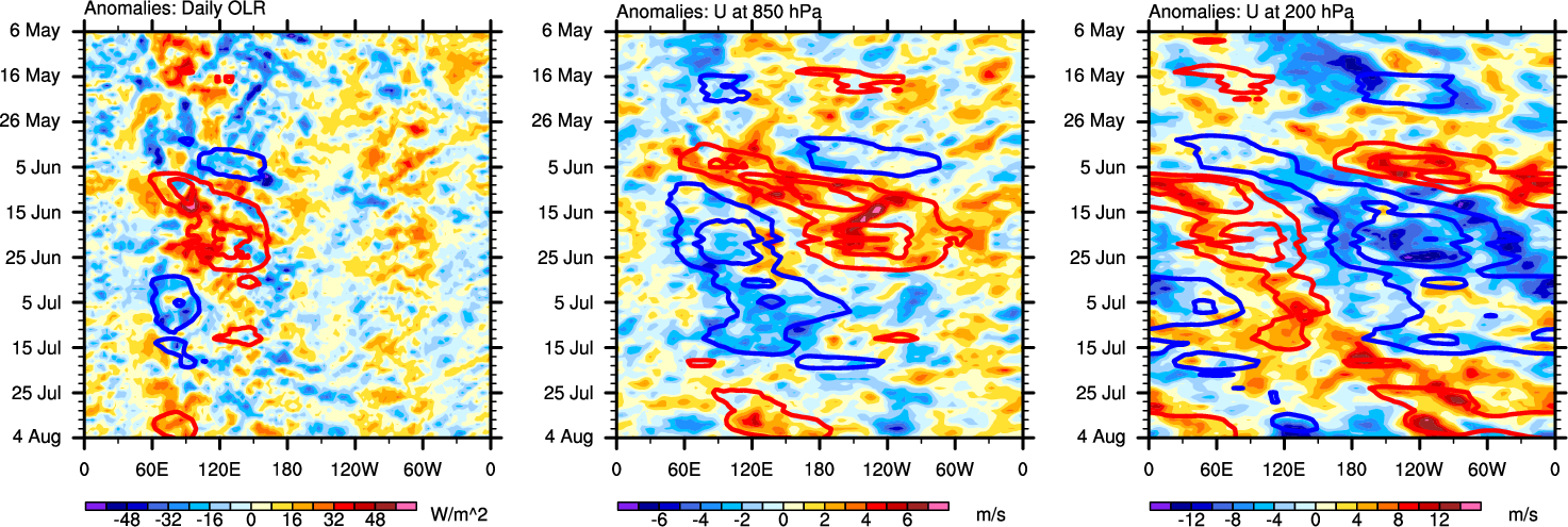 The Hovmollers show longitude-time plots for OLR, U-850, and U-200. The shading indicates the observed anomalies, while the contours are the projection of those anomalies onto the RMM EOFs.