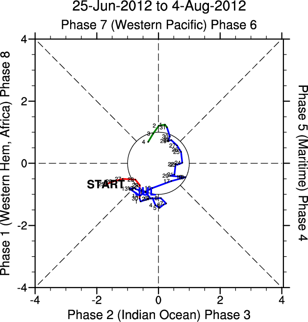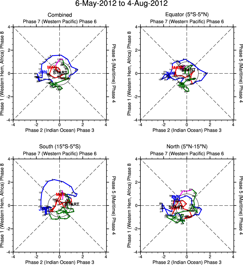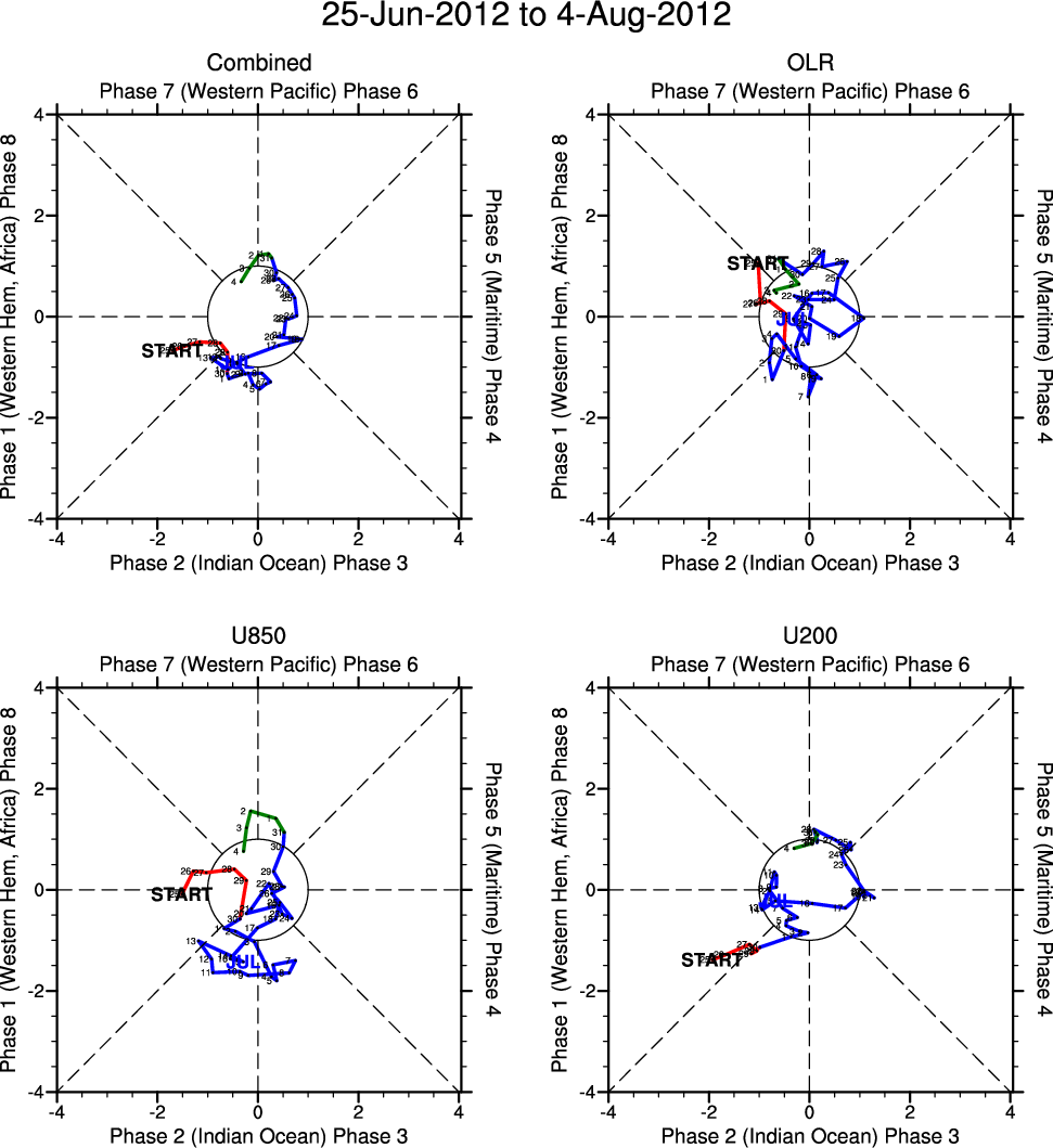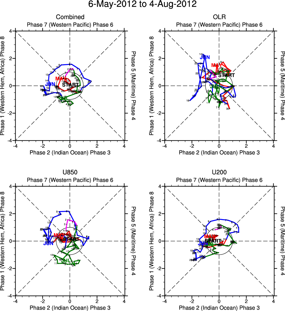 Wheeler and Hendon (2004) constructed the RMM index for monitoring the MJO. This index consists of the first two principal components (PCs) of OLR, 850-hPa zonal wind, and 200-hPa zonal wind averaged 15S-15N.