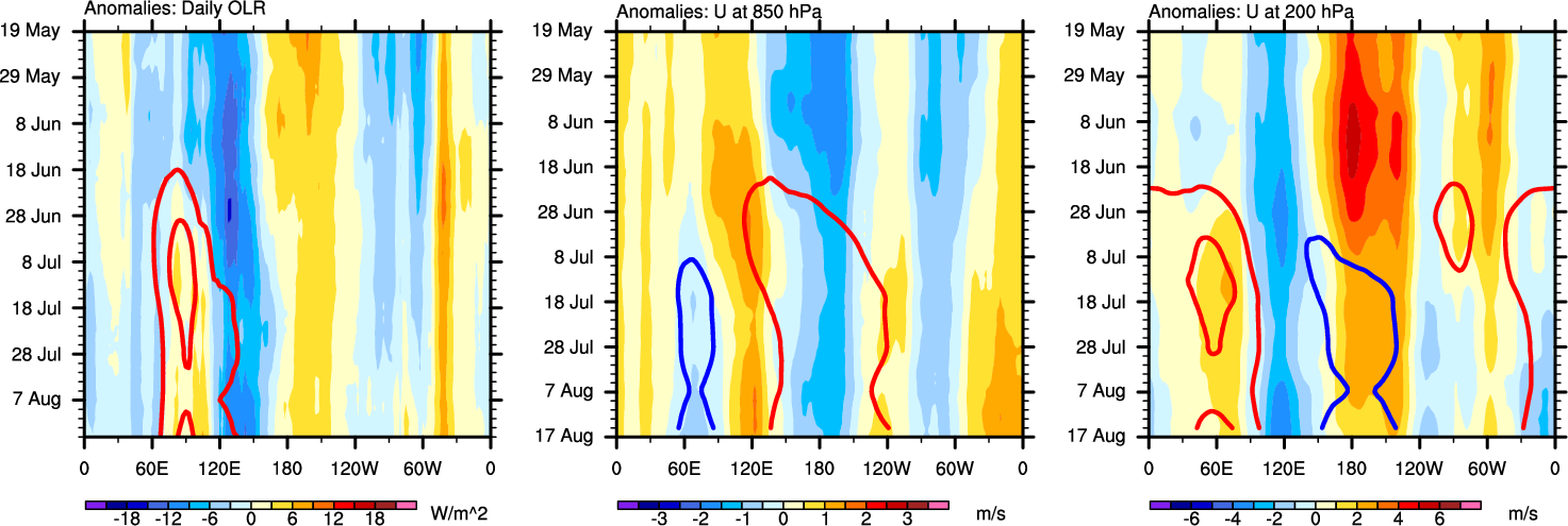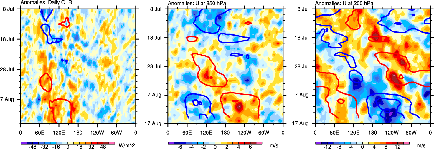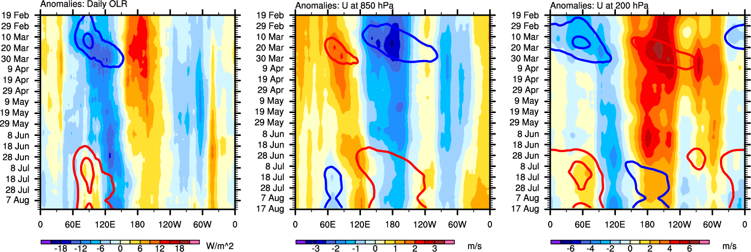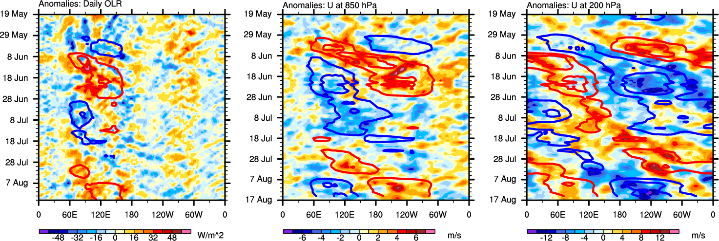 The Hovmollers show longitude-time plots for OLR, U-850, and U-200. The shading indicates the observed anomalies, while the contours are the projection of those anomalies onto the RMM EOFs.