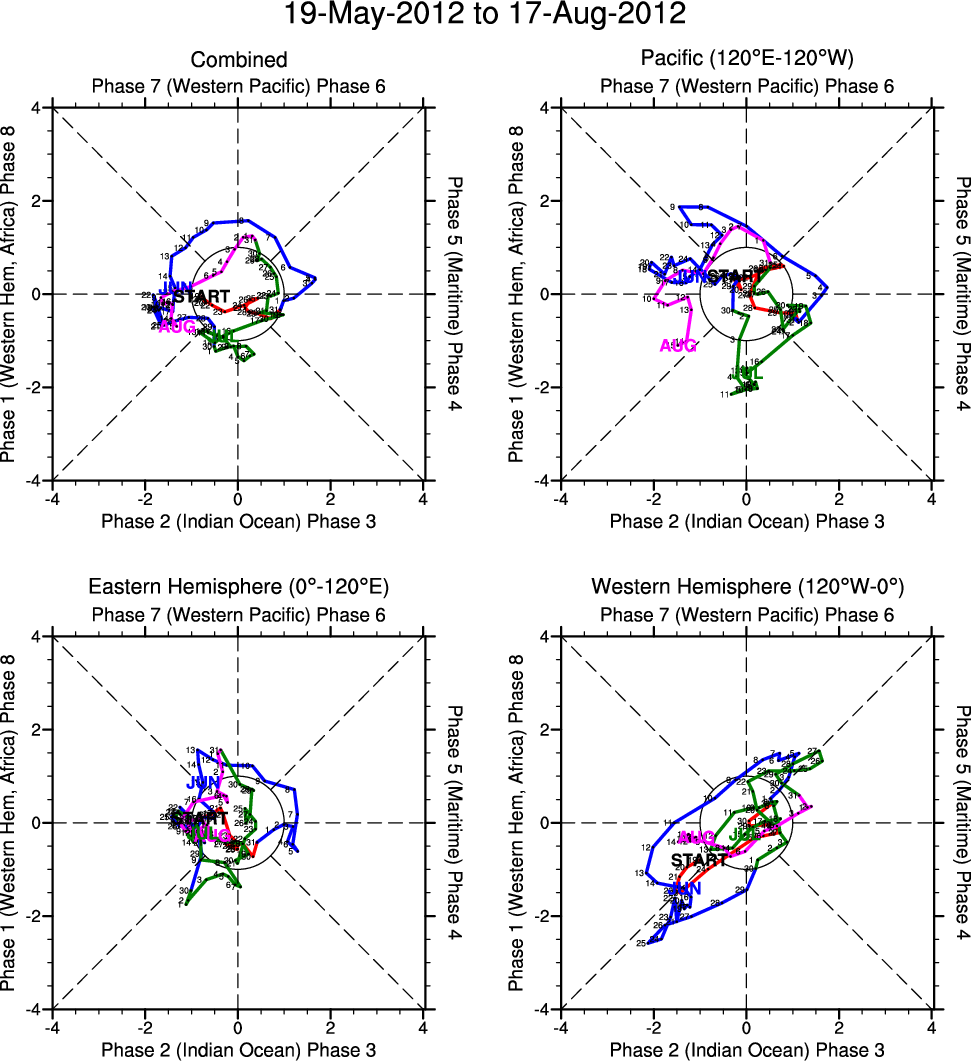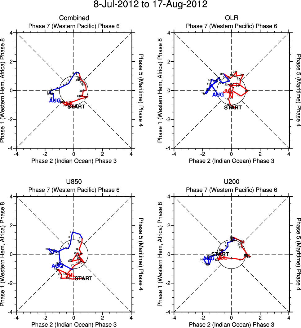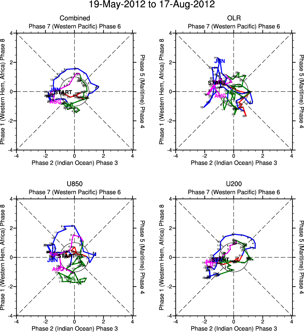 Wheeler and Hendon (2004) constructed the RMM index for monitoring the MJO. This index consists of the first two principal components (PCs) of OLR, 850-hPa zonal wind, and 200-hPa zonal wind averaged 15S-15N.