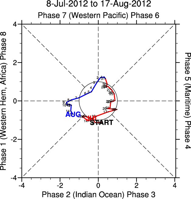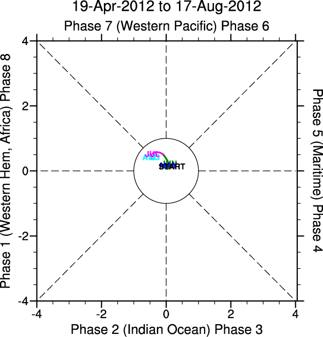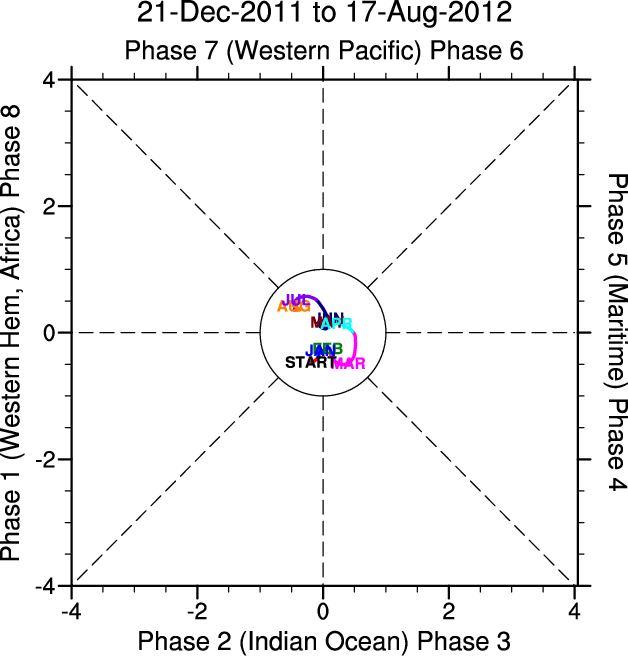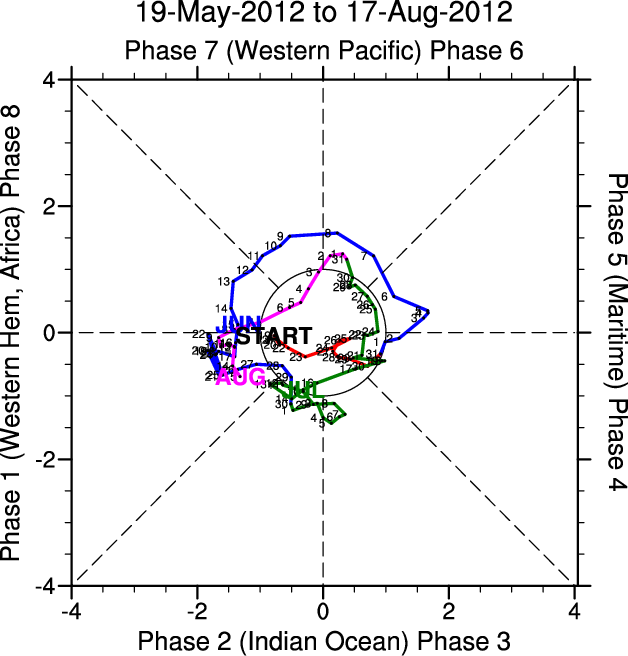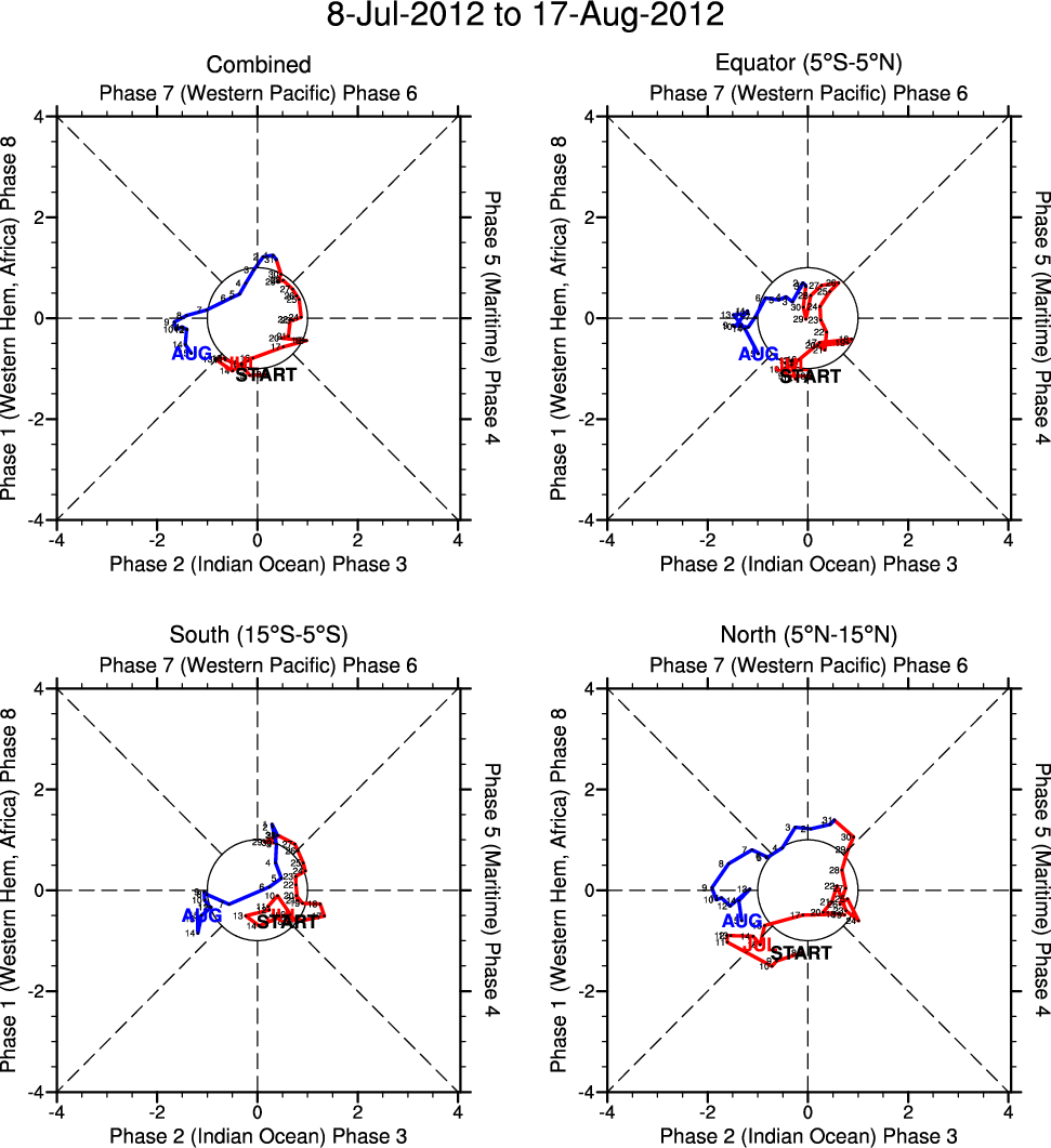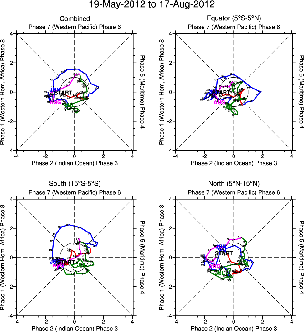 Wheeler and Hendon (2004) constructed the RMM index for monitoring the MJO. This index consists of the first two principal components (PCs) of OLR, 850-hPa zonal wind, and 200-hPa zonal wind averaged 15S-15N.