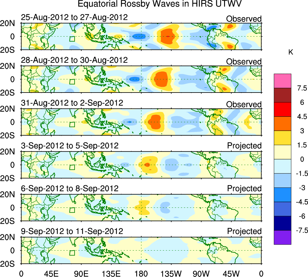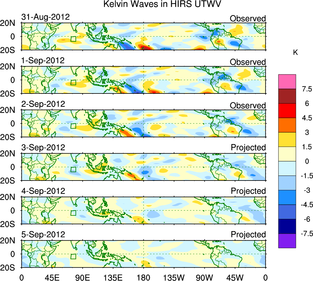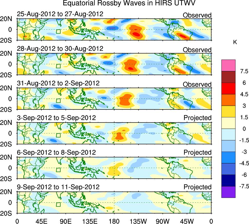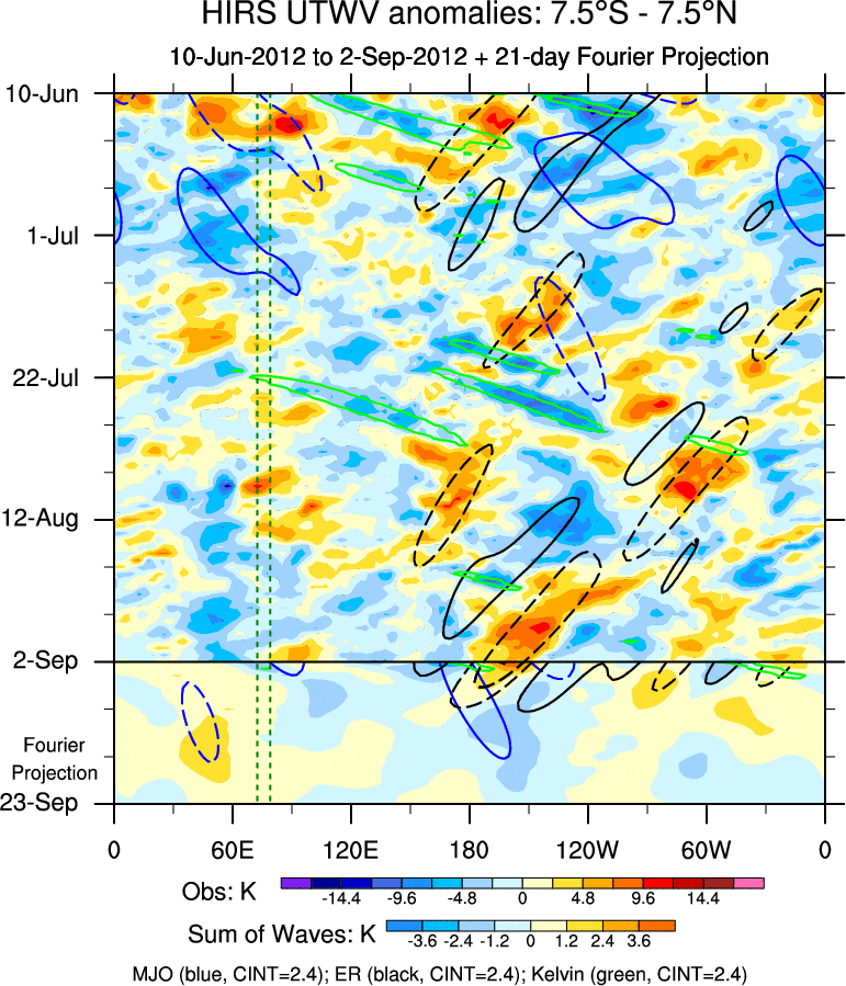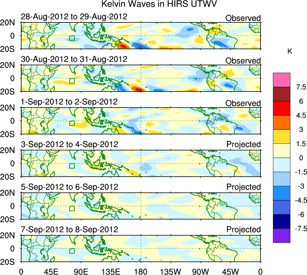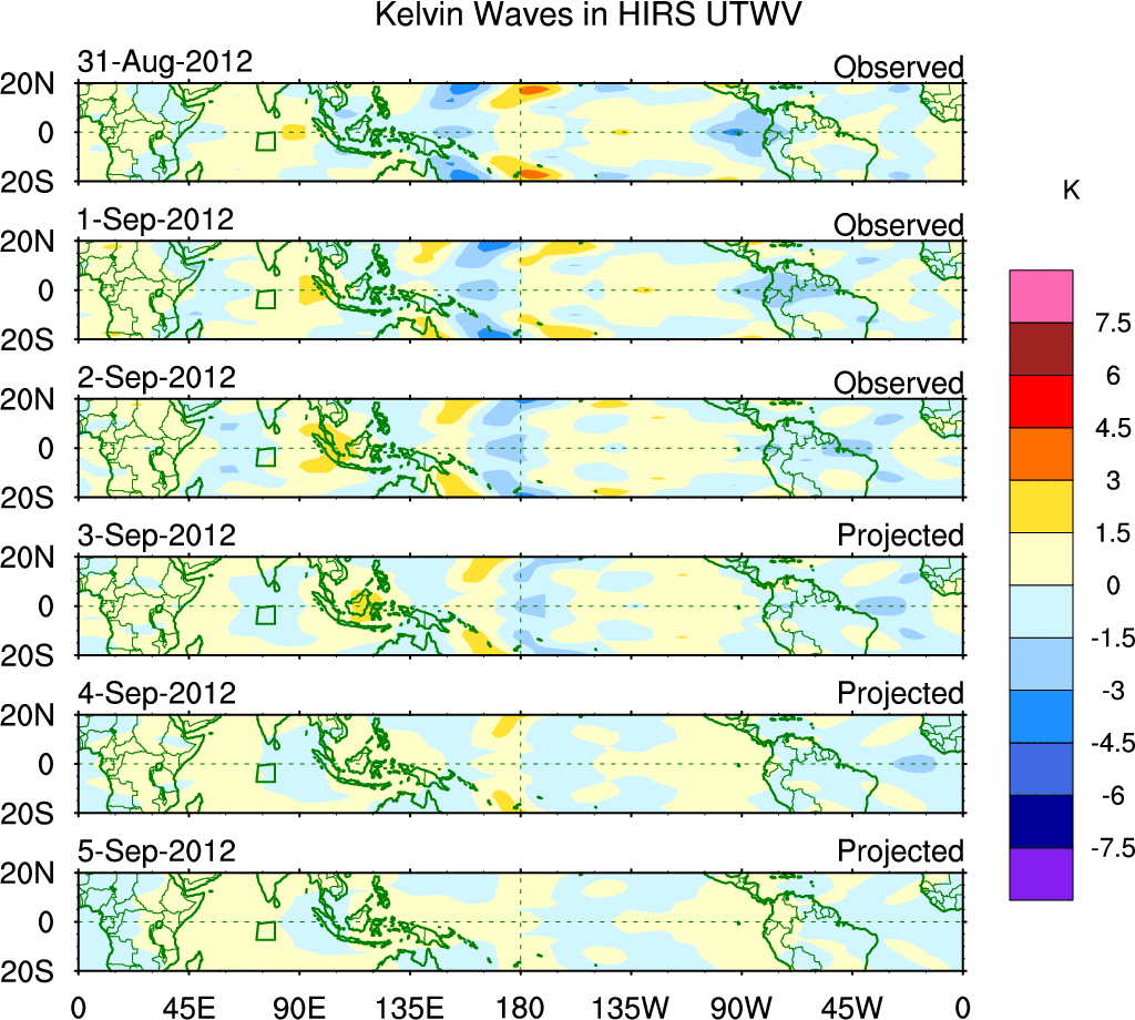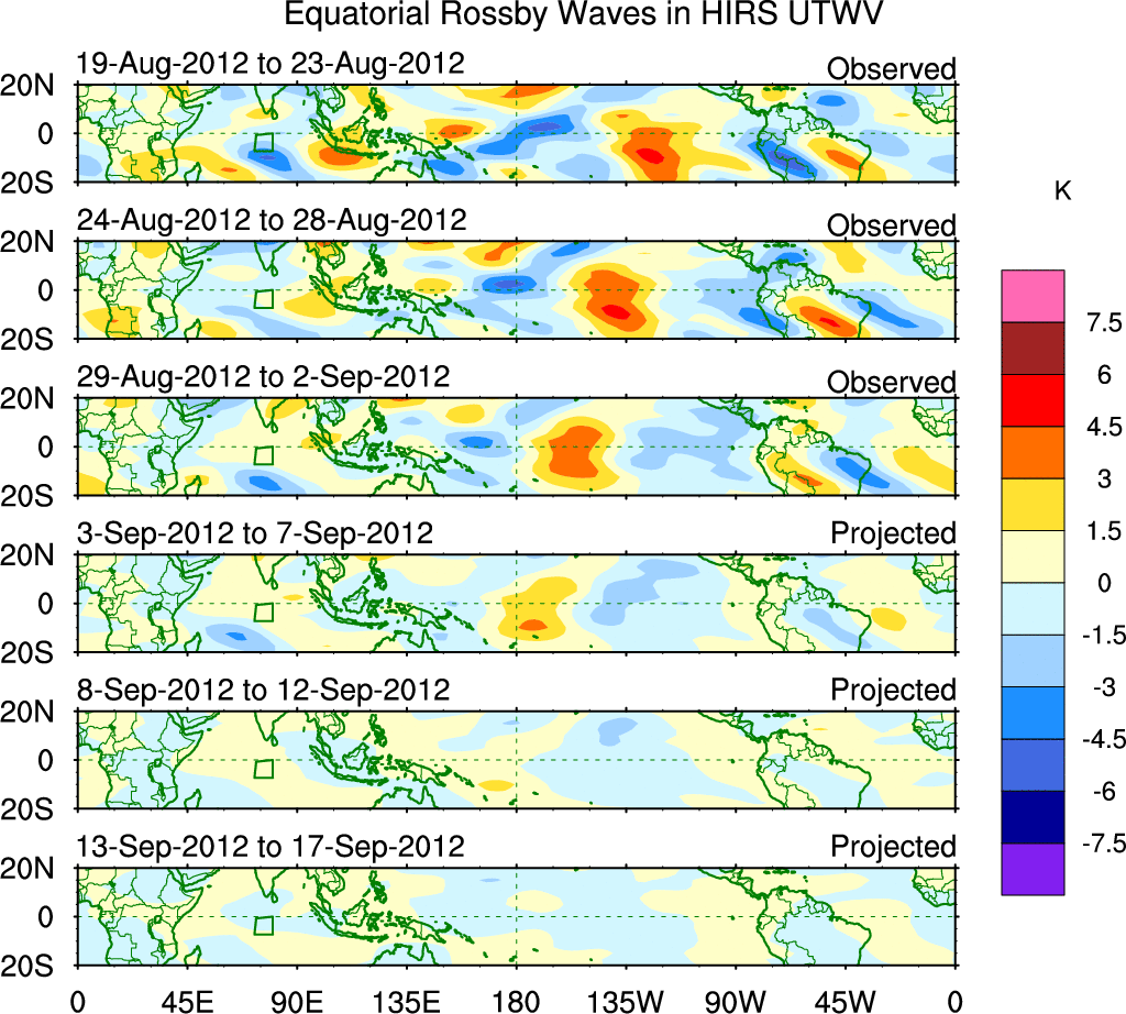 To identify tropical waves in near real-time, the OLR and UTWV data are filtered following Wheeler & Weickmann (2001 MWR). The daily anomalies are calculated using the first 3 harmonics of the seasonal cycle for 1979–2009. Missing values are then filled using linear interpolation in space and time. The most recent 365 days of anomalies are padded with 659 days of zeroes, and the result is filtered for each wave type.