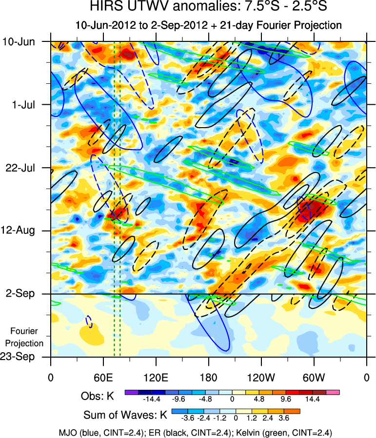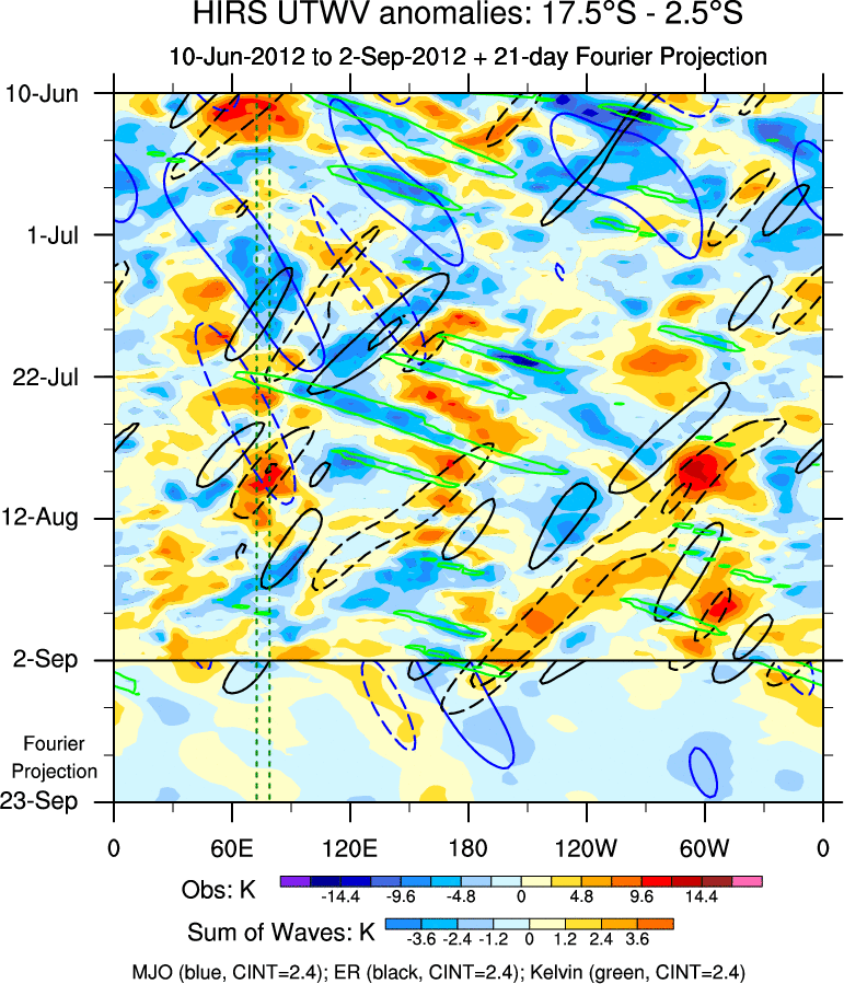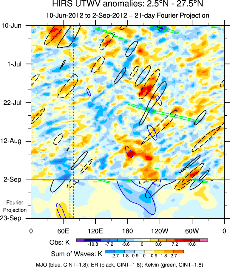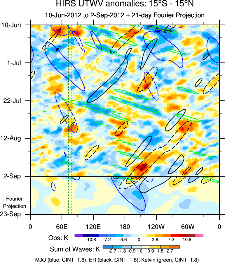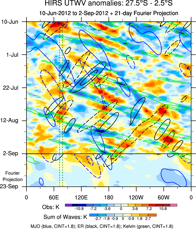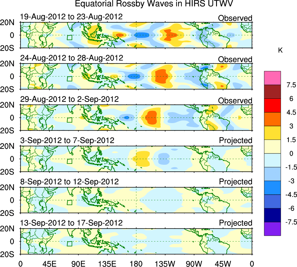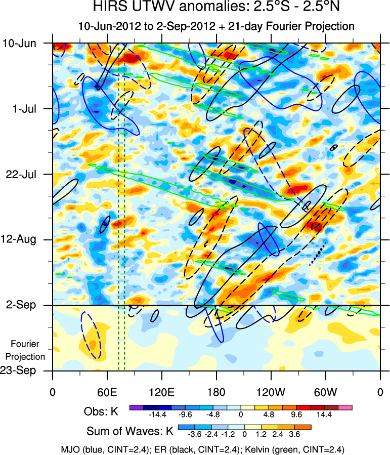To identify tropical waves in near real-time, the OLR and UTWV data are filtered following Wheeler & Weickmann (2001 MWR). The daily anomalies are calculated using the first 3 harmonics of the seasonal cycle for 1979–2009. Missing values are then filled using linear interpolation in space and time. The most recent 365 days of anomalies are padded with 659 days of zeroes, and the result is filtered for each wave type.