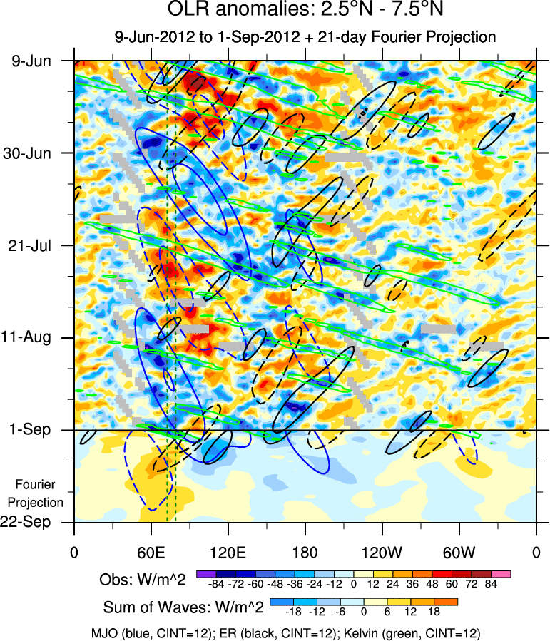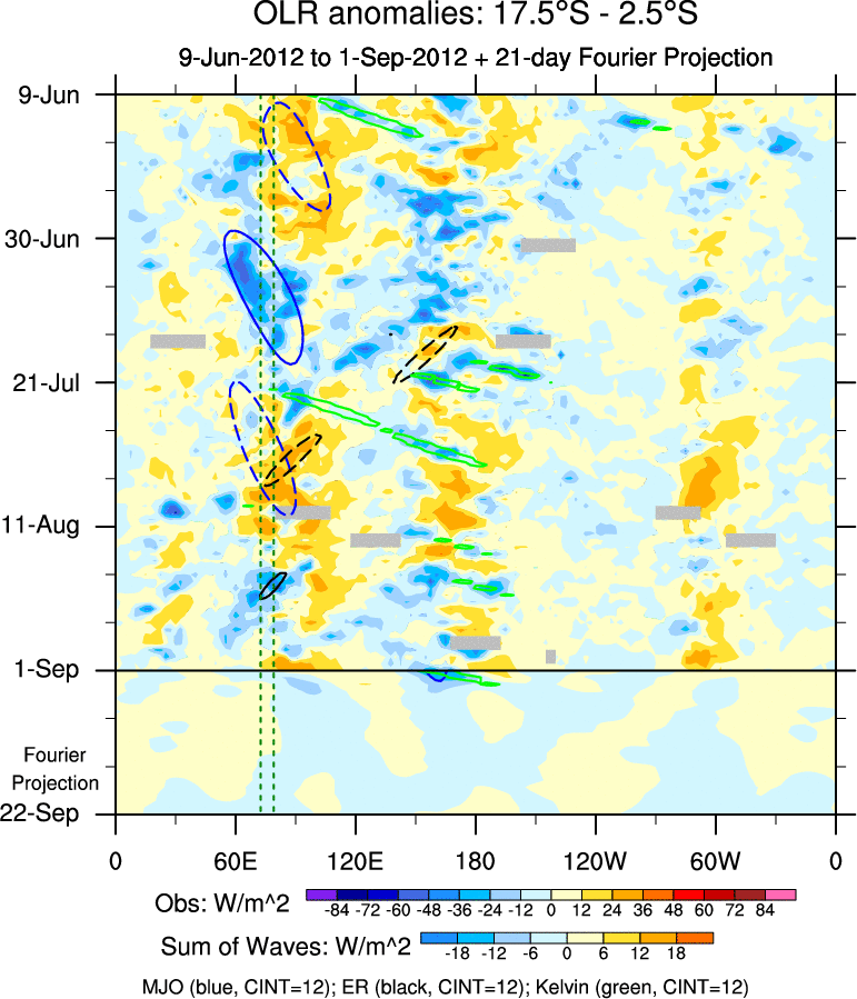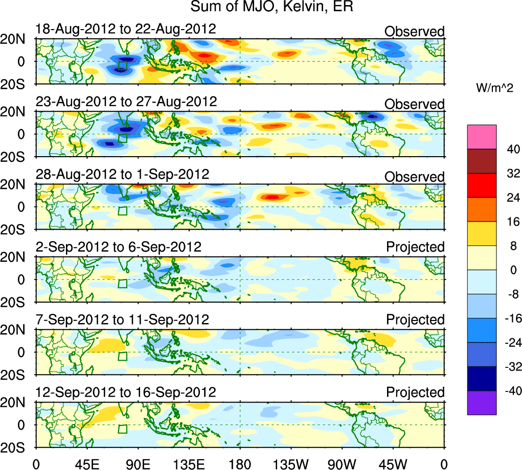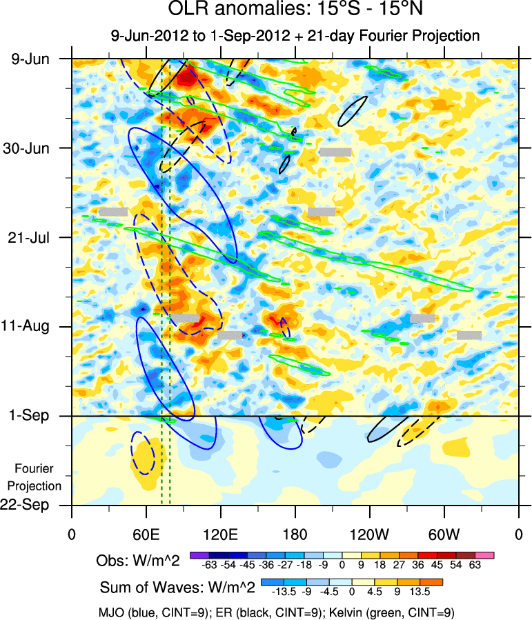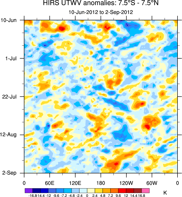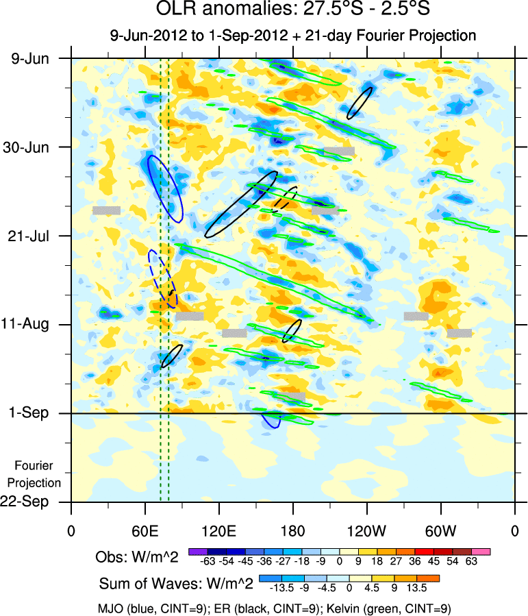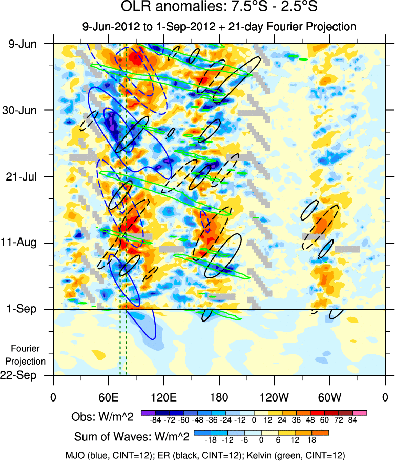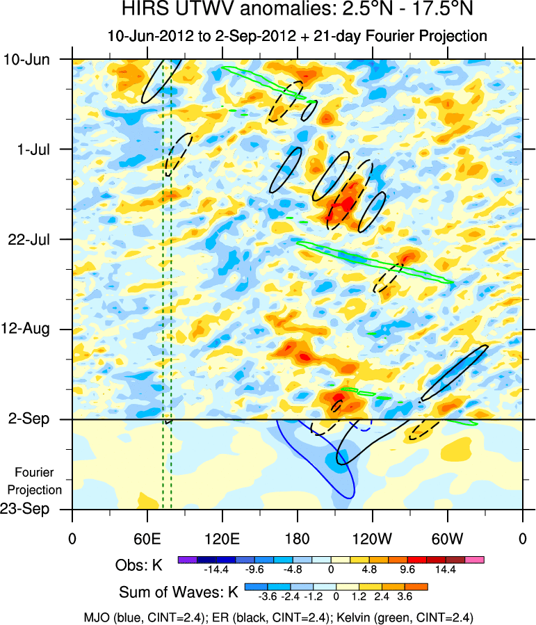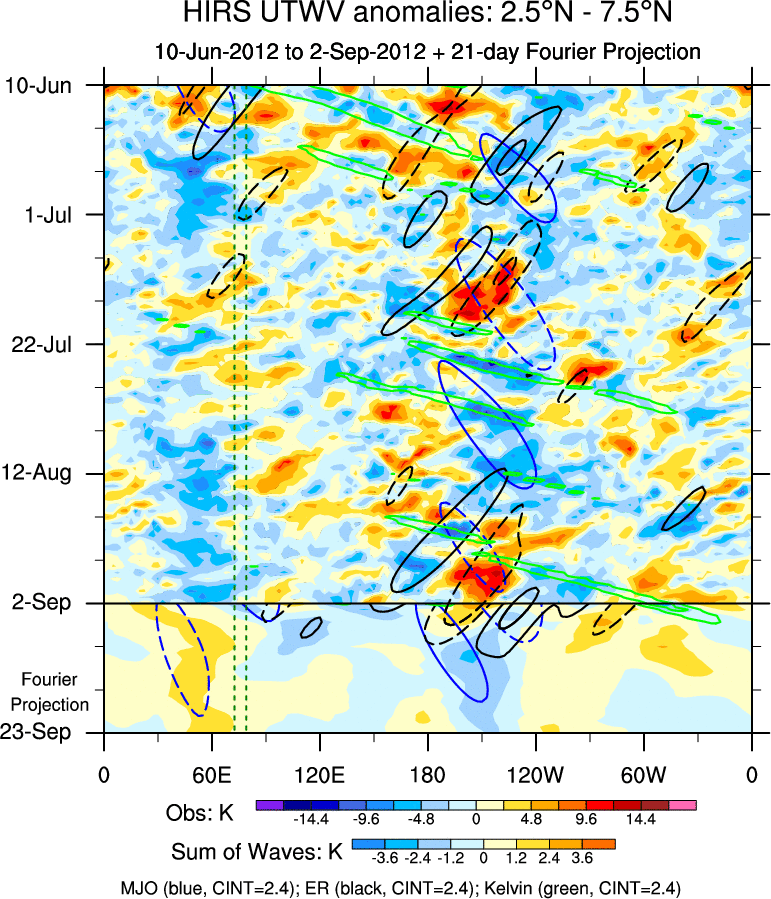 To identify tropical waves in near real-time, the OLR and UTWV data are filtered following Wheeler & Weickmann (2001 MWR). The daily anomalies are calculated using the first 3 harmonics of the seasonal cycle for 1979–2009. Missing values are then filled using linear interpolation in space and time. The most recent 365 days of anomalies are padded with 659 days of zeroes, and the result is filtered for each wave type.