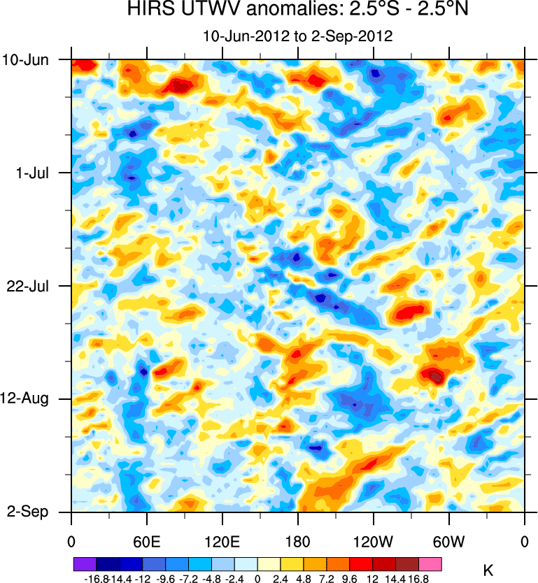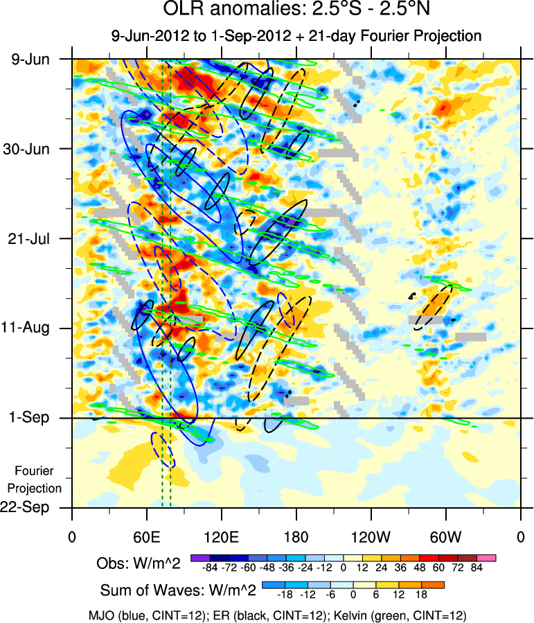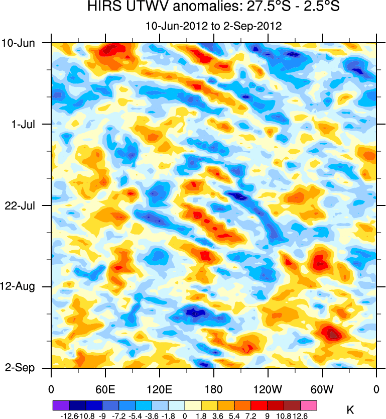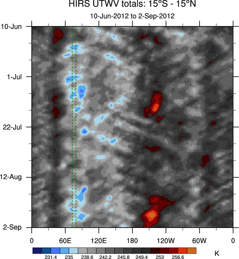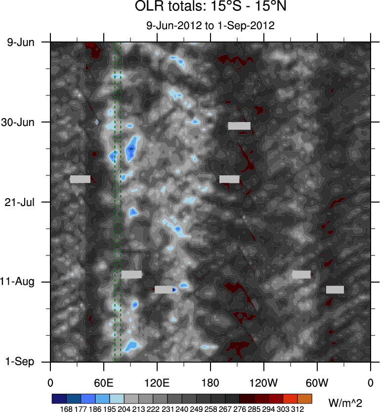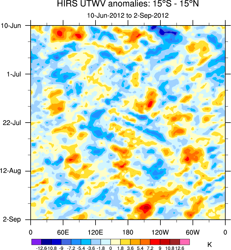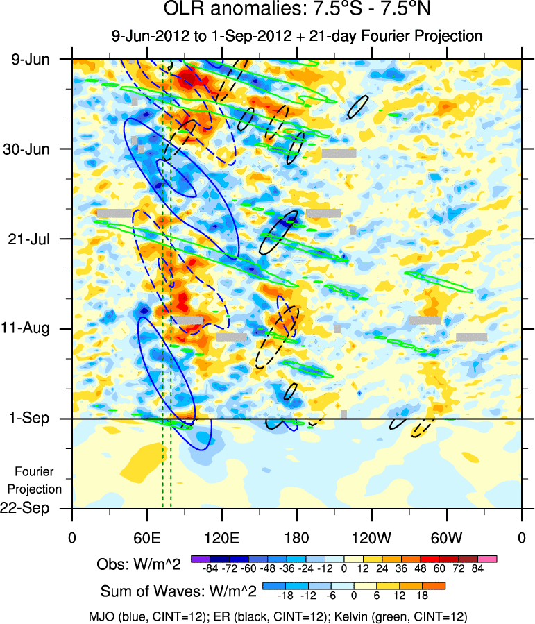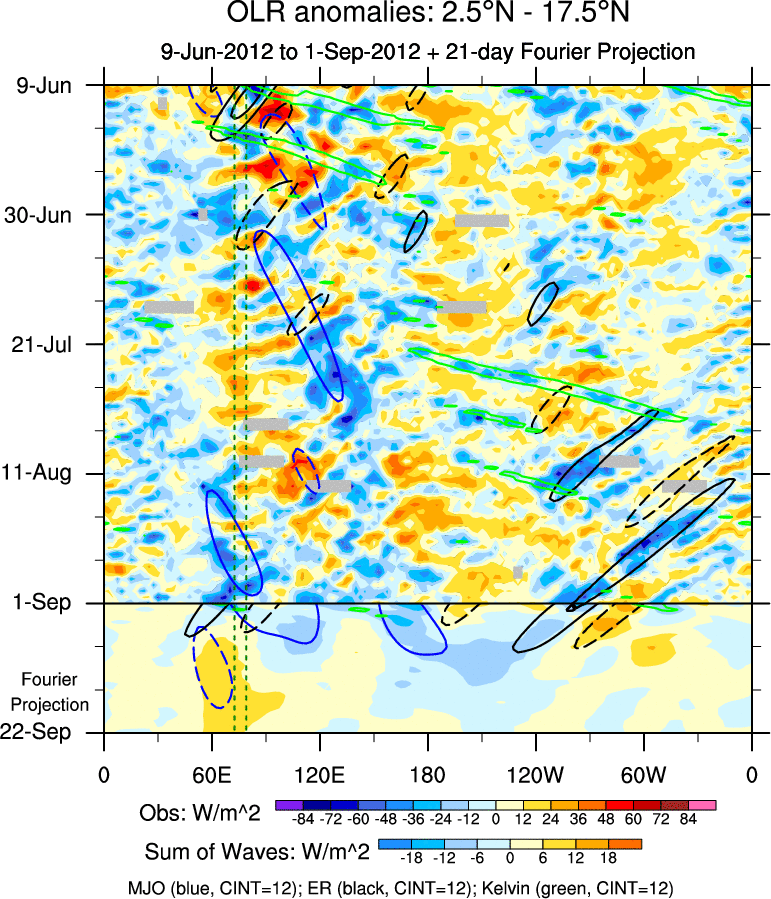 To identify tropical waves in near real-time, the OLR and UTWV data are filtered following Wheeler & Weickmann (2001 MWR). The daily anomalies are calculated using the first 3 harmonics of the seasonal cycle for 1979–2009. Missing values are then filled using linear interpolation in space and time. The most recent 365 days of anomalies are padded with 659 days of zeroes, and the result is filtered for each wave type.