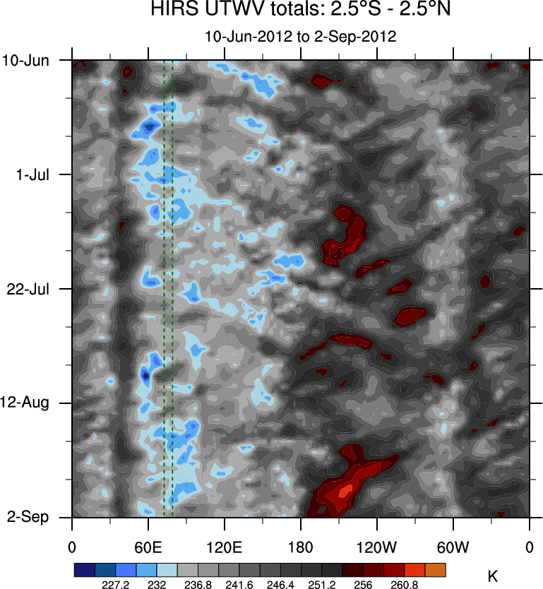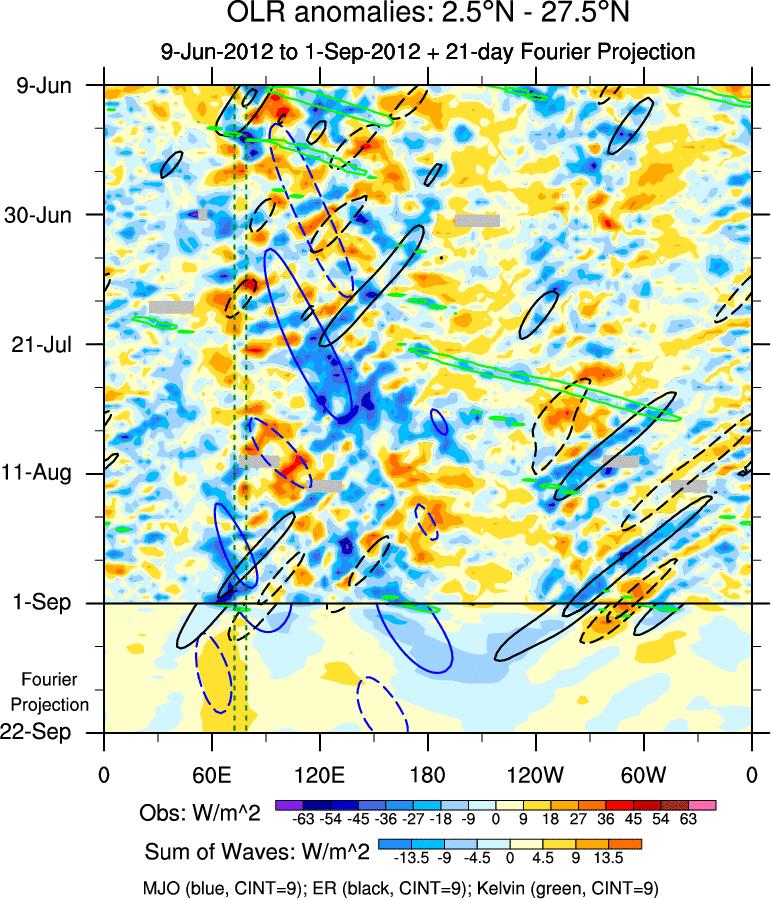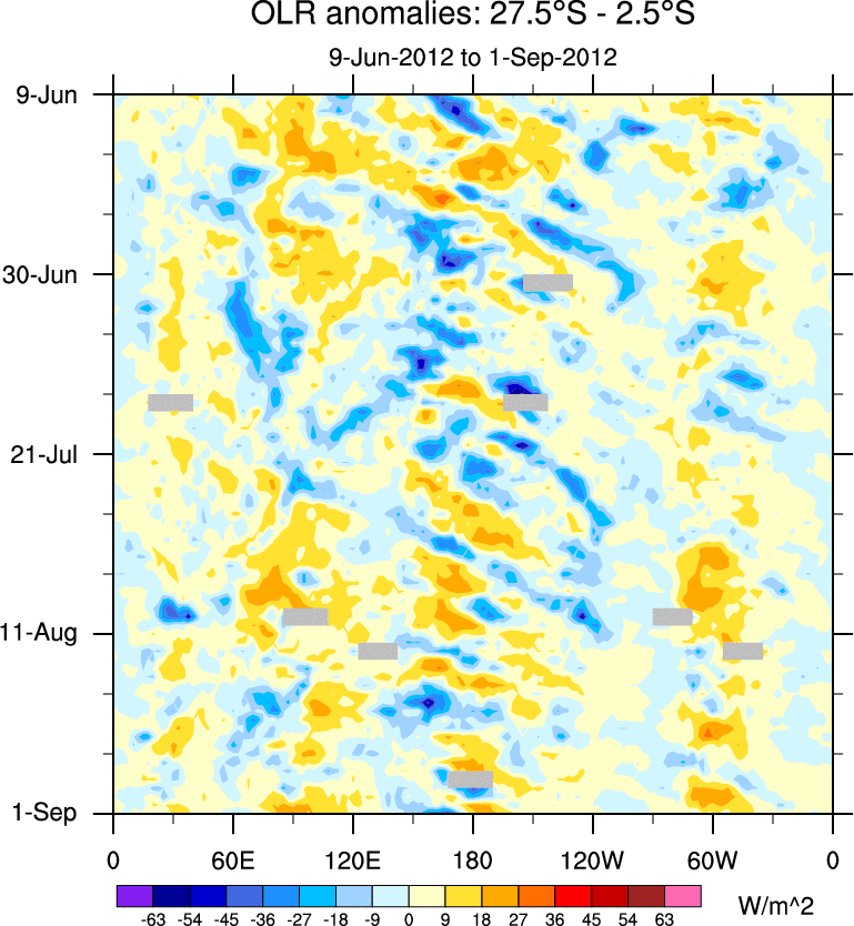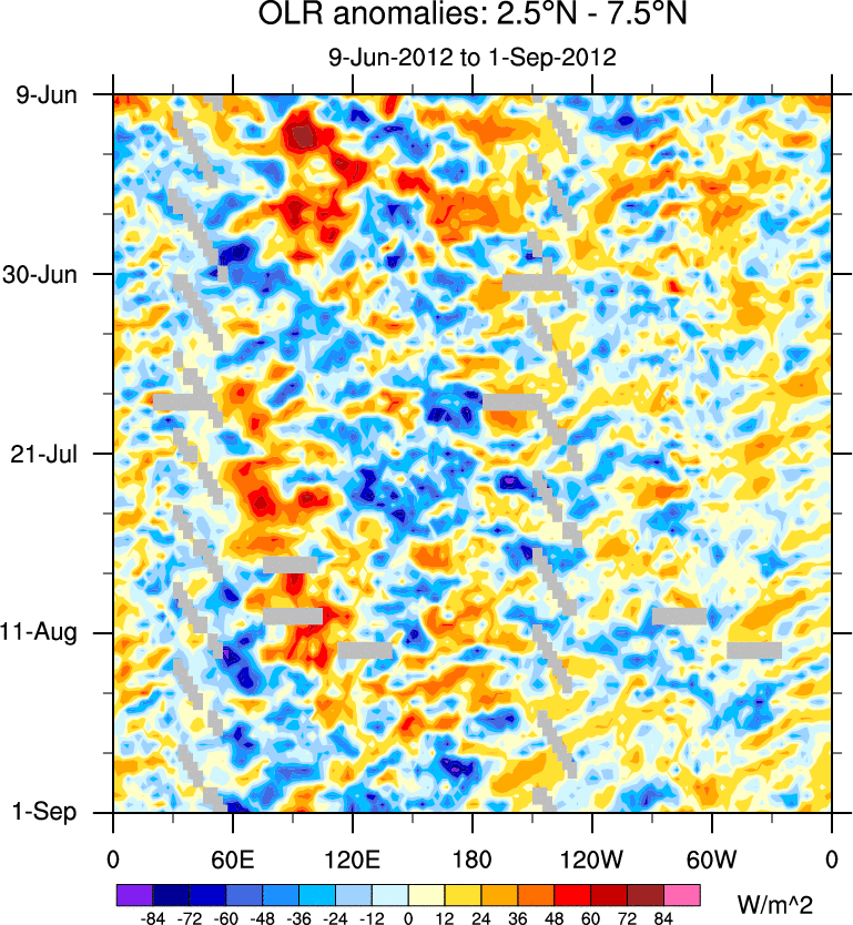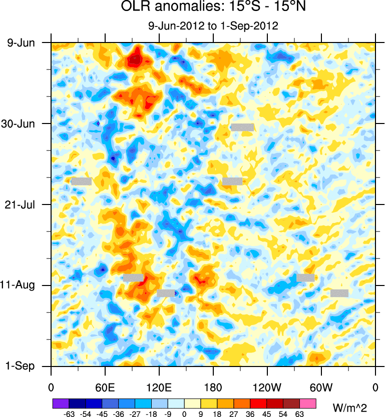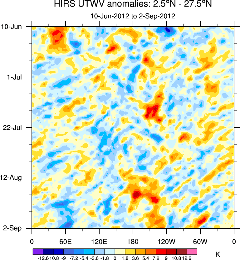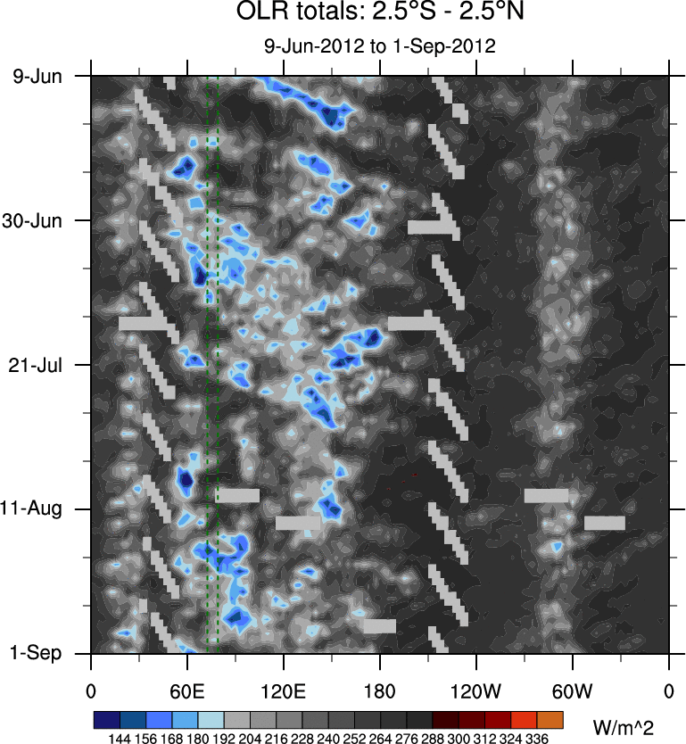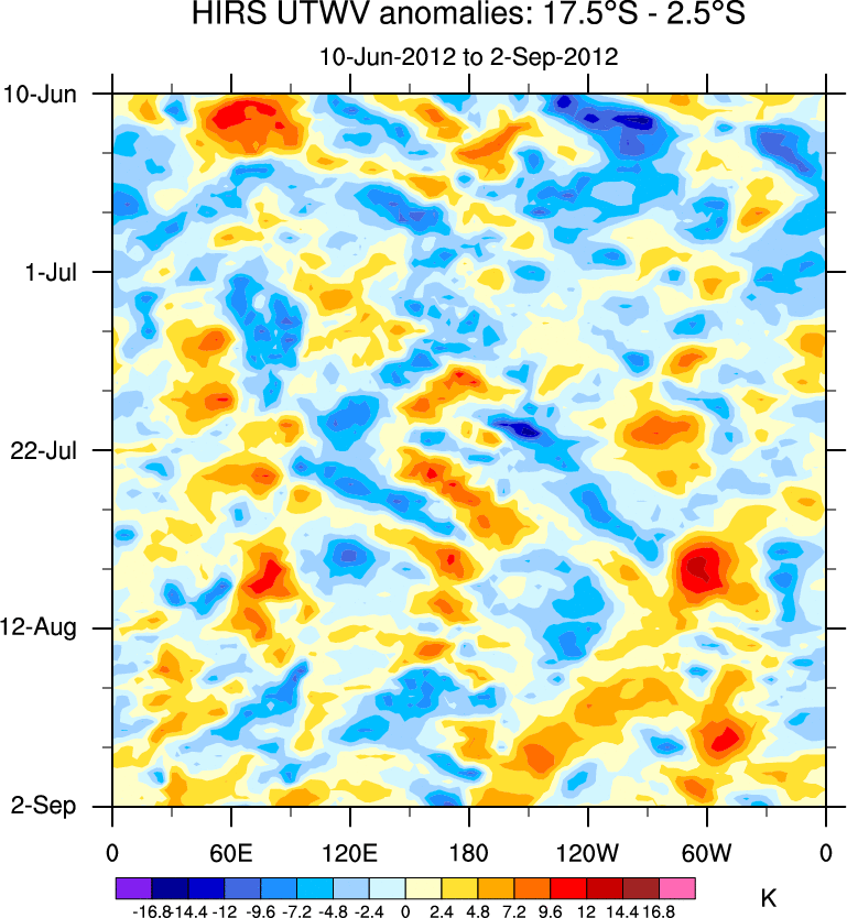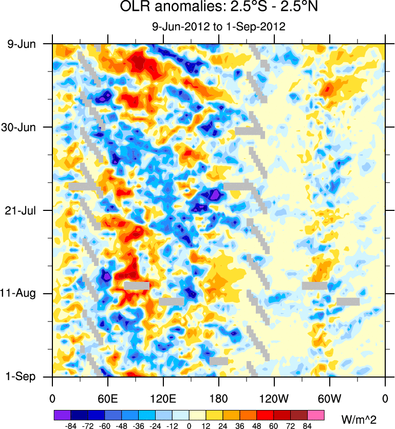 To identify tropical waves in near real-time, the OLR and UTWV data are filtered following Wheeler & Weickmann (2001 MWR). The daily anomalies are calculated using the first 3 harmonics of the seasonal cycle for 1979–2009. Missing values are then filled using linear interpolation in space and time. The most recent 365 days of anomalies are padded with 659 days of zeroes, and the result is filtered for each wave type.
