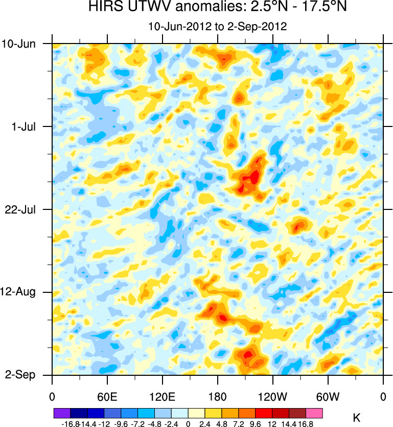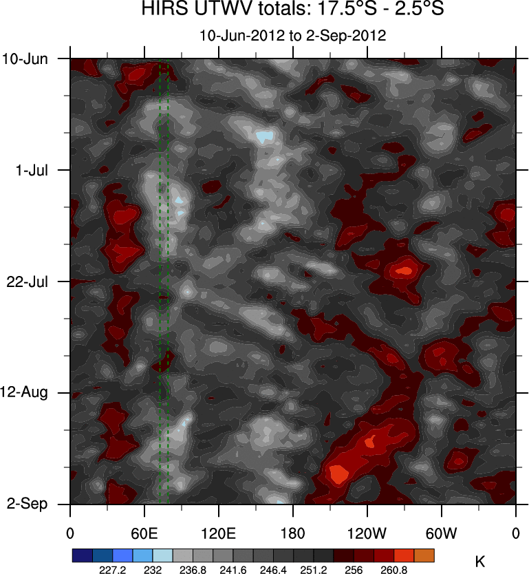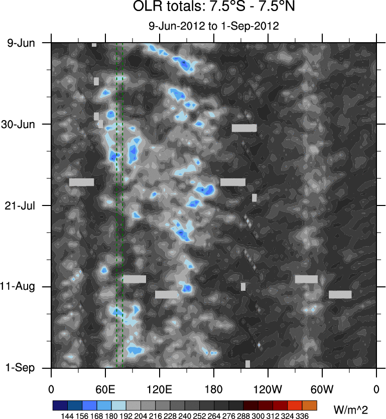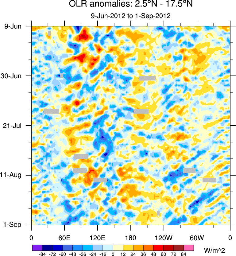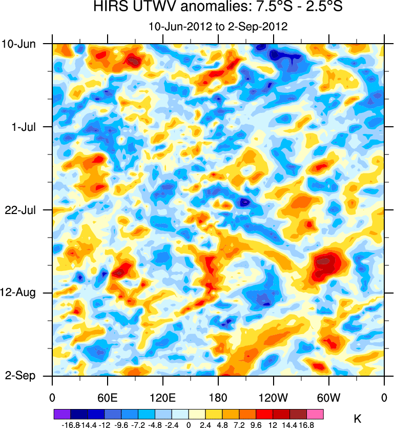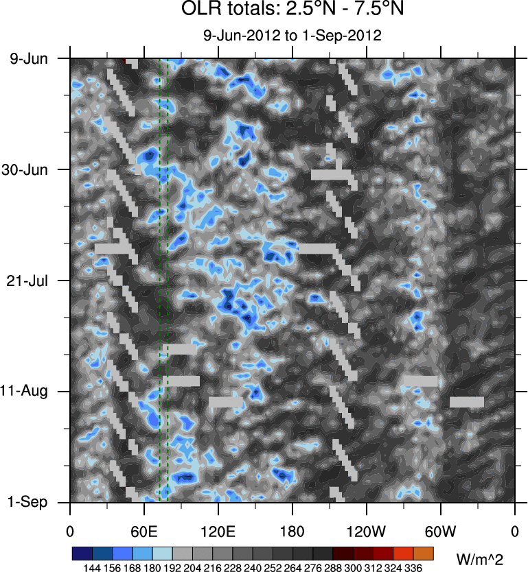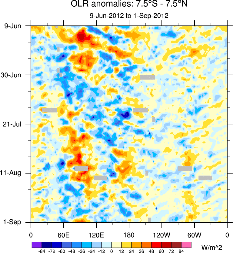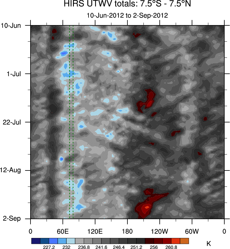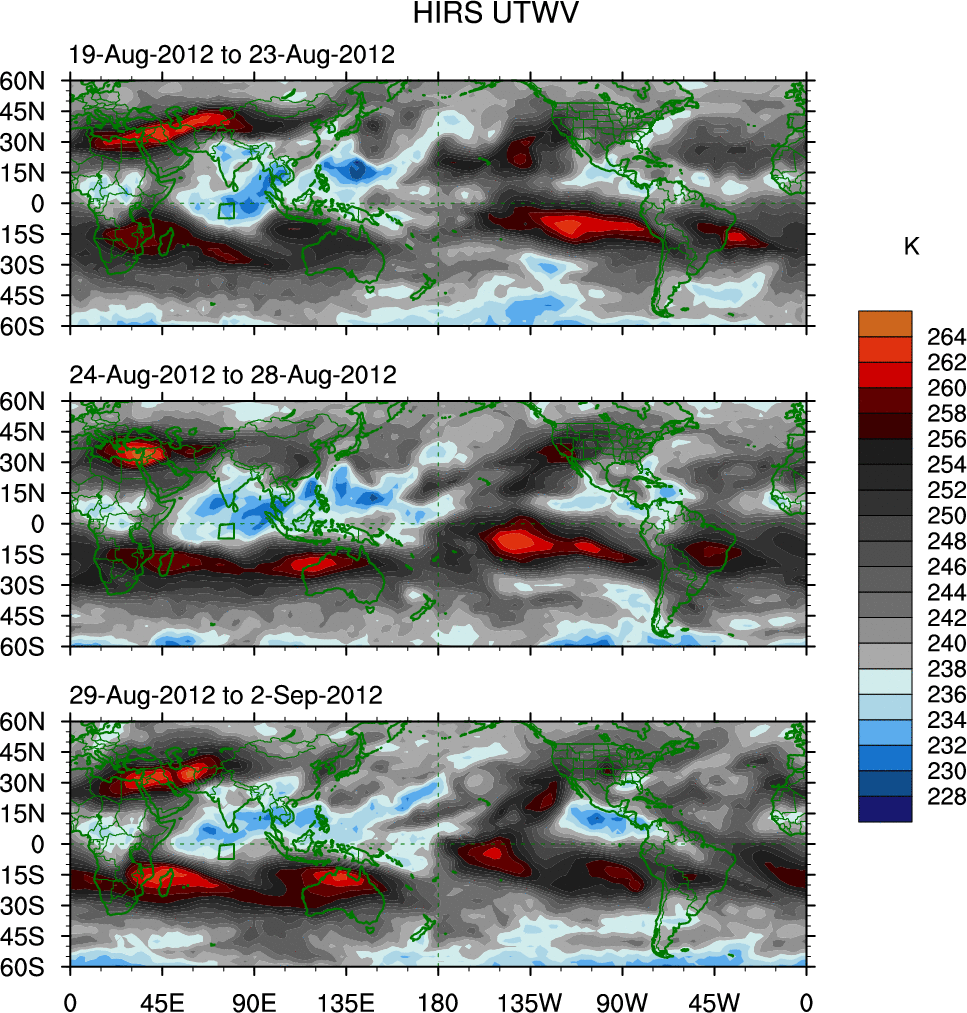 To identify tropical waves in near real-time, the OLR and UTWV data are filtered following Wheeler & Weickmann (2001 MWR). The daily anomalies are calculated using the first 3 harmonics of the seasonal cycle for 1979–2009. Missing values are then filled using linear interpolation in space and time. The most recent 365 days of anomalies are padded with 659 days of zeroes, and the result is filtered for each wave type.