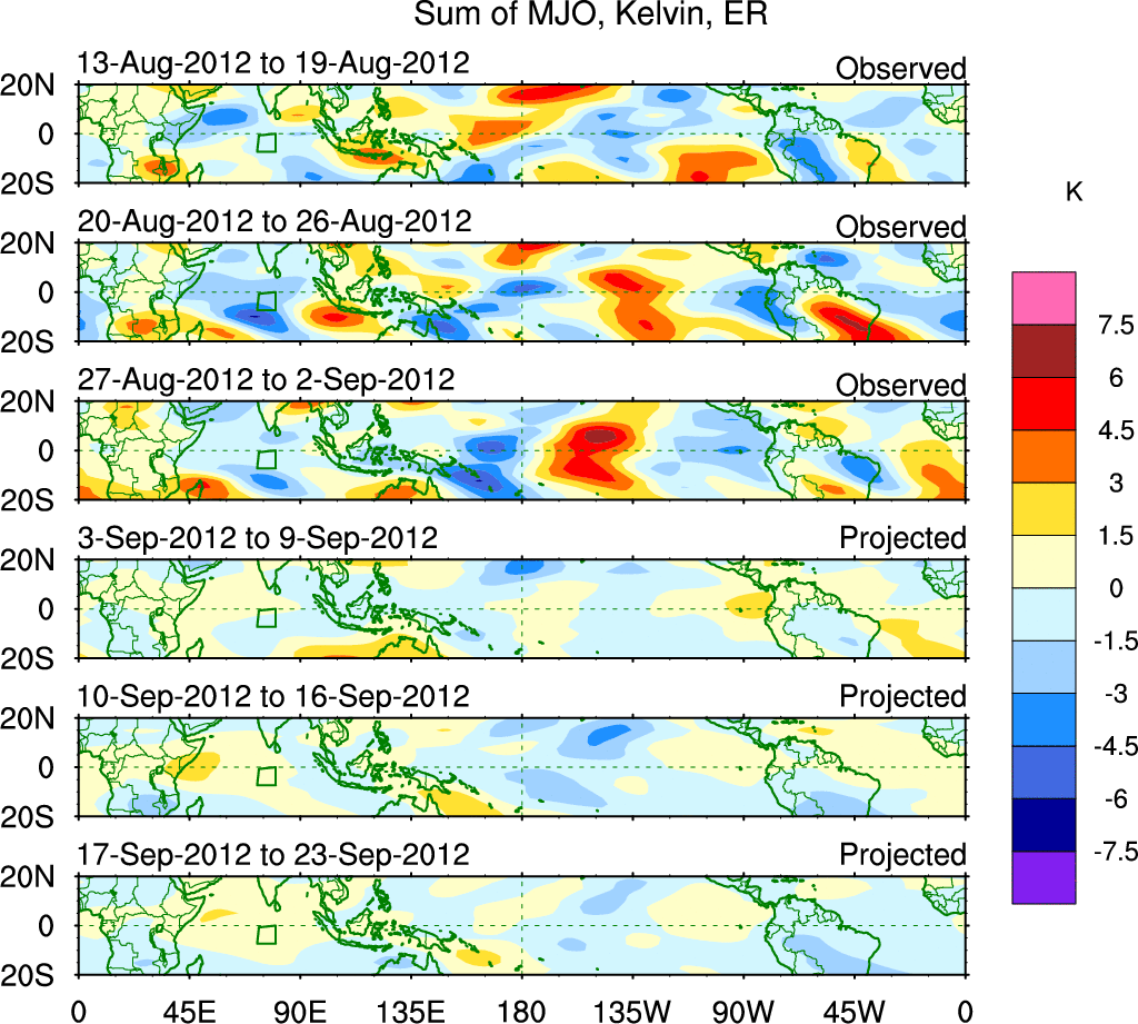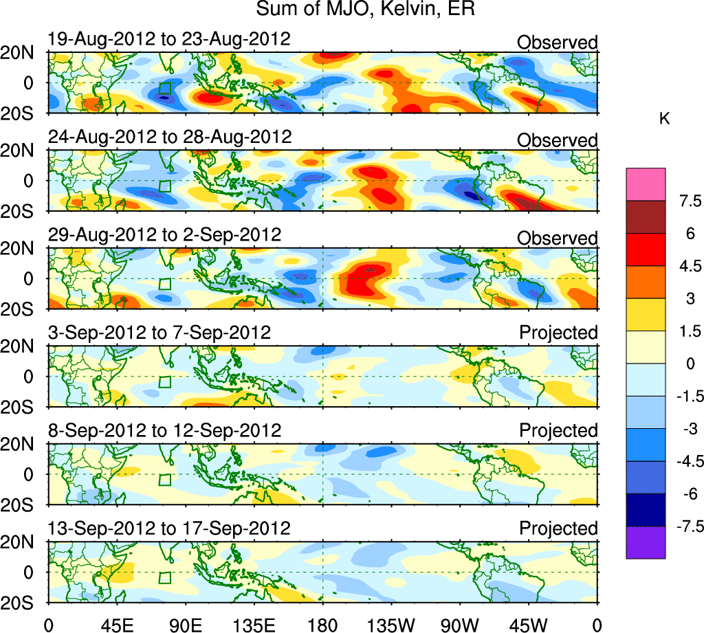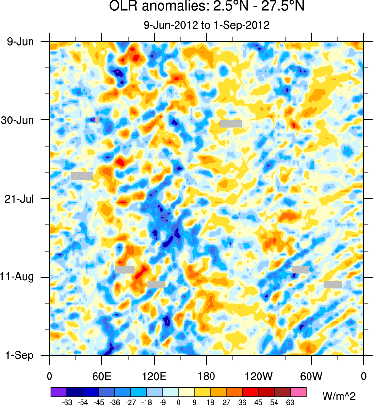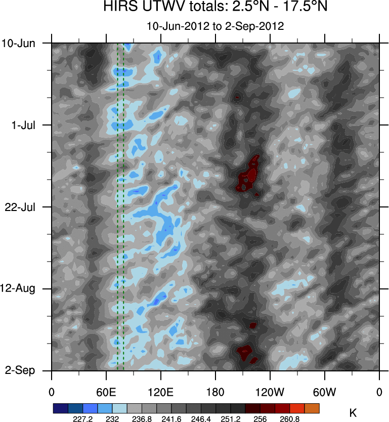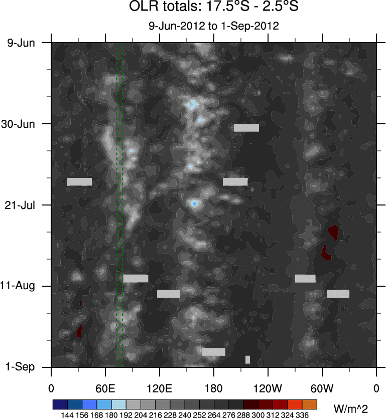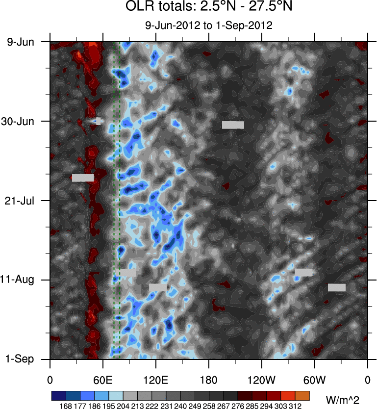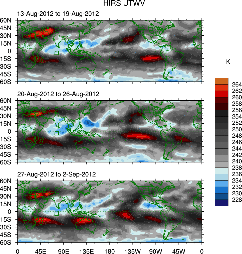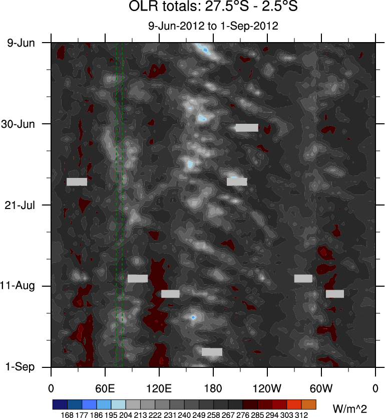 To identify tropical waves in near real-time, the OLR and UTWV data are filtered following Wheeler & Weickmann (2001 MWR). The daily anomalies are calculated using the first 3 harmonics of the seasonal cycle for 1979–2009. Missing values are then filled using linear interpolation in space and time. The most recent 365 days of anomalies are padded with 659 days of zeroes, and the result is filtered for each wave type.