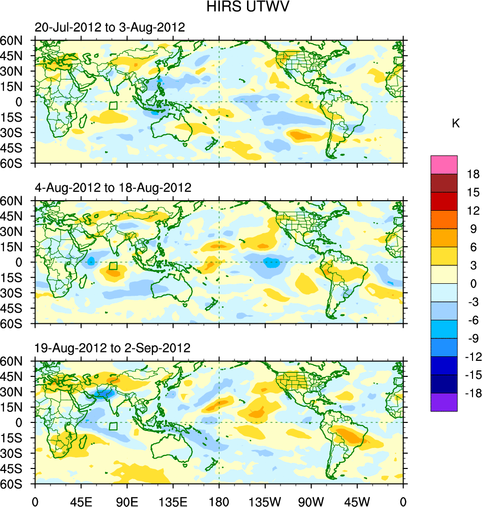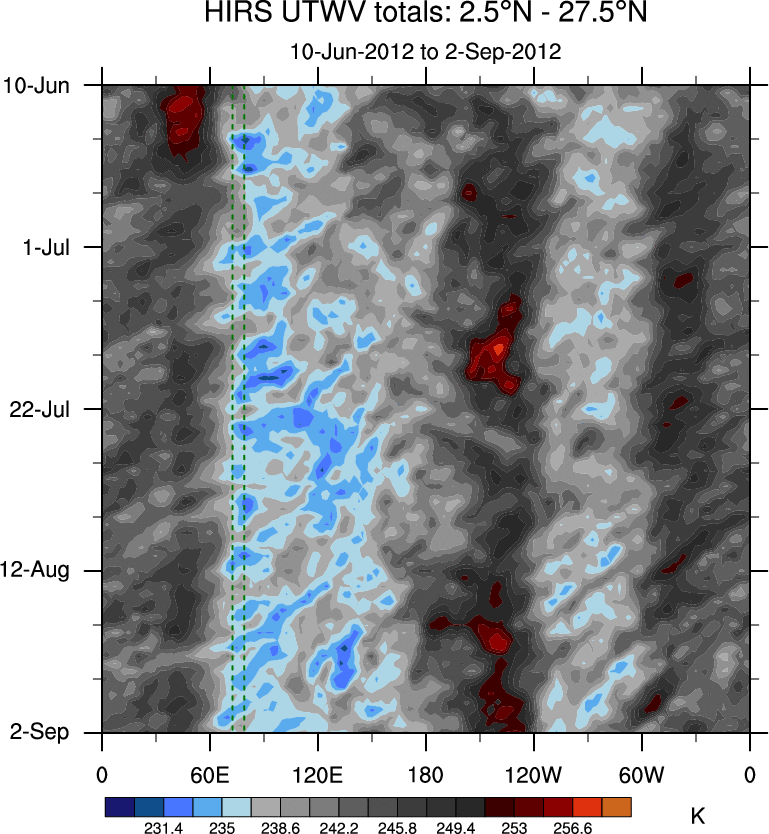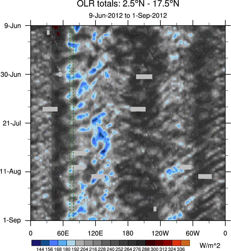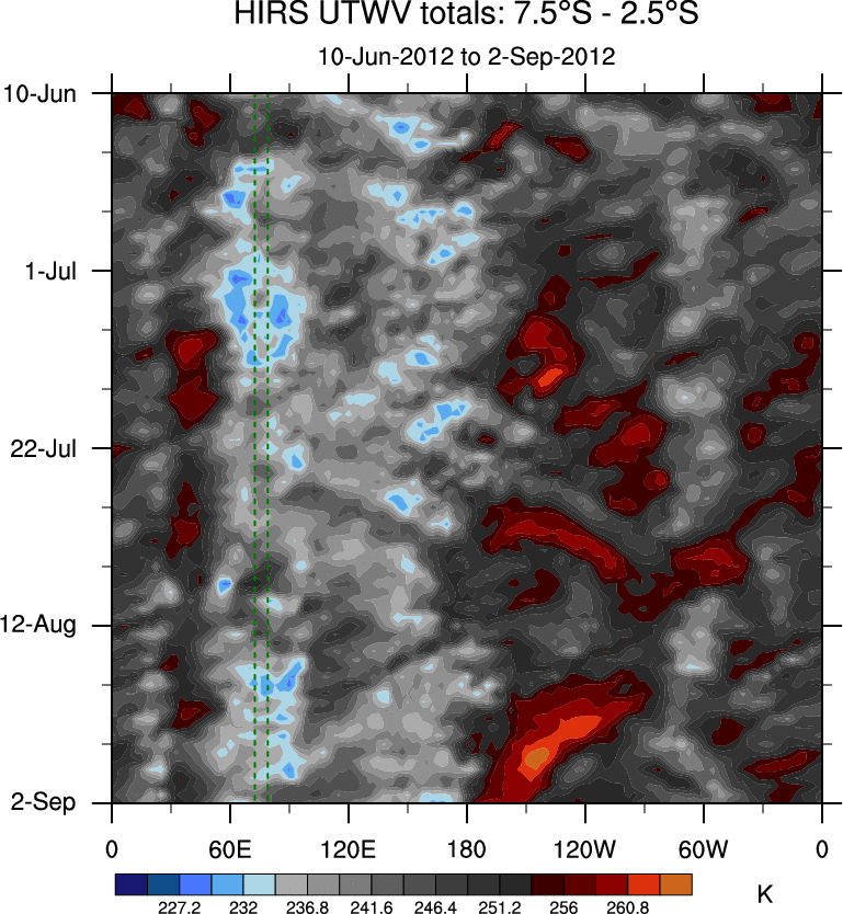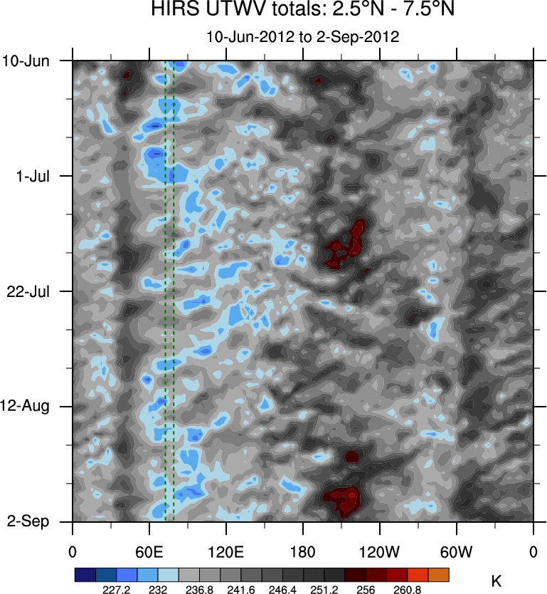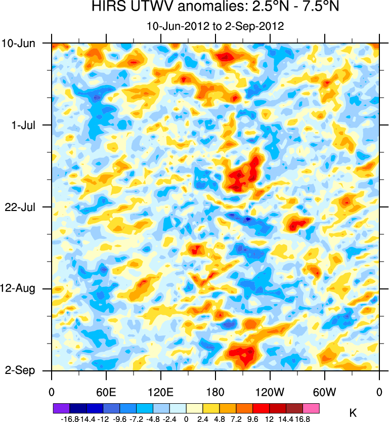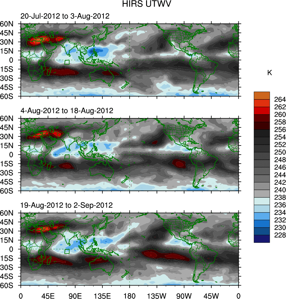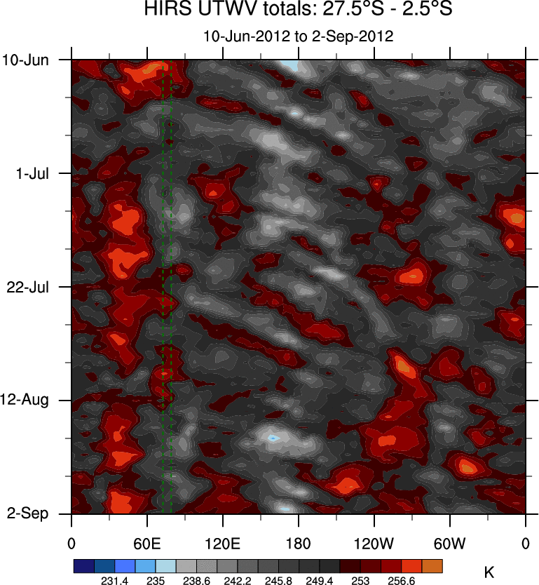 To identify tropical waves in near real-time, the OLR and UTWV data are filtered following Wheeler & Weickmann (2001 MWR). The daily anomalies are calculated using the first 3 harmonics of the seasonal cycle for 1979–2009. Missing values are then filled using linear interpolation in space and time. The most recent 365 days of anomalies are padded with 659 days of zeroes, and the result is filtered for each wave type.