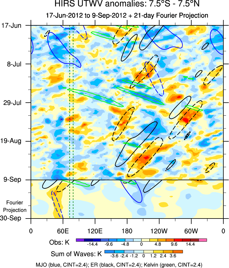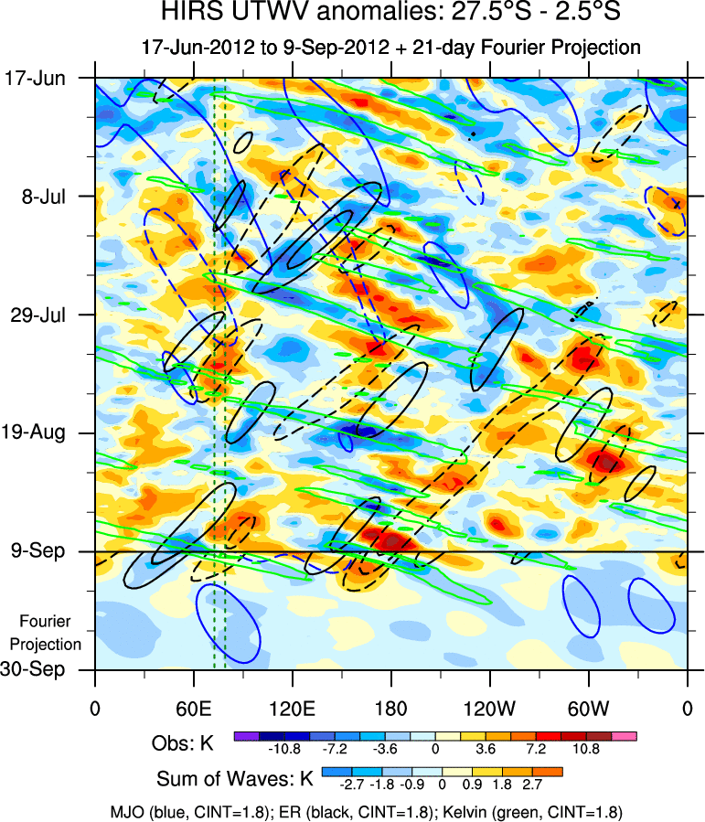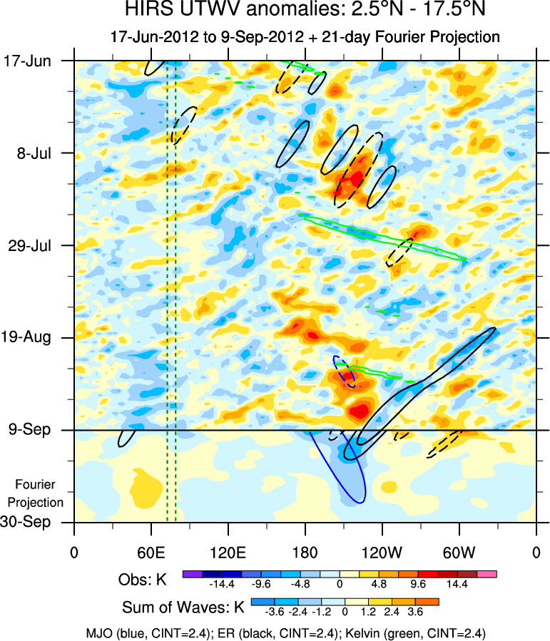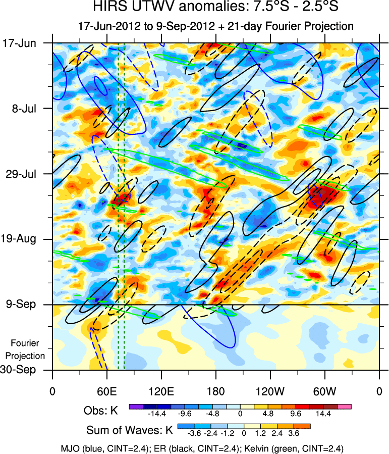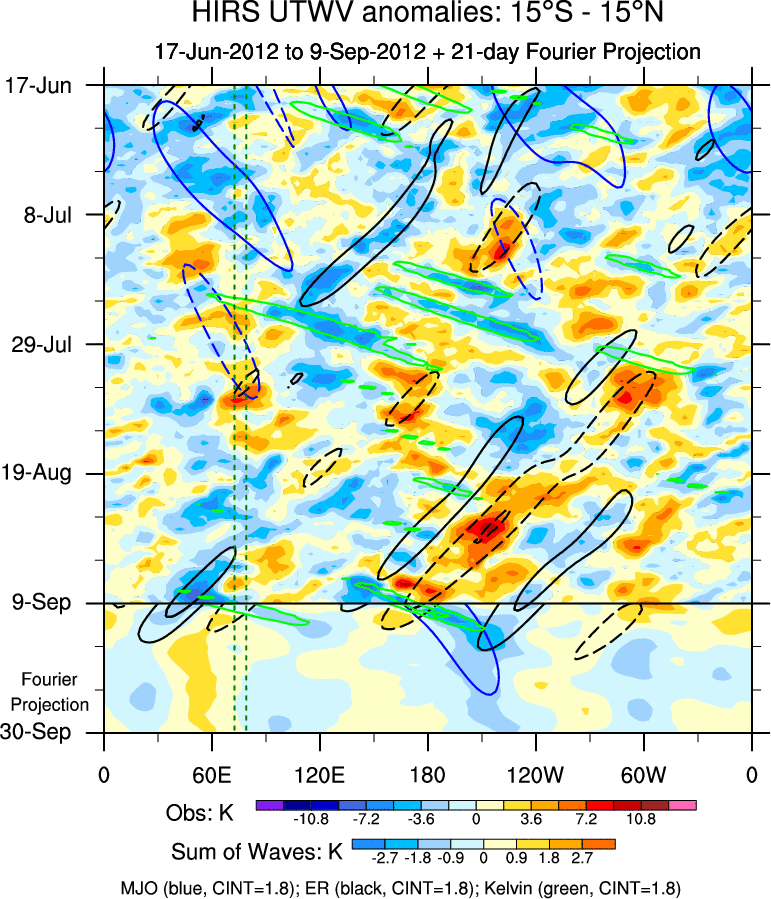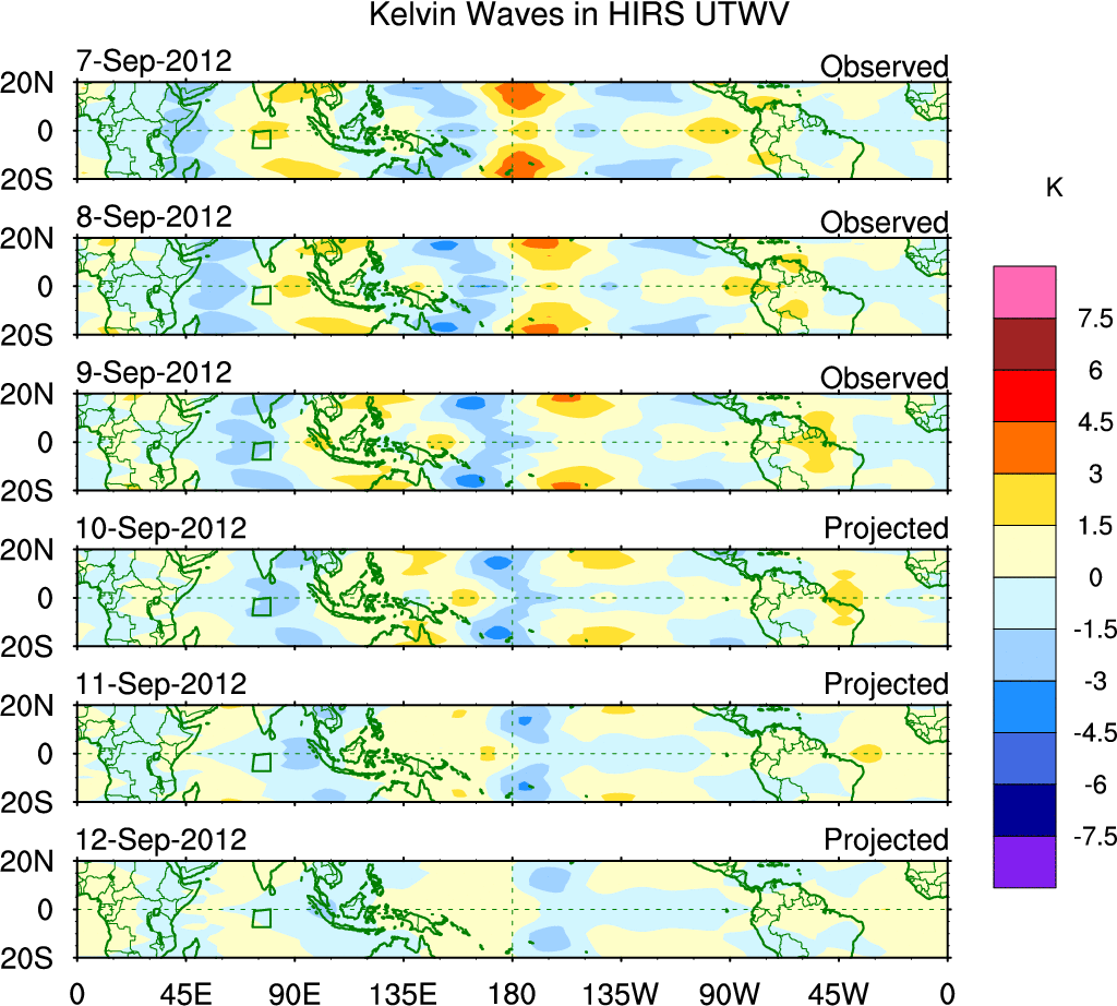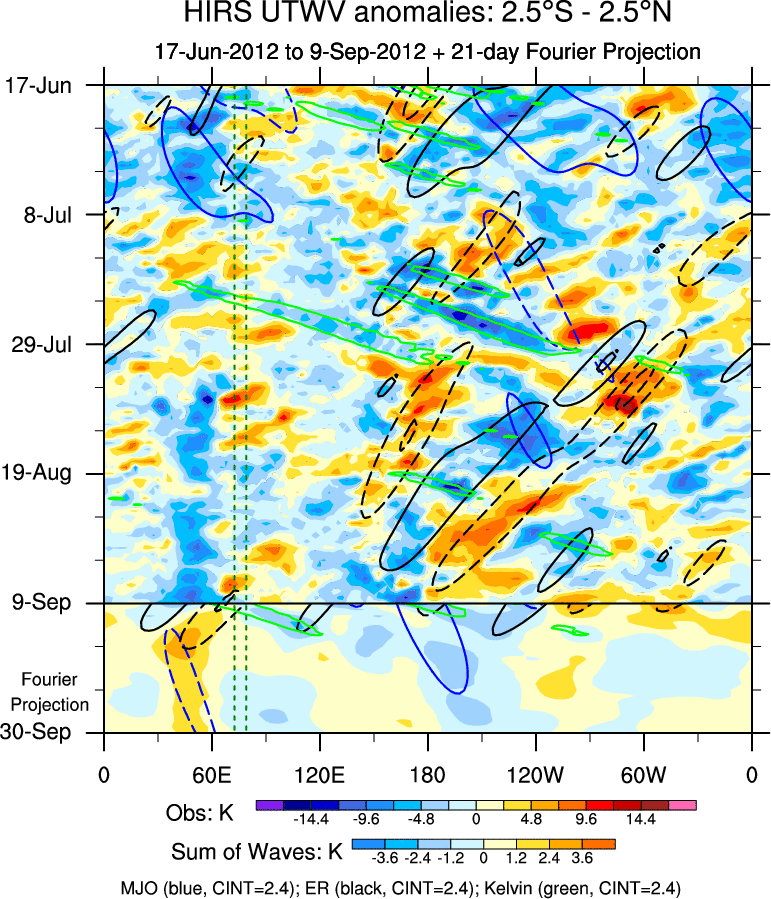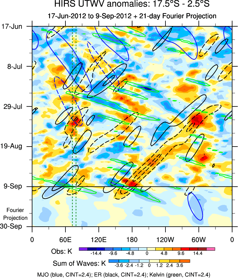 To identify tropical waves in near real-time, the OLR and UTWV data are filtered following Wheeler & Weickmann (2001 MWR). The daily anomalies are calculated using the first 3 harmonics of the seasonal cycle for 1979–2009. Missing values are then filled using linear interpolation in space and time. The most recent 365 days of anomalies are padded with 659 days of zeroes, and the result is filtered for each wave type.