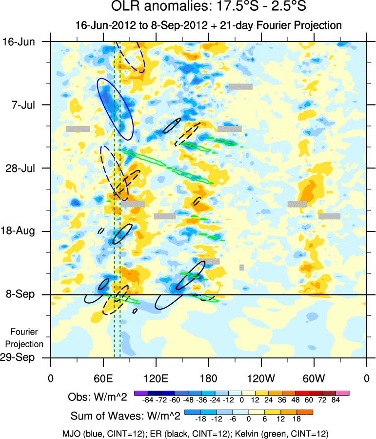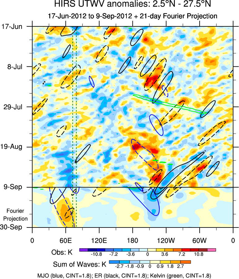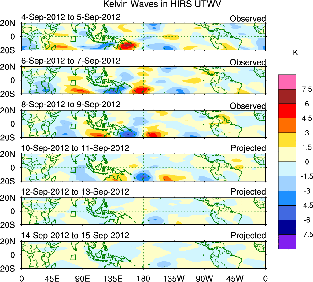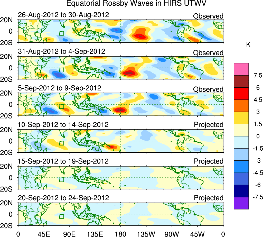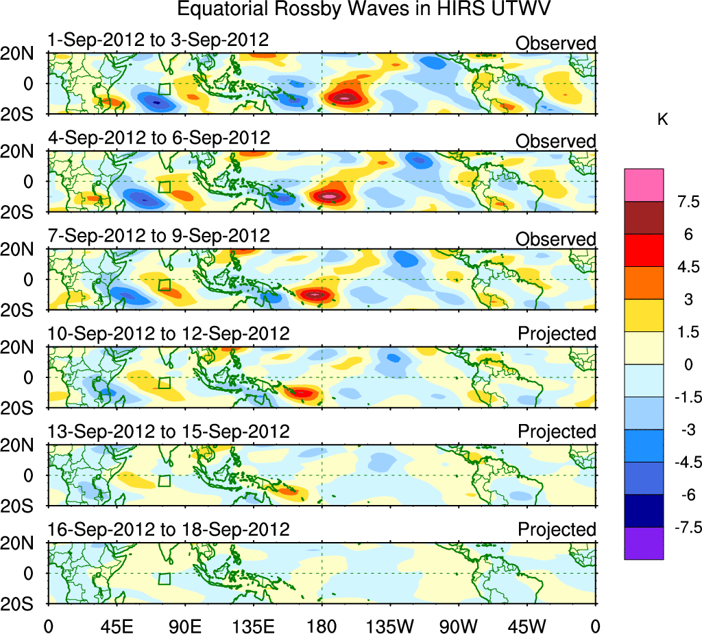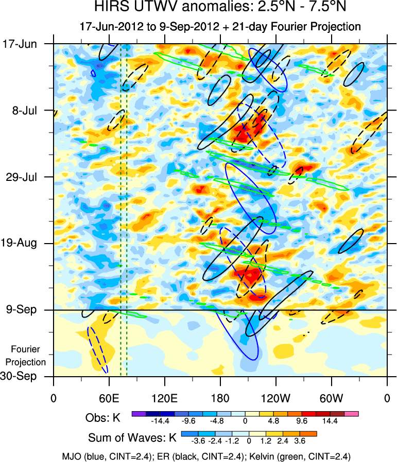 To identify tropical waves in near real-time, the OLR and UTWV data are filtered following Wheeler & Weickmann (2001 MWR). The daily anomalies are calculated using the first 3 harmonics of the seasonal cycle for 1979–2009. Missing values are then filled using linear interpolation in space and time. The most recent 365 days of anomalies are padded with 659 days of zeroes, and the result is filtered for each wave type.