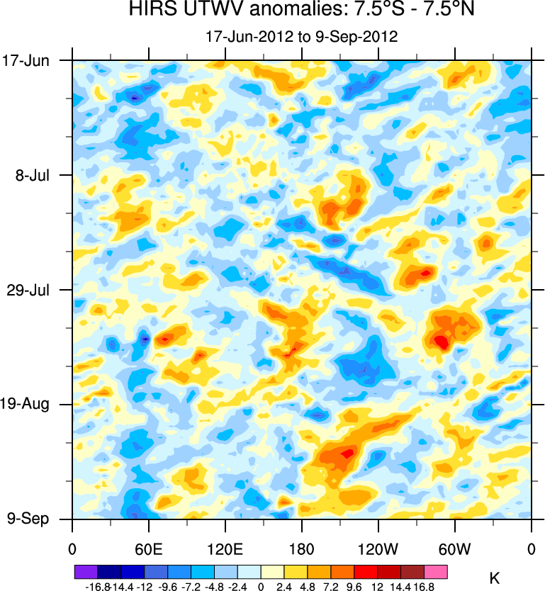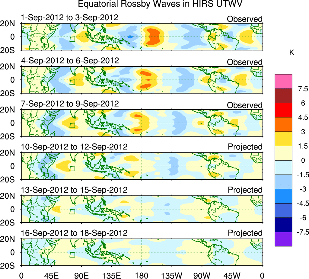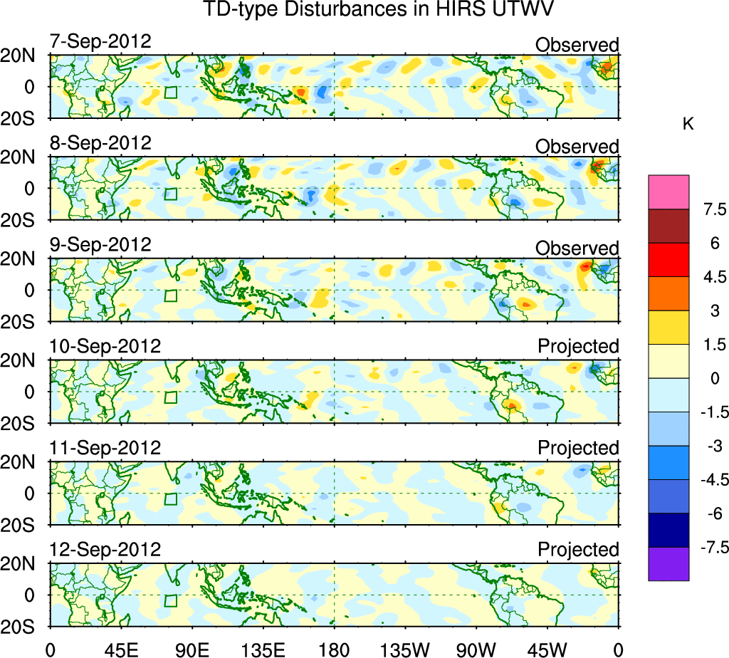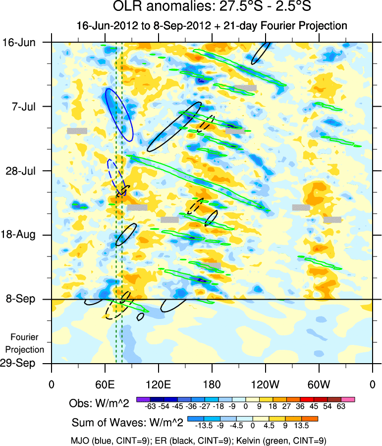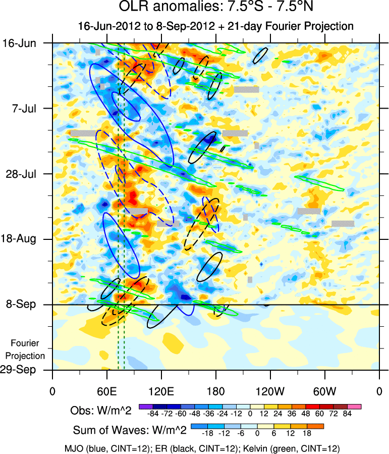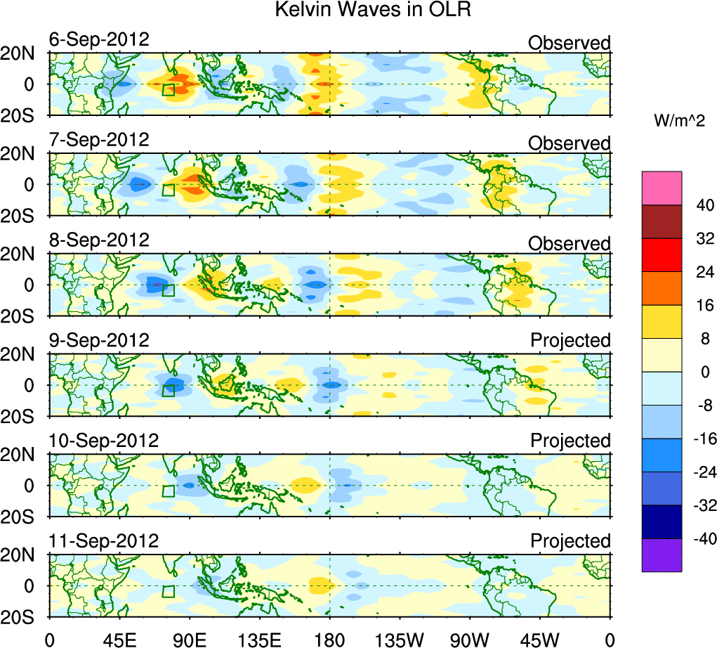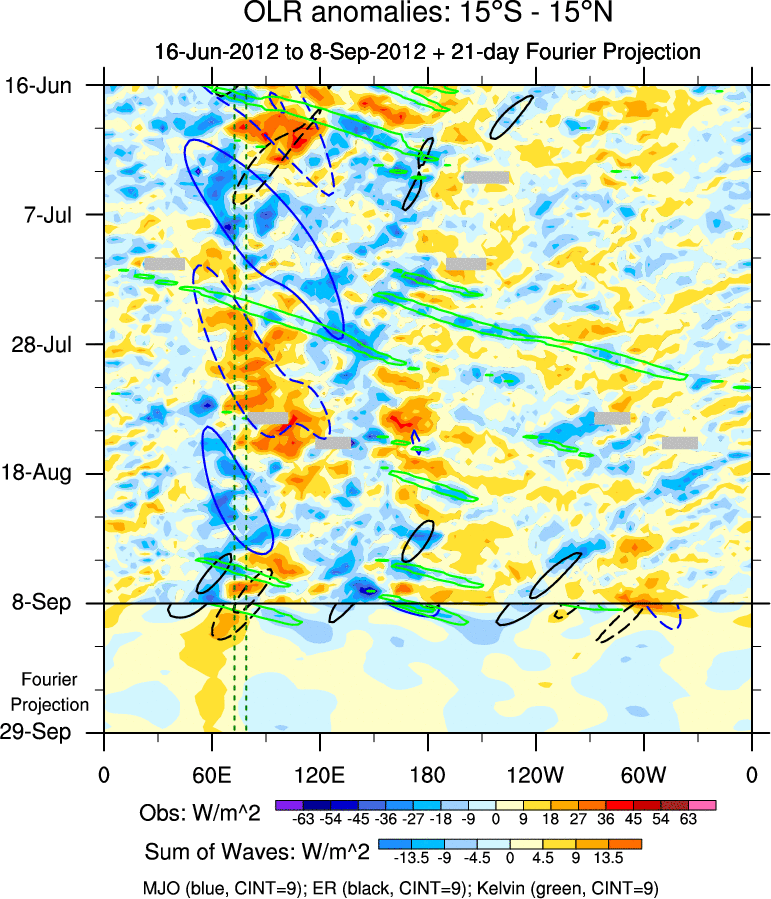 To identify tropical waves in near real-time, the OLR and UTWV data are filtered following Wheeler & Weickmann (2001 MWR). The daily anomalies are calculated using the first 3 harmonics of the seasonal cycle for 1979–2009. Missing values are then filled using linear interpolation in space and time. The most recent 365 days of anomalies are padded with 659 days of zeroes, and the result is filtered for each wave type.