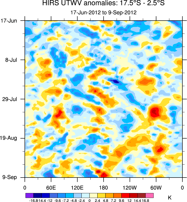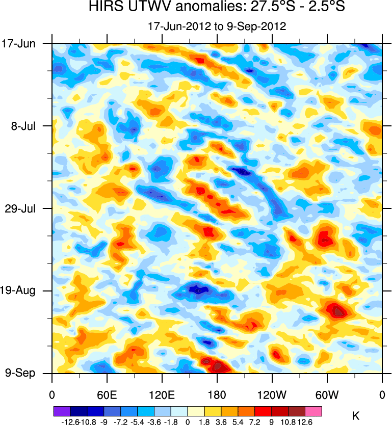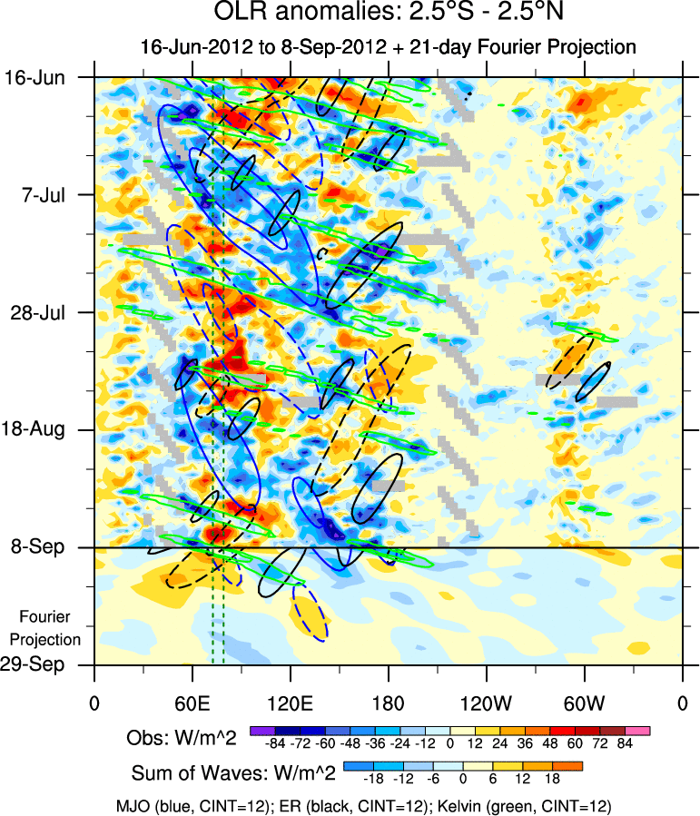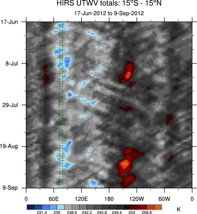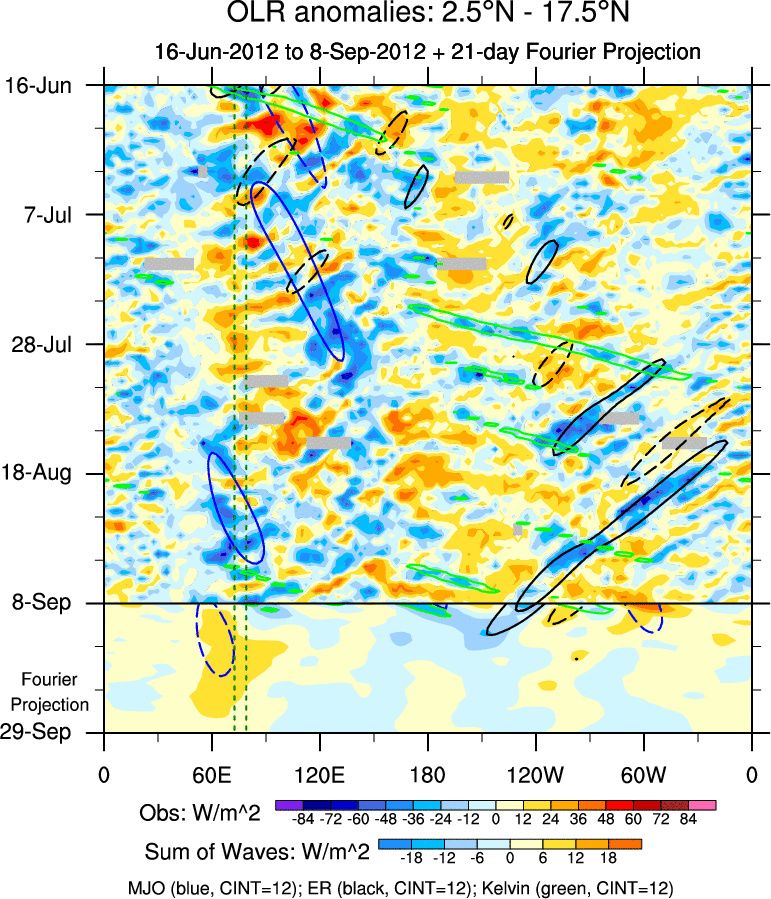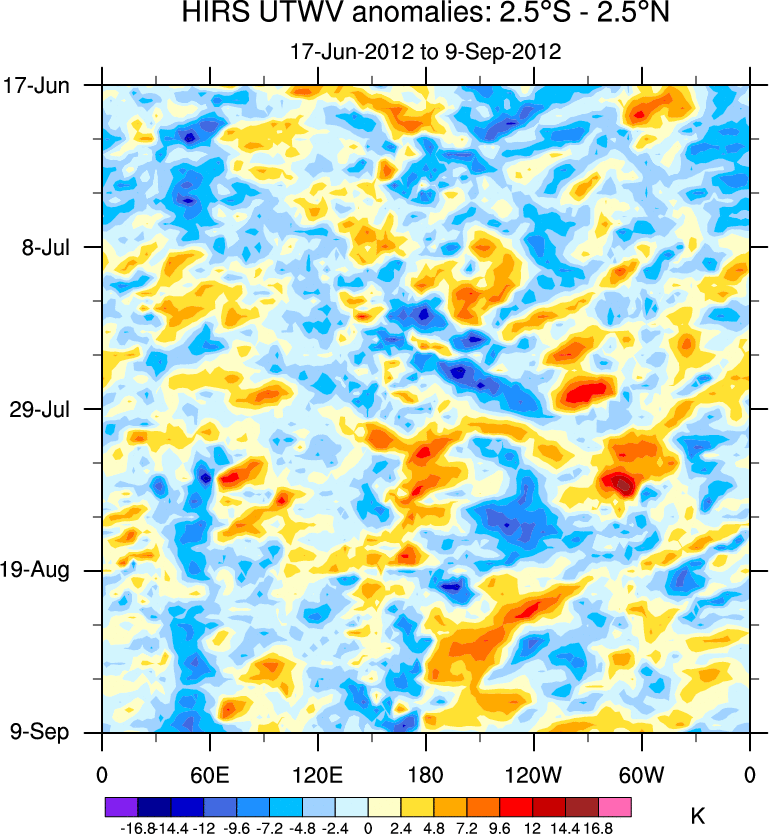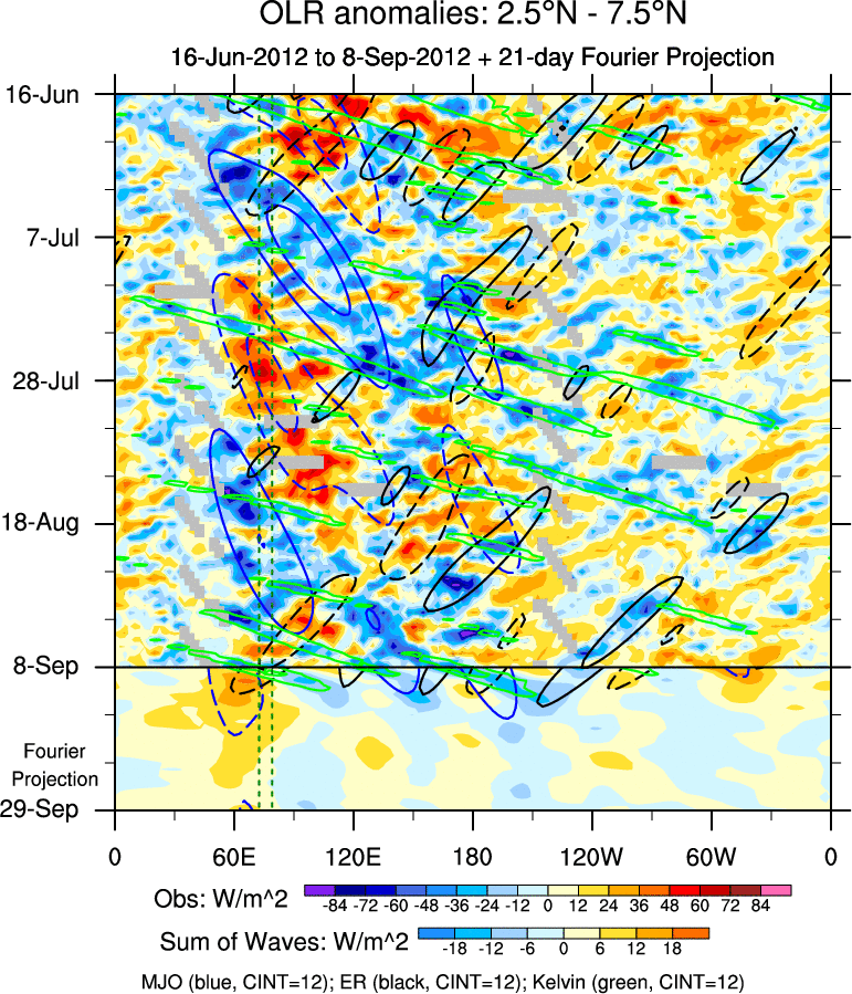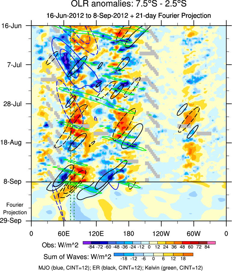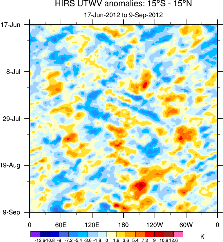 To identify tropical waves in near real-time, the OLR and UTWV data are filtered following Wheeler & Weickmann (2001 MWR). The daily anomalies are calculated using the first 3 harmonics of the seasonal cycle for 1979–2009. Missing values are then filled using linear interpolation in space and time. The most recent 365 days of anomalies are padded with 659 days of zeroes, and the result is filtered for each wave type.