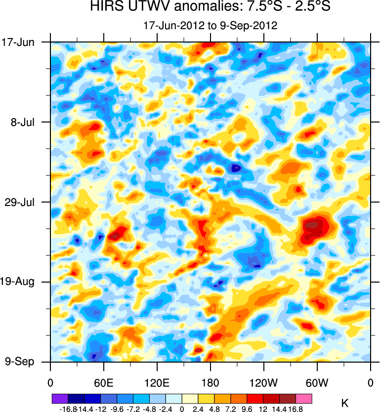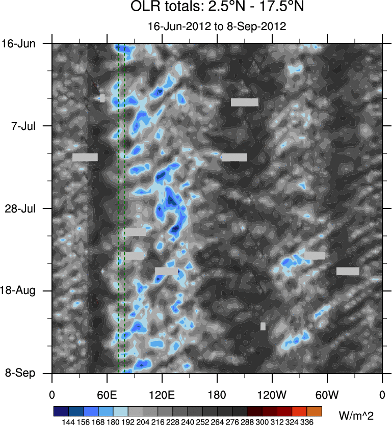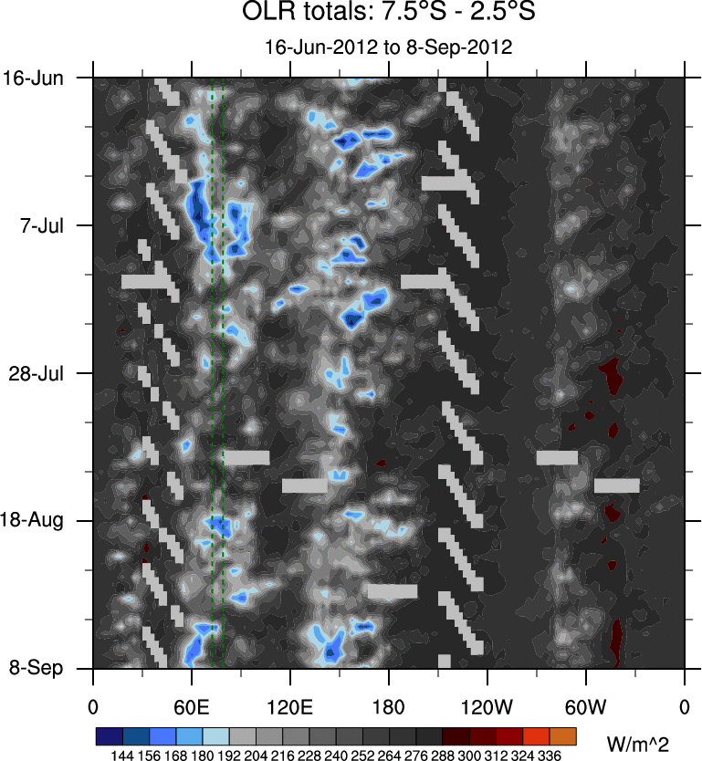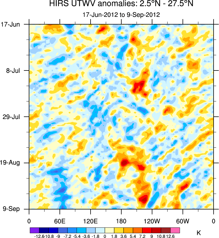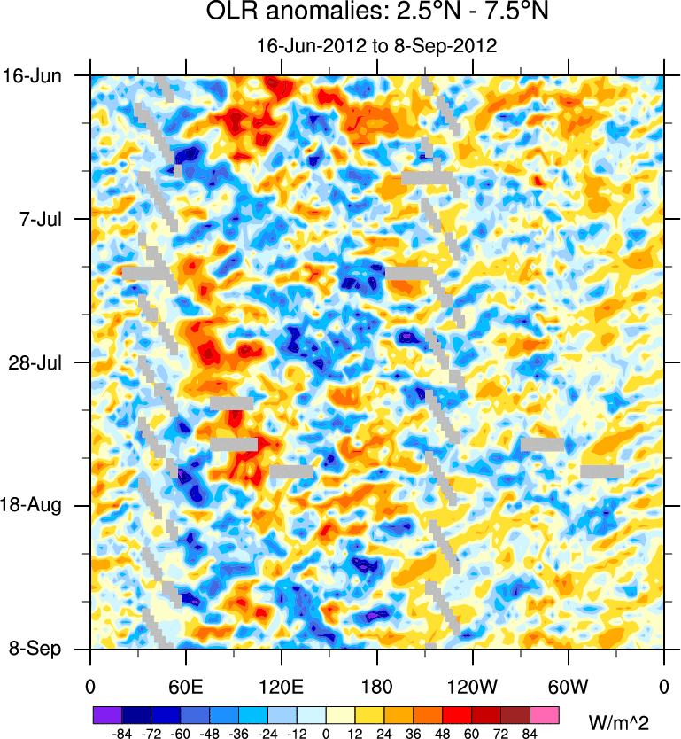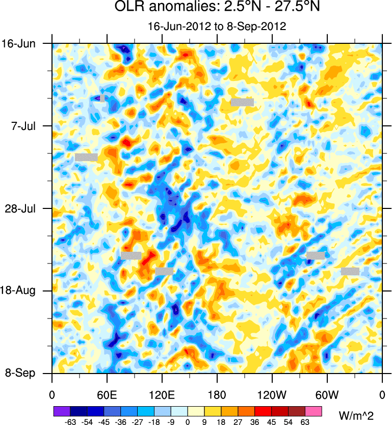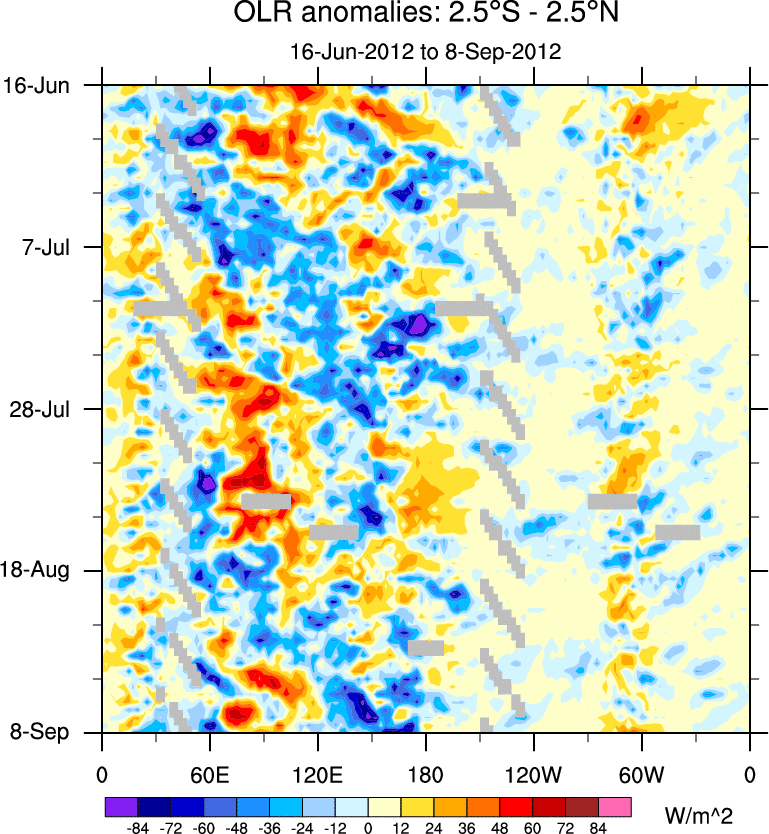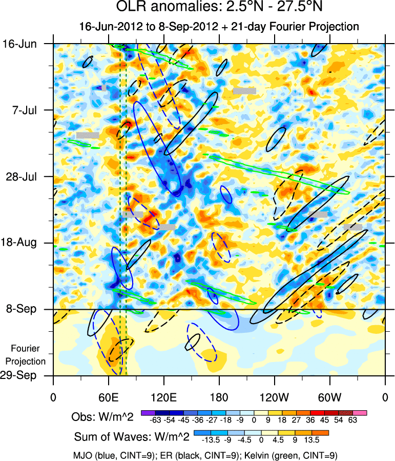 To identify tropical waves in near real-time, the OLR and UTWV data are filtered following Wheeler & Weickmann (2001 MWR). The daily anomalies are calculated using the first 3 harmonics of the seasonal cycle for 1979–2009. Missing values are then filled using linear interpolation in space and time. The most recent 365 days of anomalies are padded with 659 days of zeroes, and the result is filtered for each wave type.