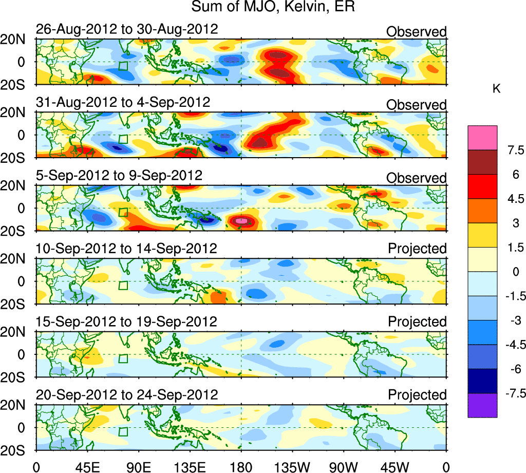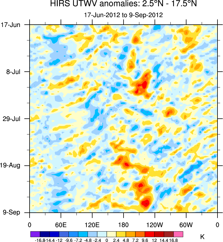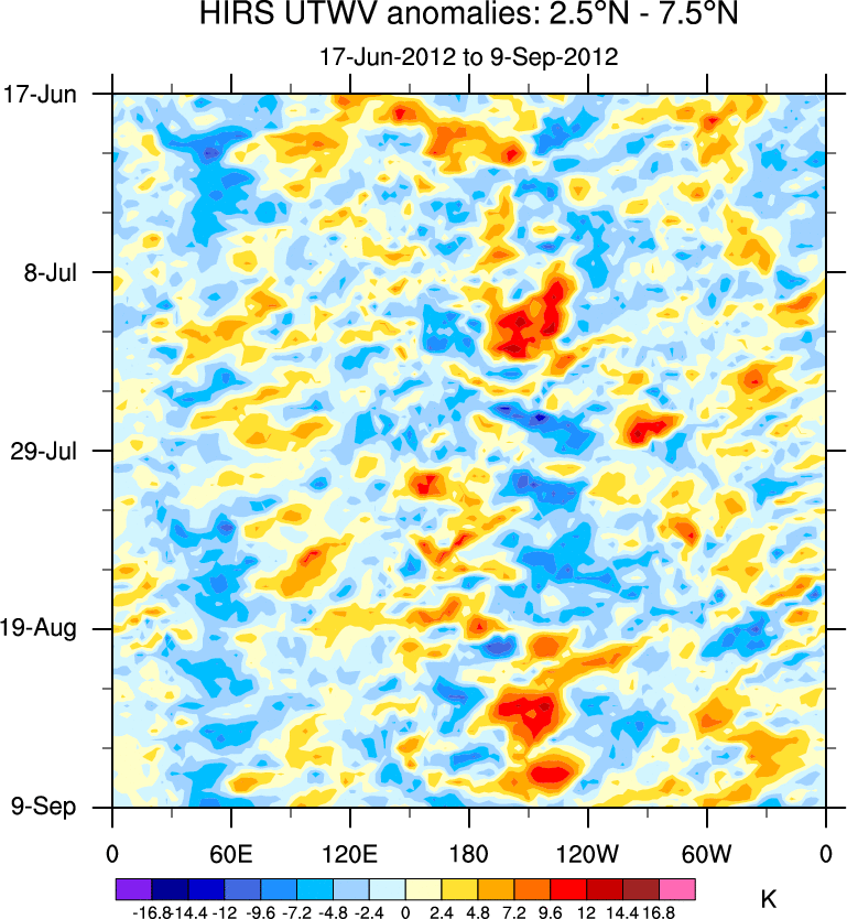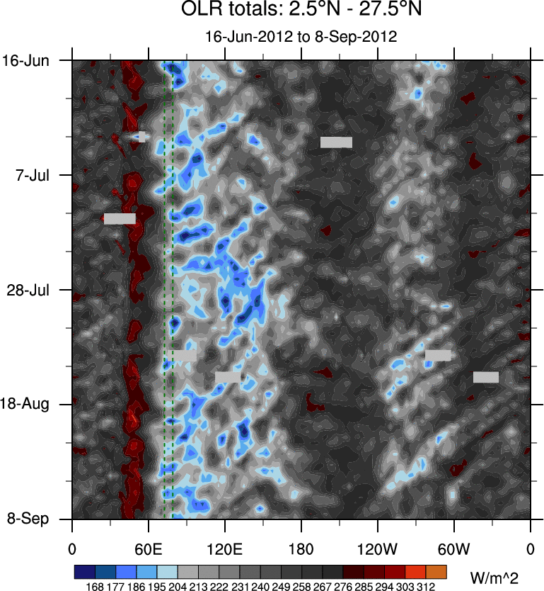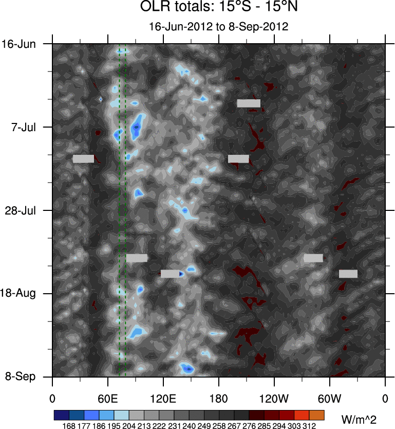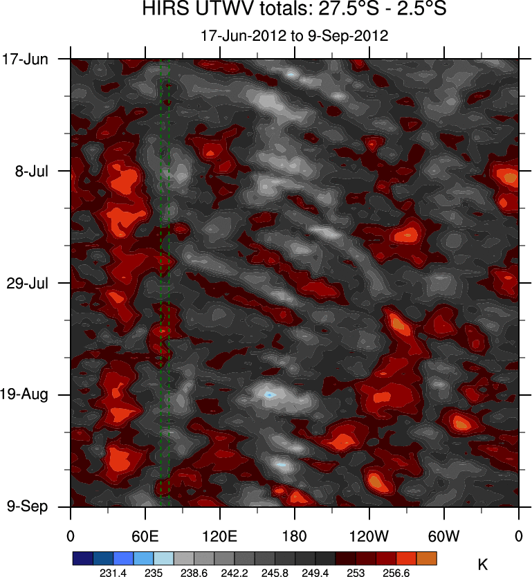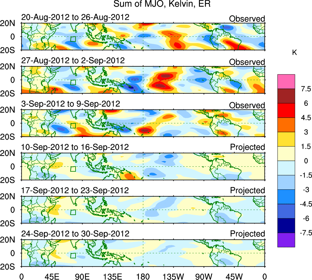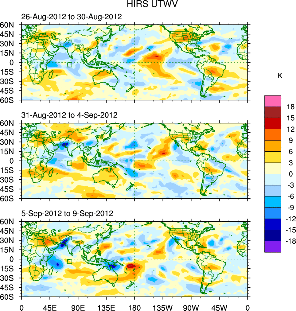 To identify tropical waves in near real-time, the OLR and UTWV data are filtered following Wheeler & Weickmann (2001 MWR). The daily anomalies are calculated using the first 3 harmonics of the seasonal cycle for 1979–2009. Missing values are then filled using linear interpolation in space and time. The most recent 365 days of anomalies are padded with 659 days of zeroes, and the result is filtered for each wave type.