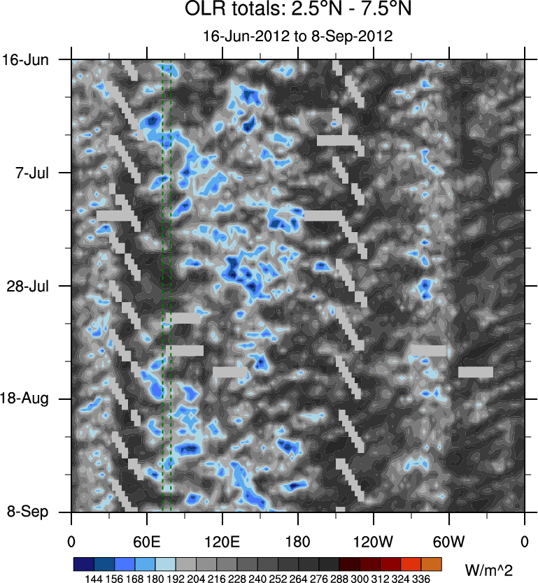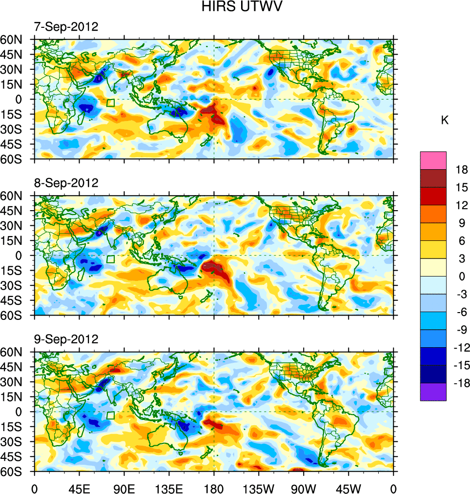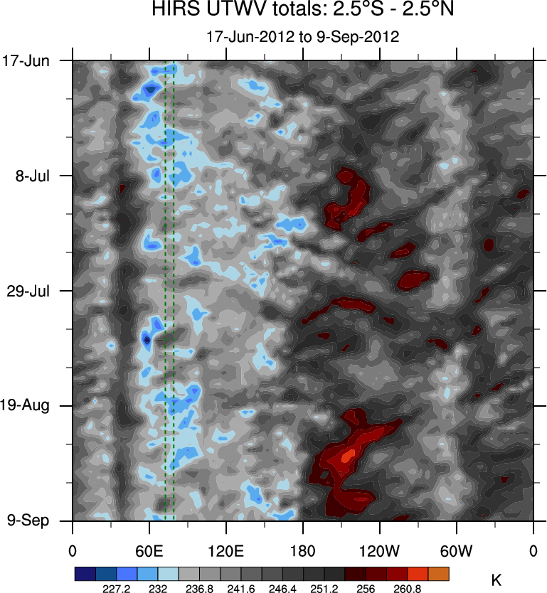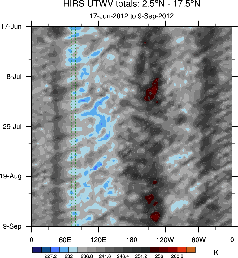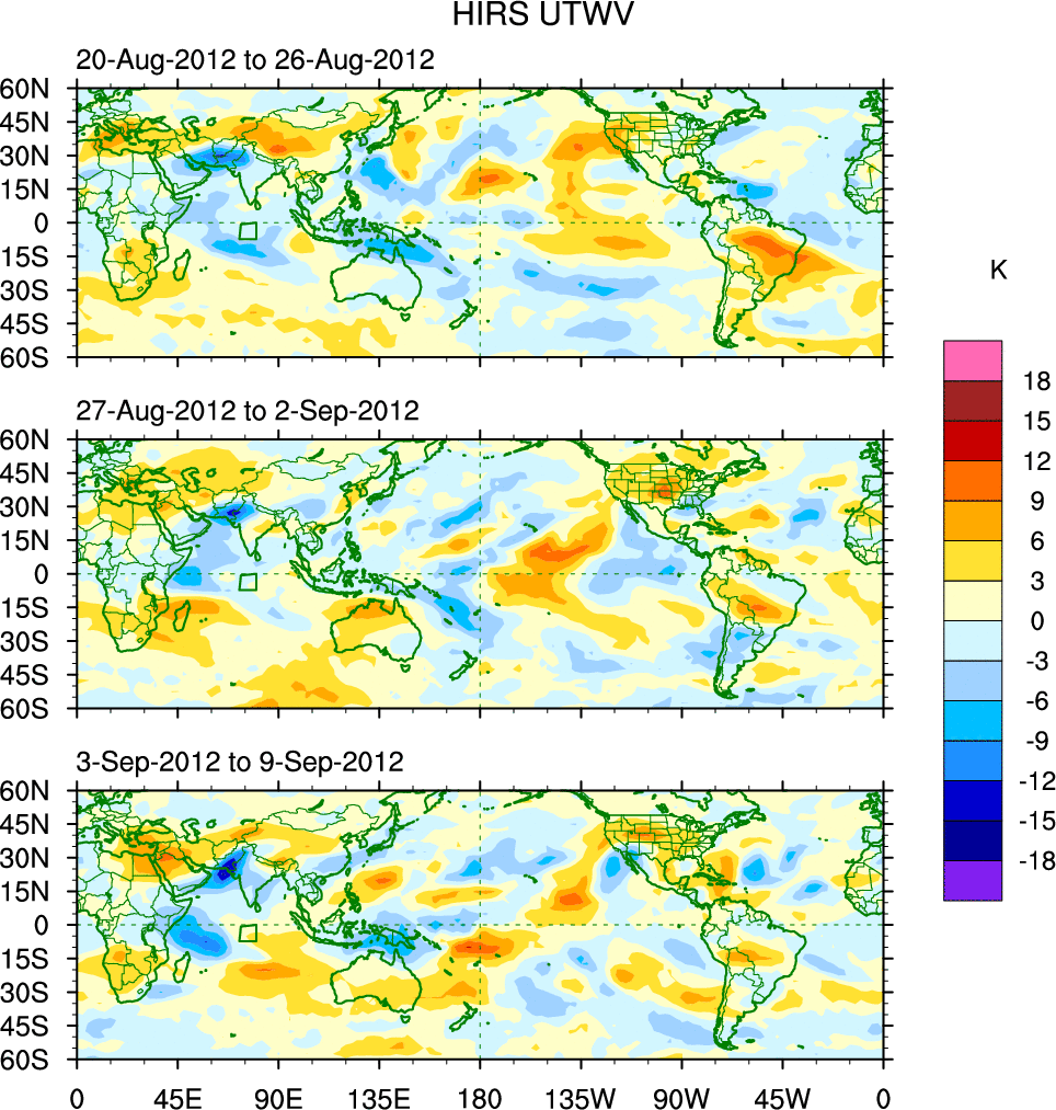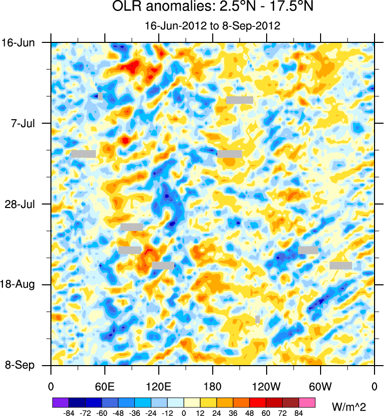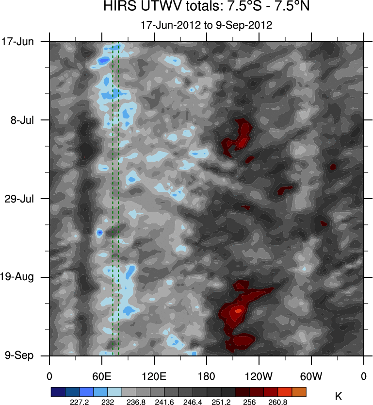 To identify tropical waves in near real-time, the OLR and UTWV data are filtered following Wheeler & Weickmann (2001 MWR). The daily anomalies are calculated using the first 3 harmonics of the seasonal cycle for 1979–2009. Missing values are then filled using linear interpolation in space and time. The most recent 365 days of anomalies are padded with 659 days of zeroes, and the result is filtered for each wave type.