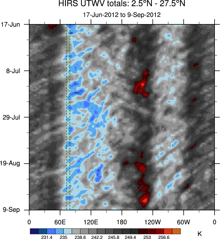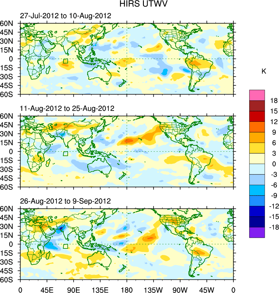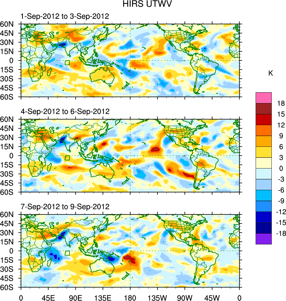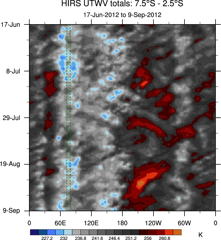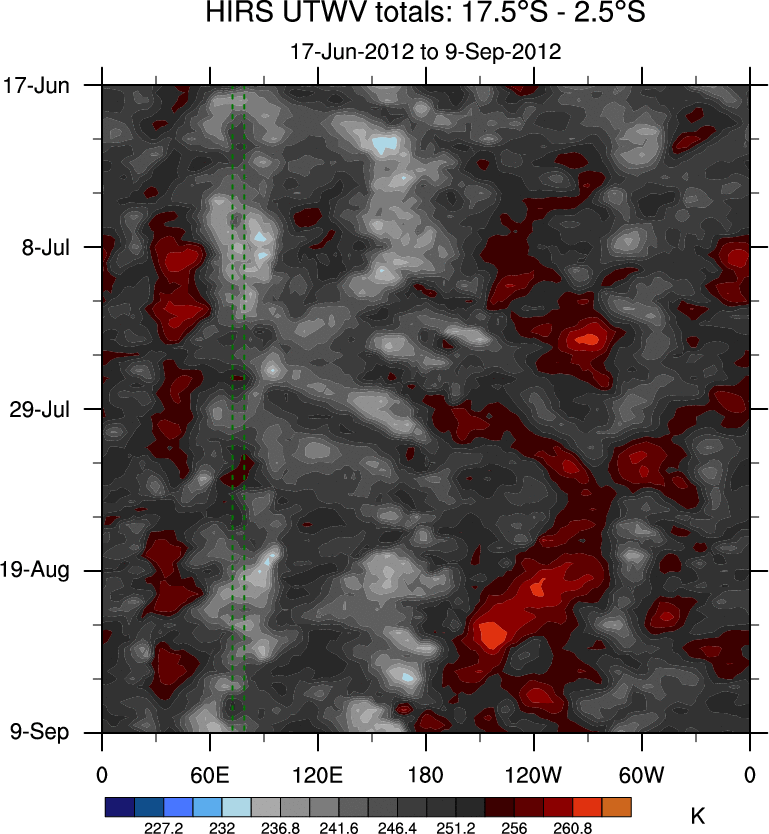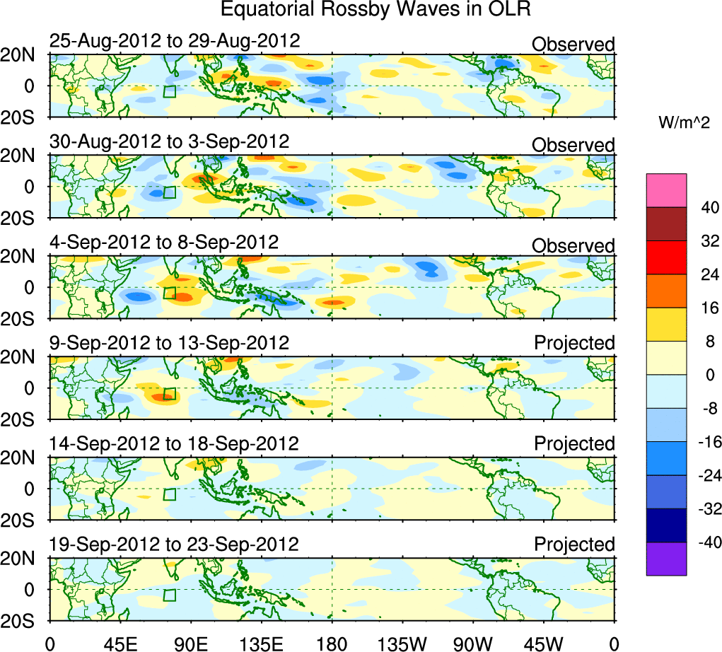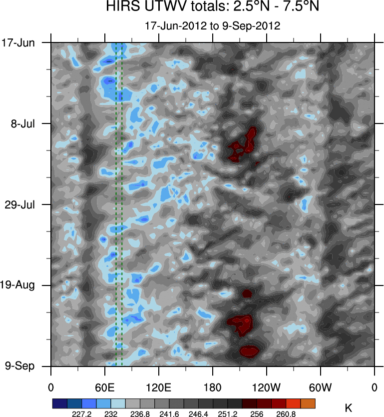To identify tropical waves in near real-time, the OLR and UTWV data are filtered following Wheeler & Weickmann (2001 MWR). The daily anomalies are calculated using the first 3 harmonics of the seasonal cycle for 1979–2009. Missing values are then filled using linear interpolation in space and time. The most recent 365 days of anomalies are padded with 659 days of zeroes, and the result is filtered for each wave type.