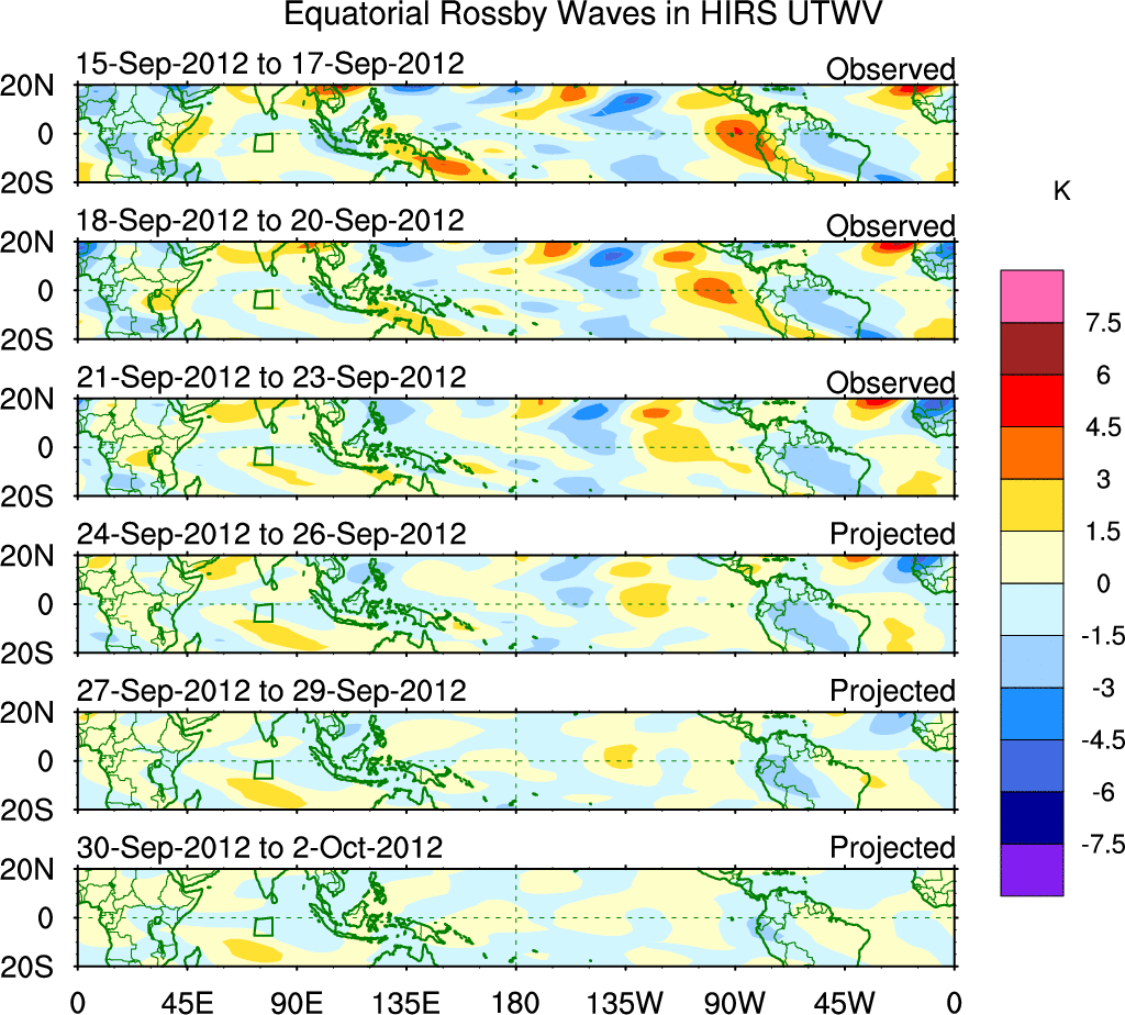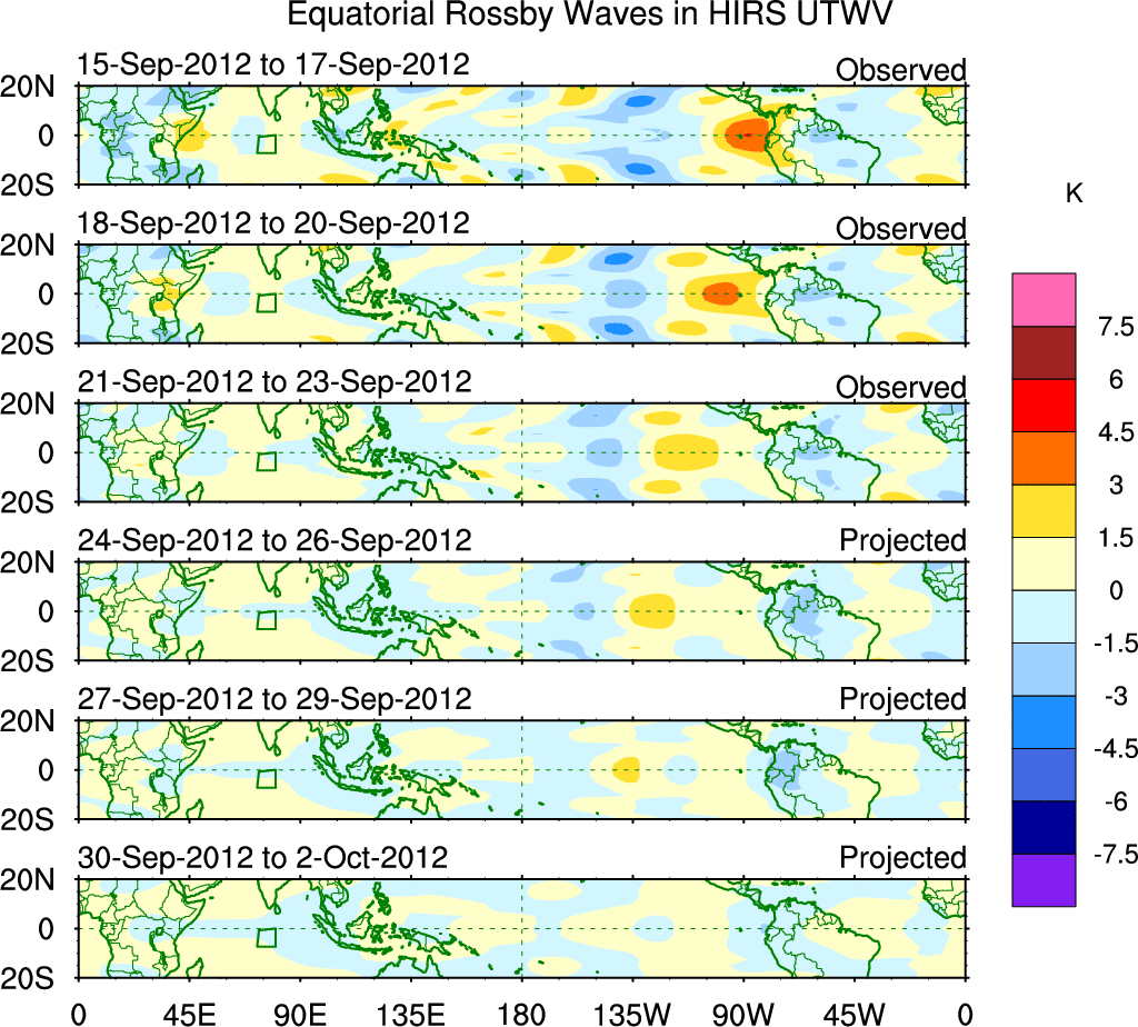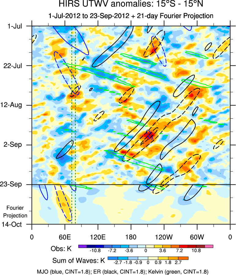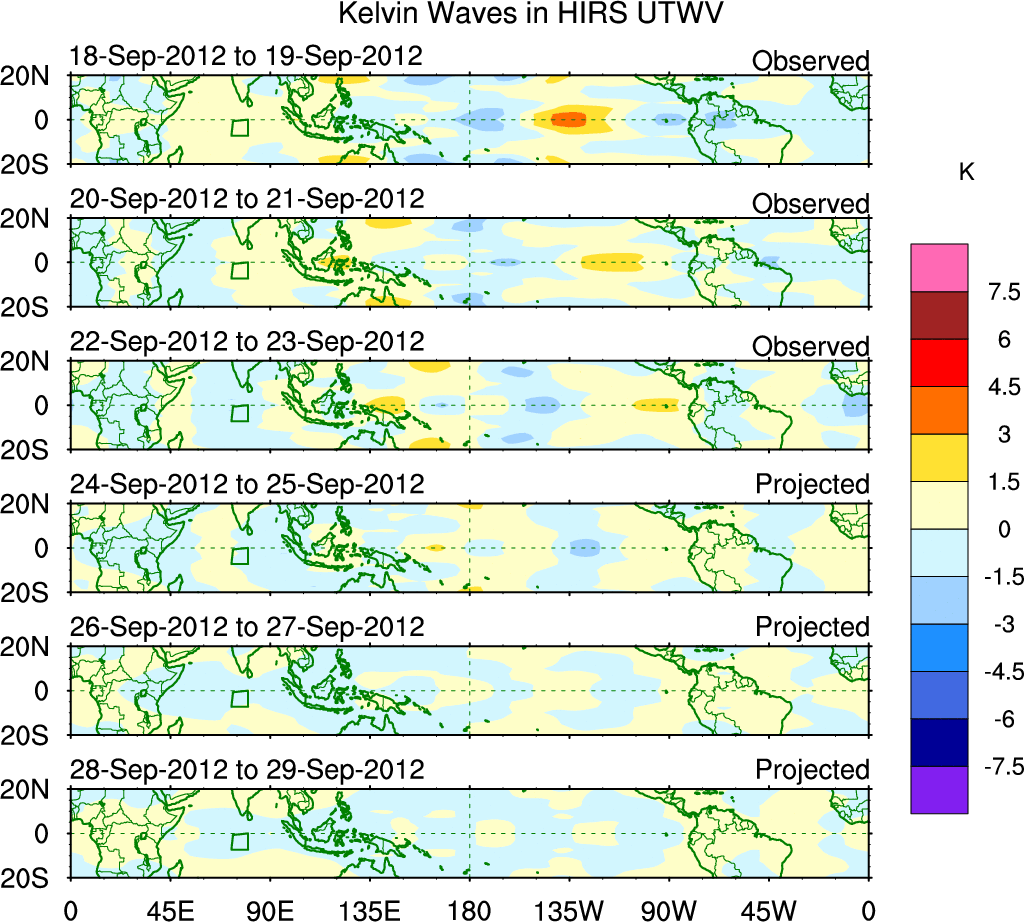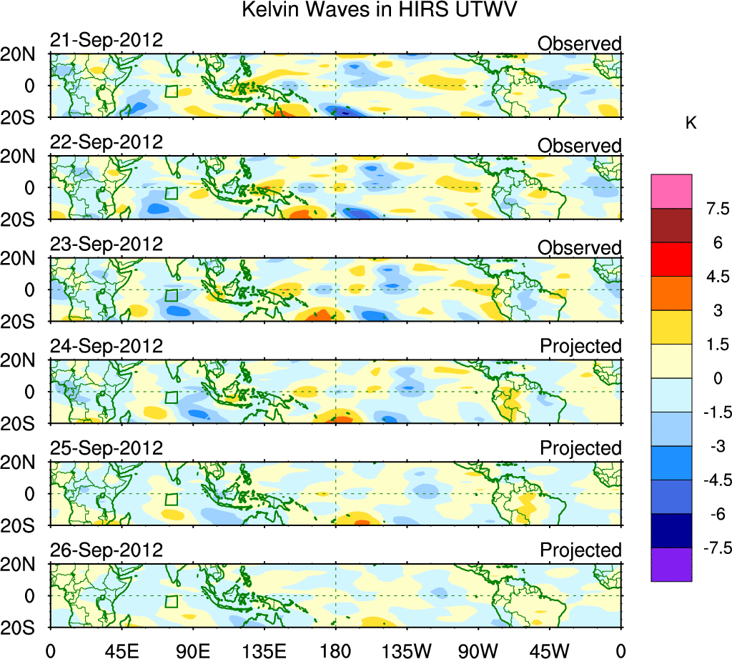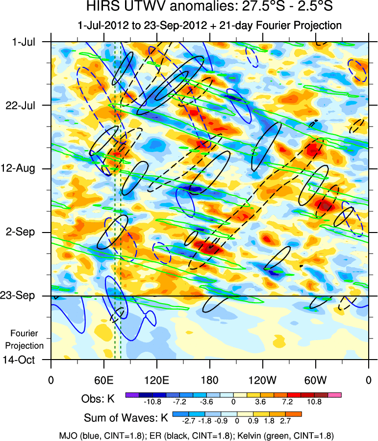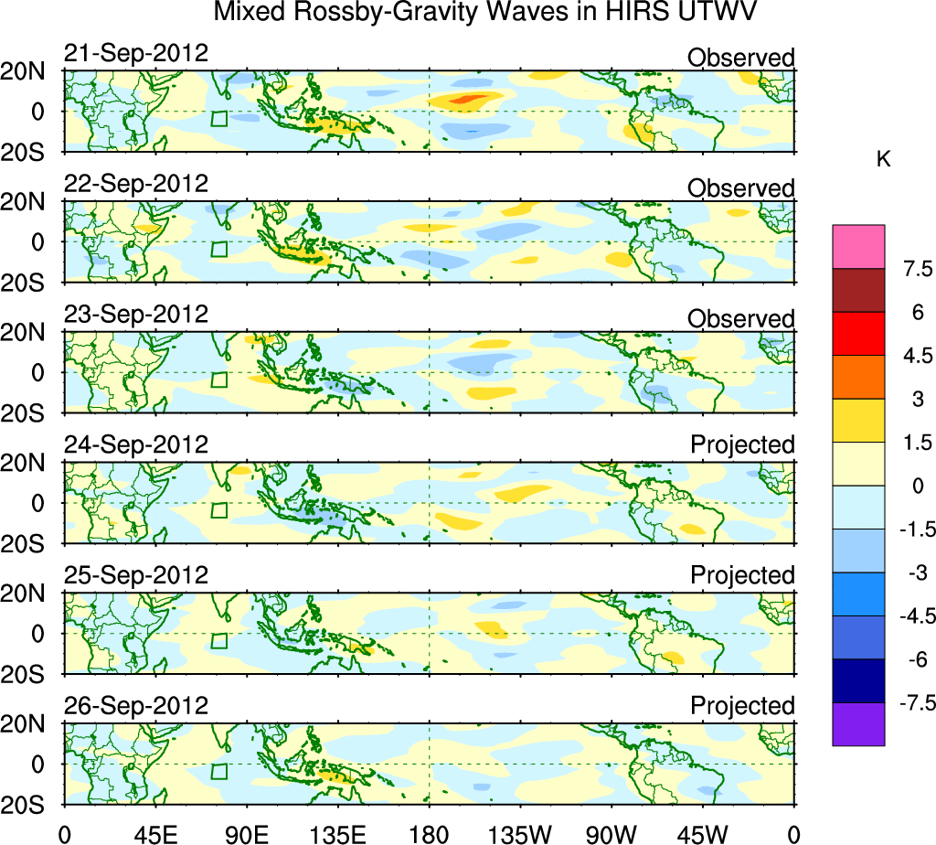 To identify tropical waves in near real-time, the OLR and UTWV data are filtered following Wheeler & Weickmann (2001 MWR). The daily anomalies are calculated using the first 3 harmonics of the seasonal cycle for 1979–2009. Missing values are then filled using linear interpolation in space and time. The most recent 365 days of anomalies are padded with 659 days of zeroes, and the result is filtered for each wave type.