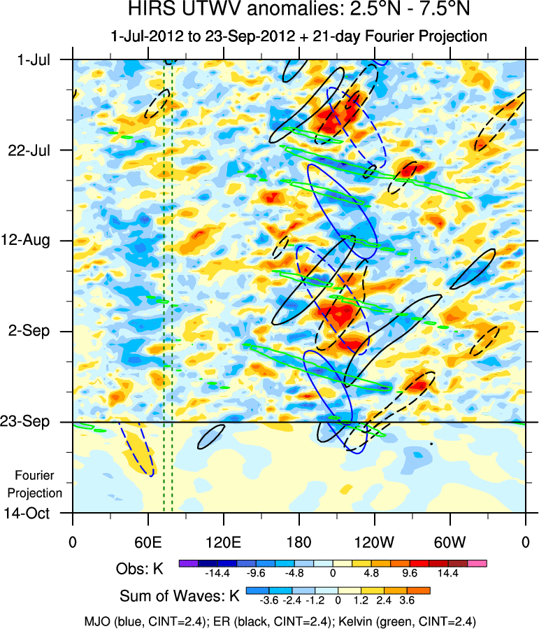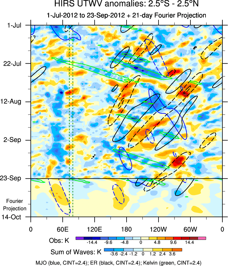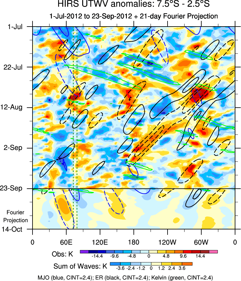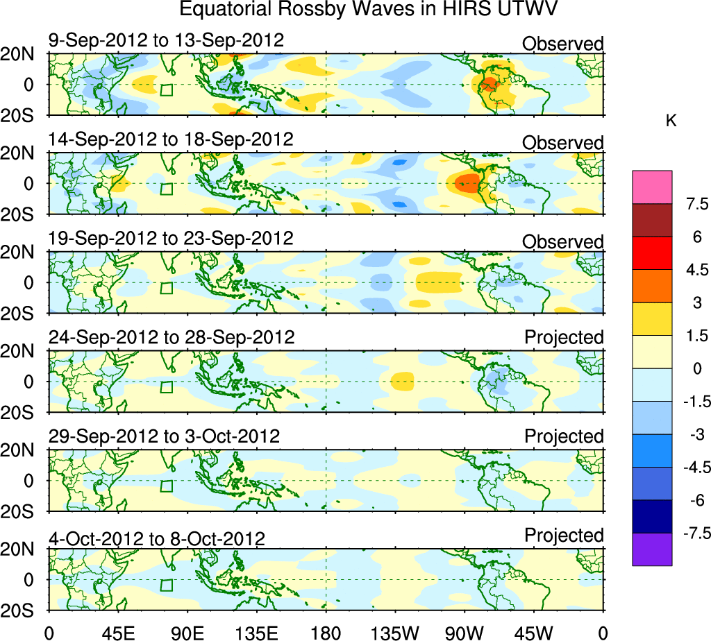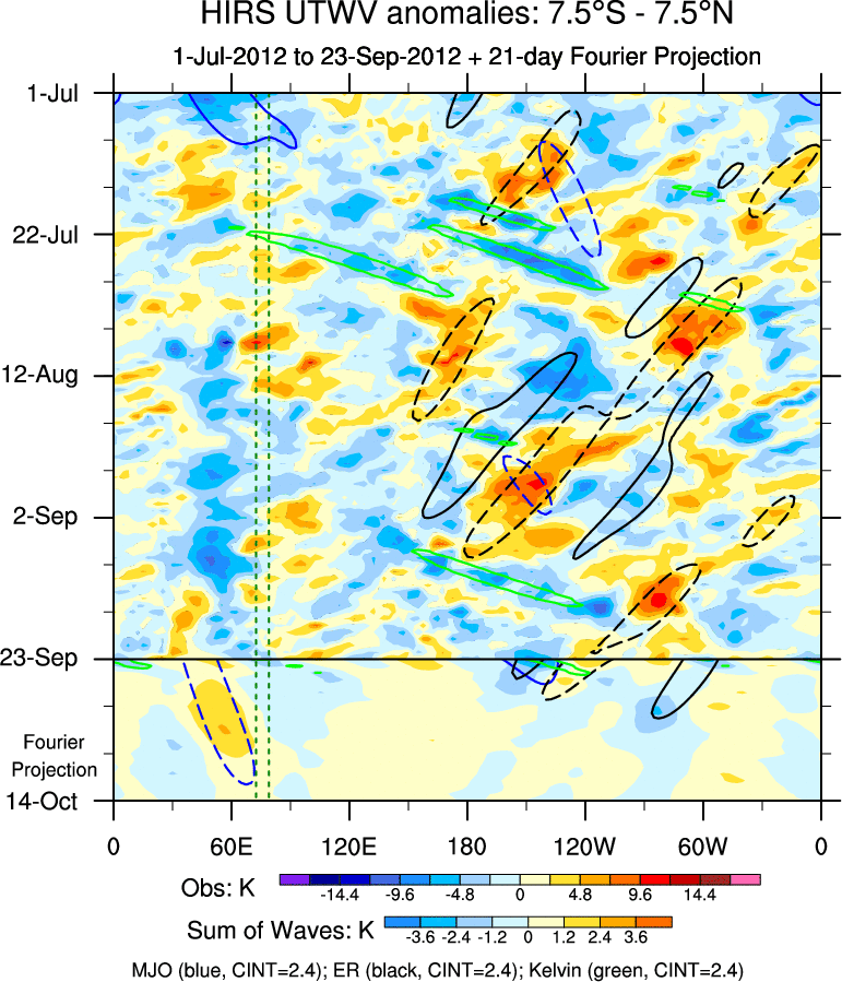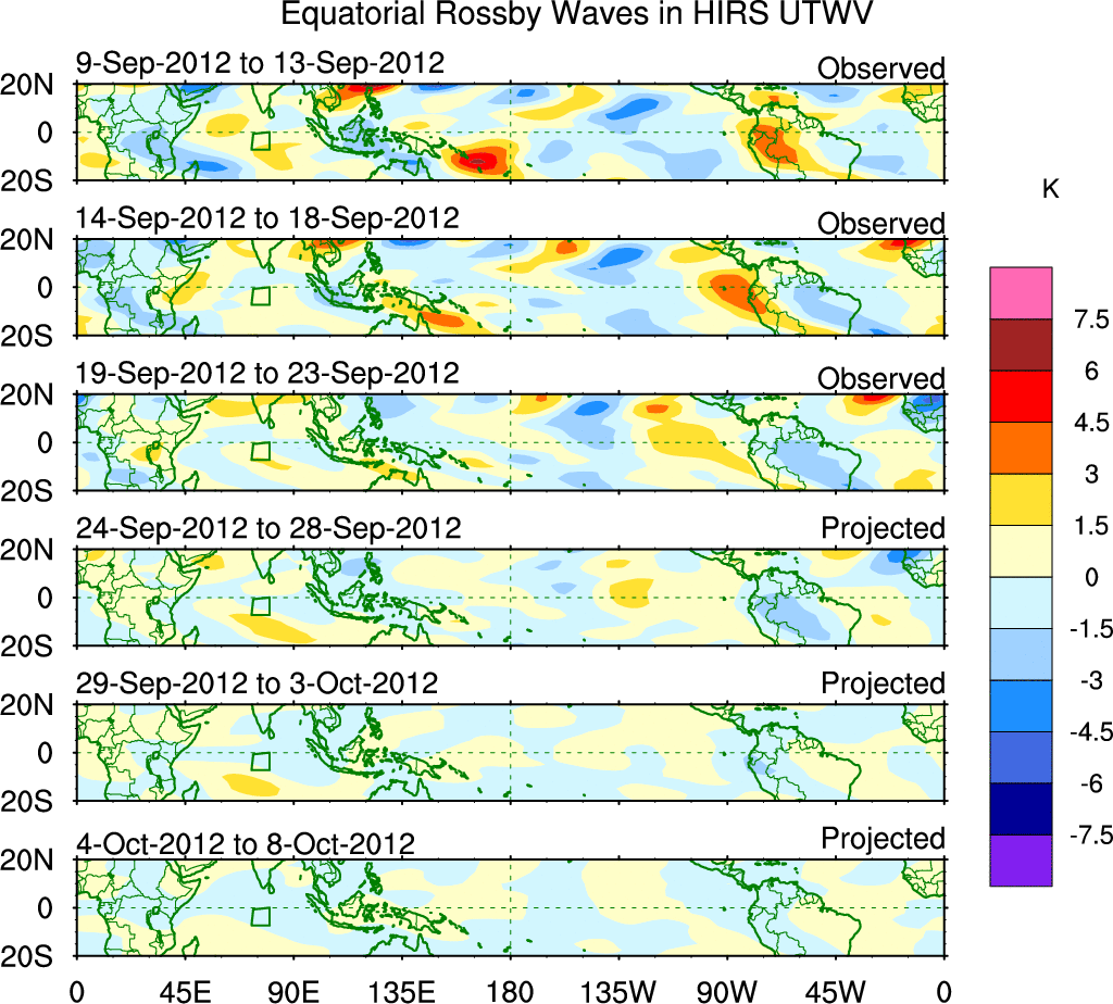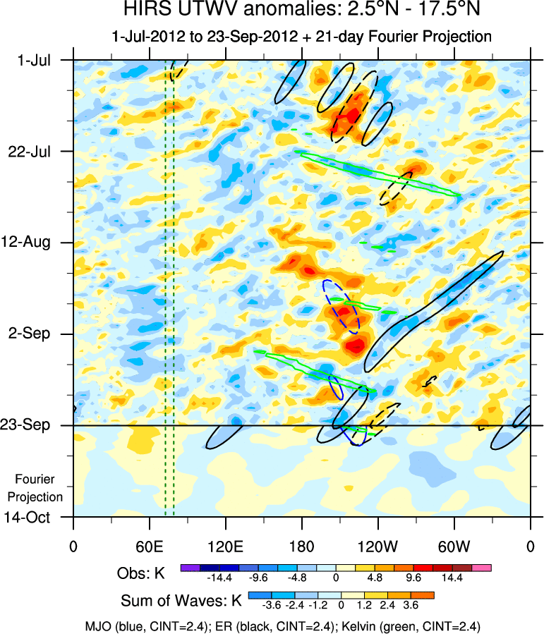 To identify tropical waves in near real-time, the OLR and UTWV data are filtered following Wheeler & Weickmann (2001 MWR). The daily anomalies are calculated using the first 3 harmonics of the seasonal cycle for 1979–2009. Missing values are then filled using linear interpolation in space and time. The most recent 365 days of anomalies are padded with 659 days of zeroes, and the result is filtered for each wave type.