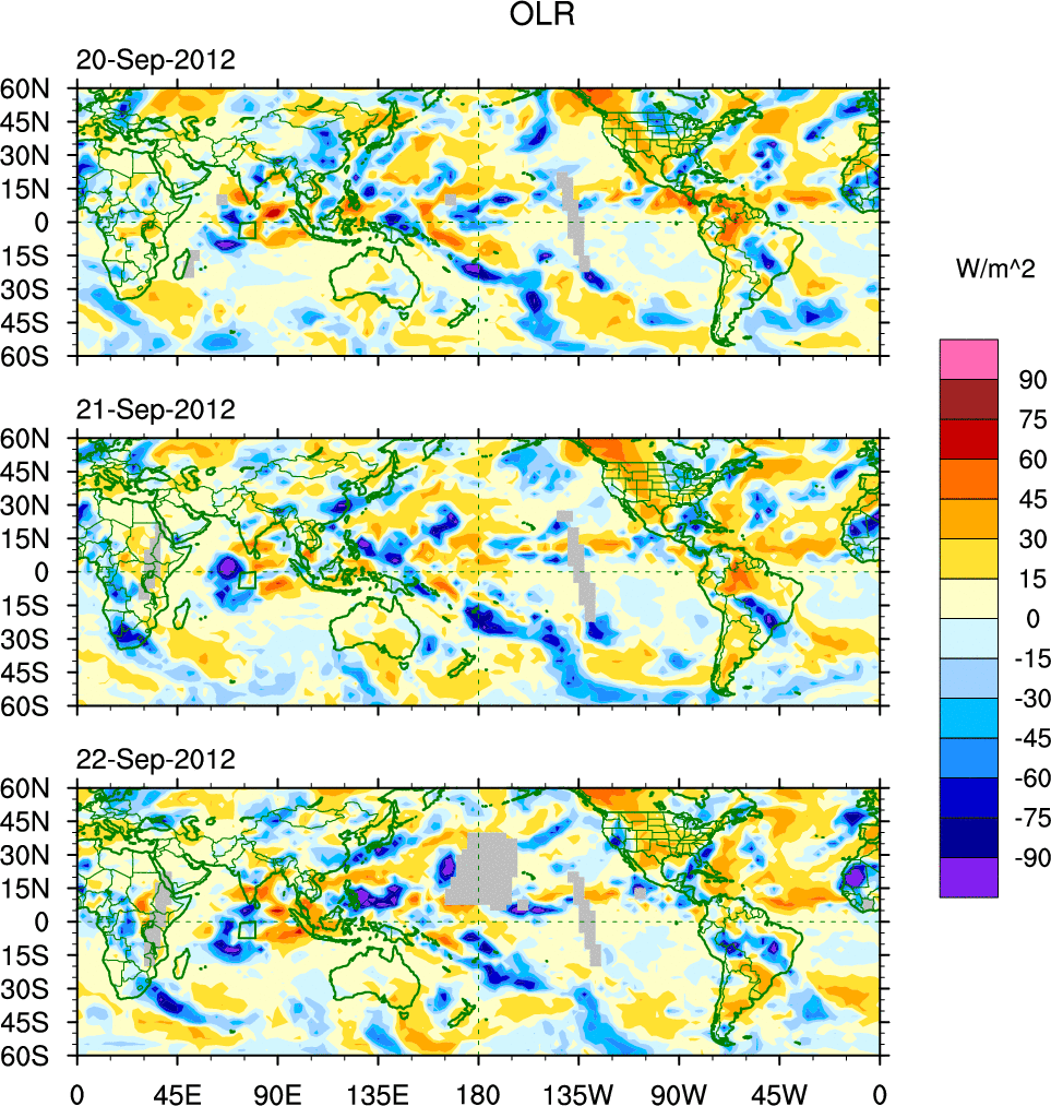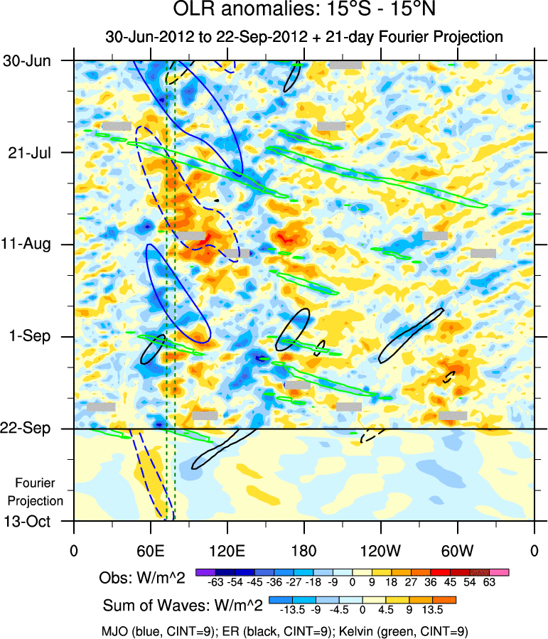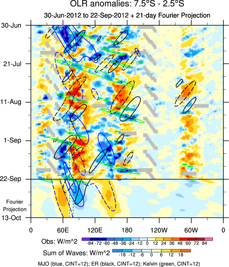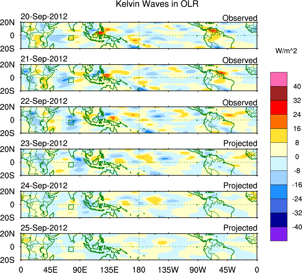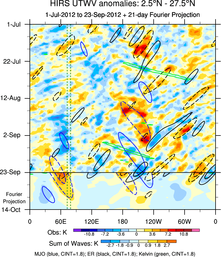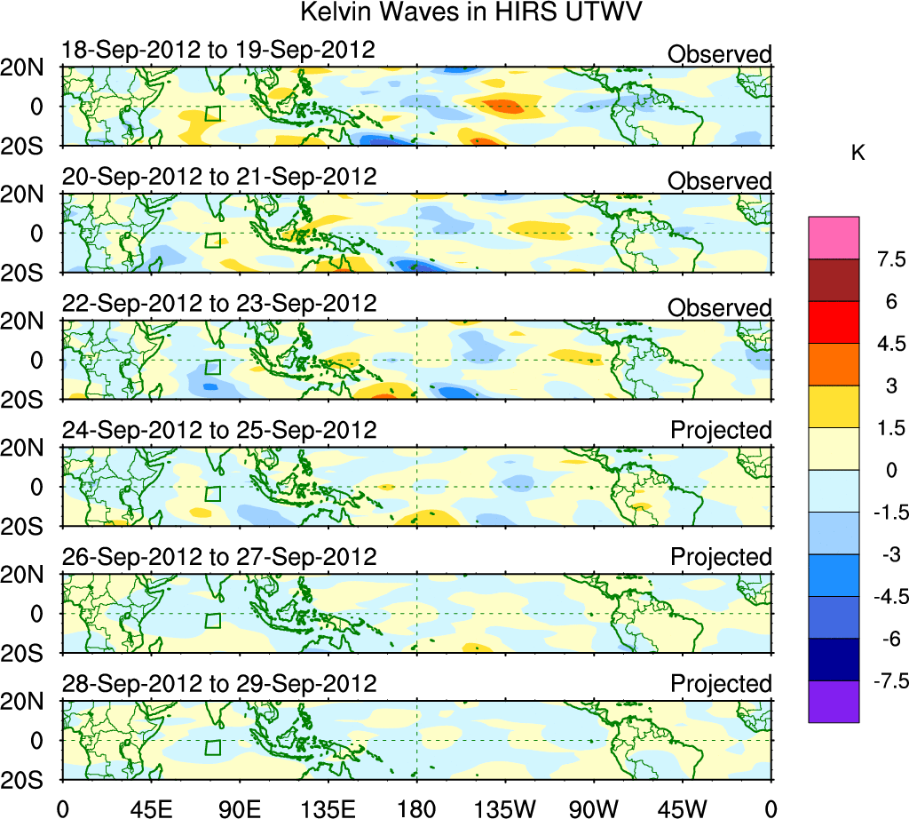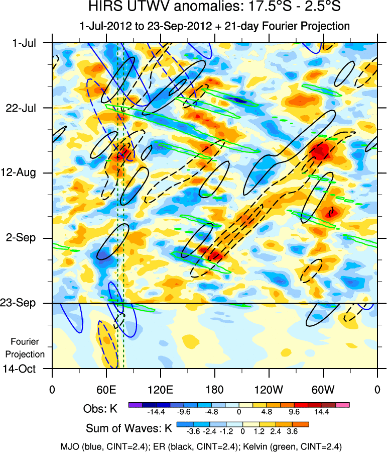 To identify tropical waves in near real-time, the OLR and UTWV data are filtered following Wheeler & Weickmann (2001 MWR). The daily anomalies are calculated using the first 3 harmonics of the seasonal cycle for 1979–2009. Missing values are then filled using linear interpolation in space and time. The most recent 365 days of anomalies are padded with 659 days of zeroes, and the result is filtered for each wave type.