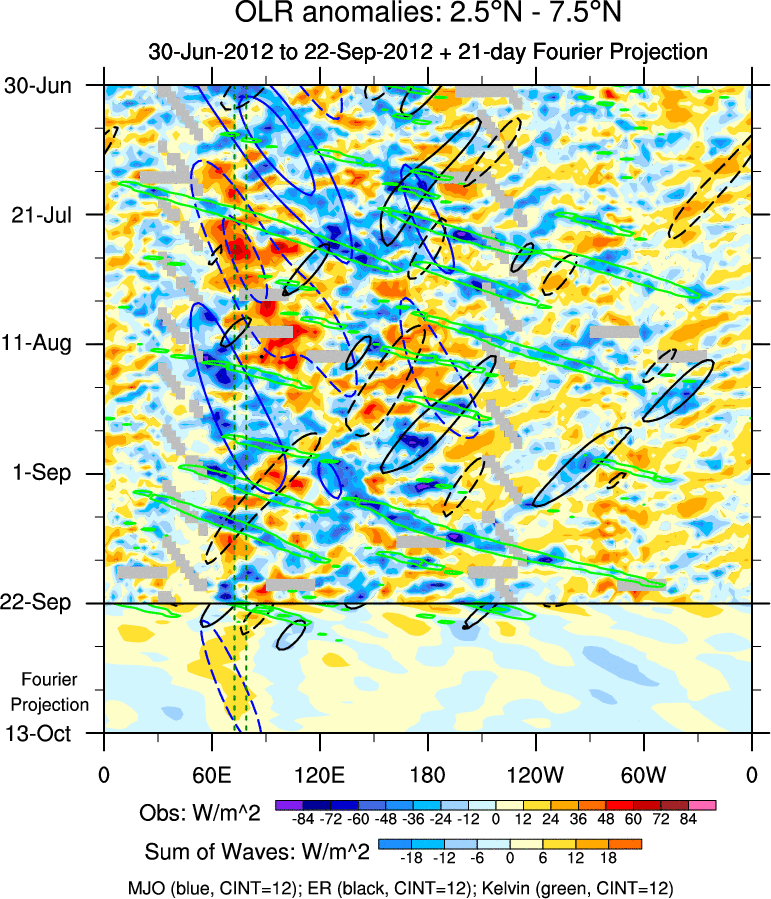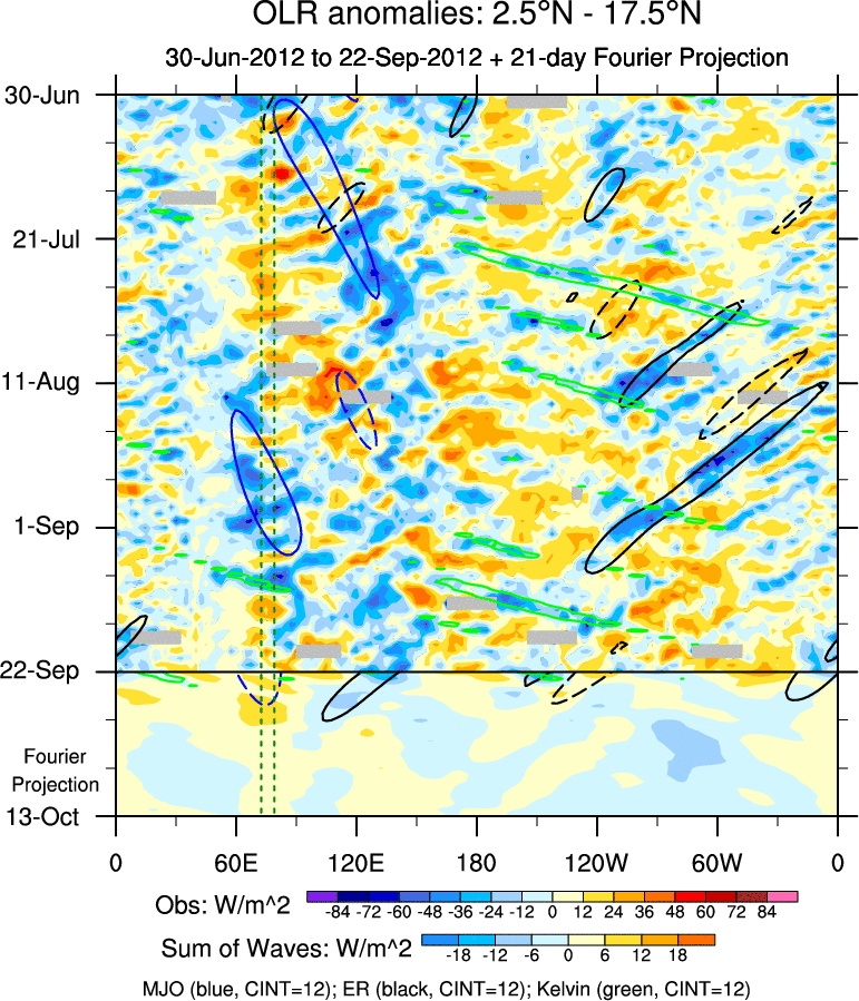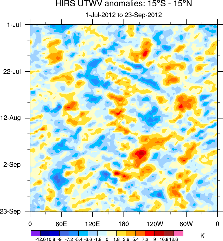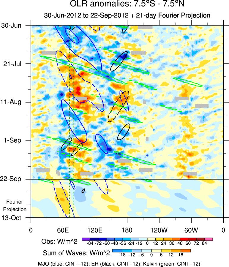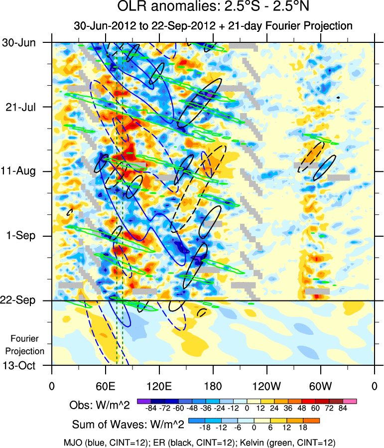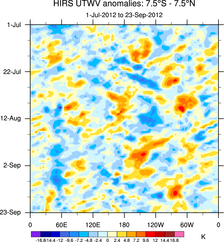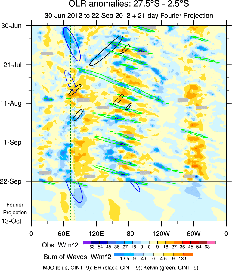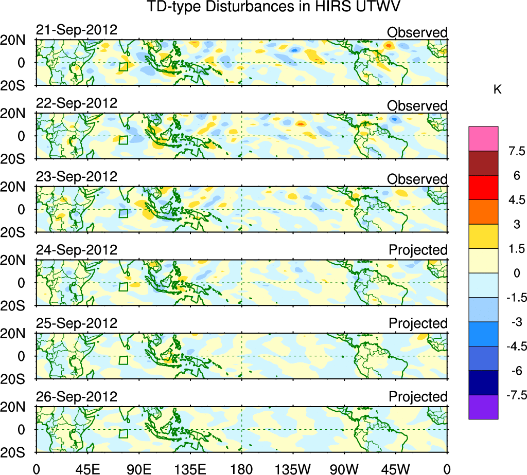 To identify tropical waves in near real-time, the OLR and UTWV data are filtered following Wheeler & Weickmann (2001 MWR). The daily anomalies are calculated using the first 3 harmonics of the seasonal cycle for 1979–2009. Missing values are then filled using linear interpolation in space and time. The most recent 365 days of anomalies are padded with 659 days of zeroes, and the result is filtered for each wave type.