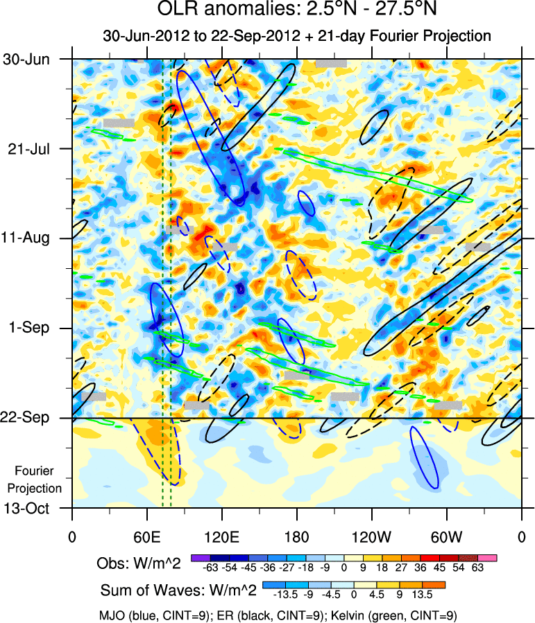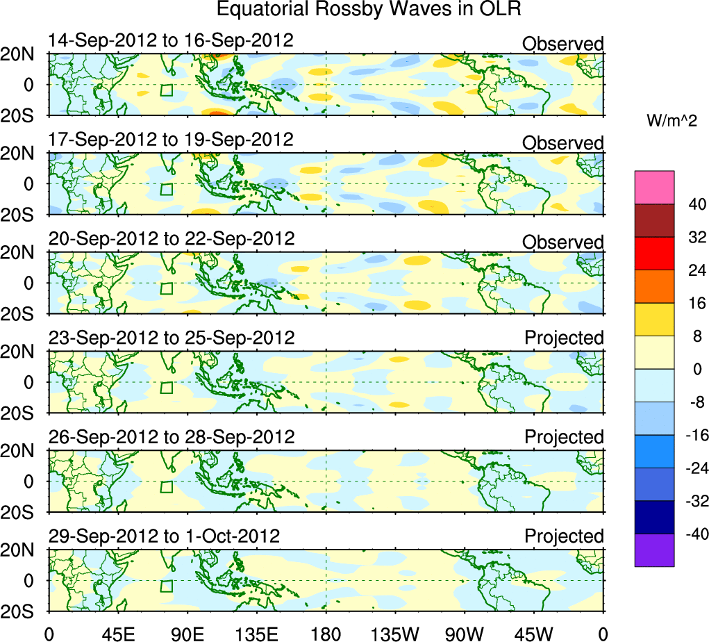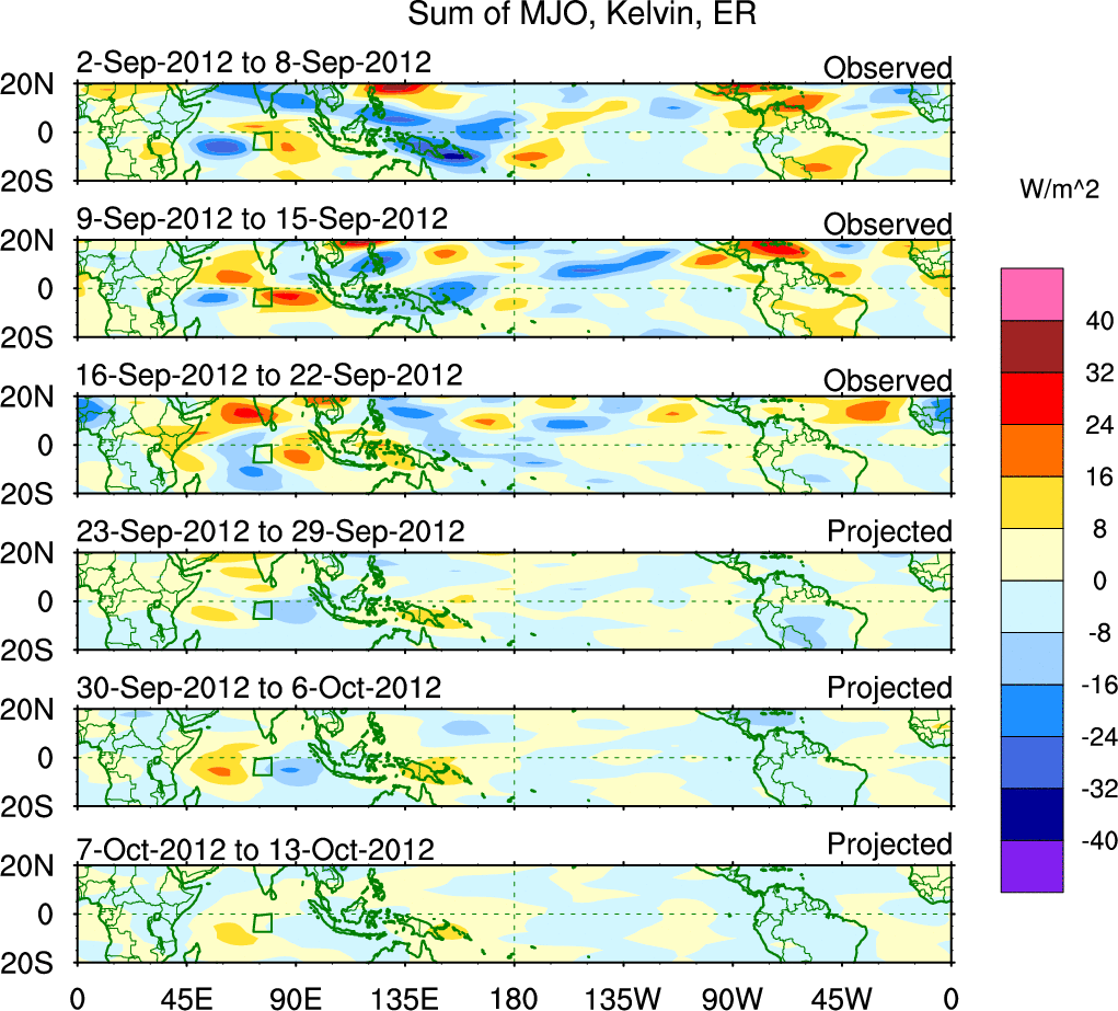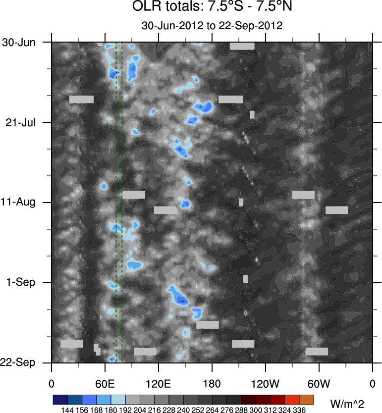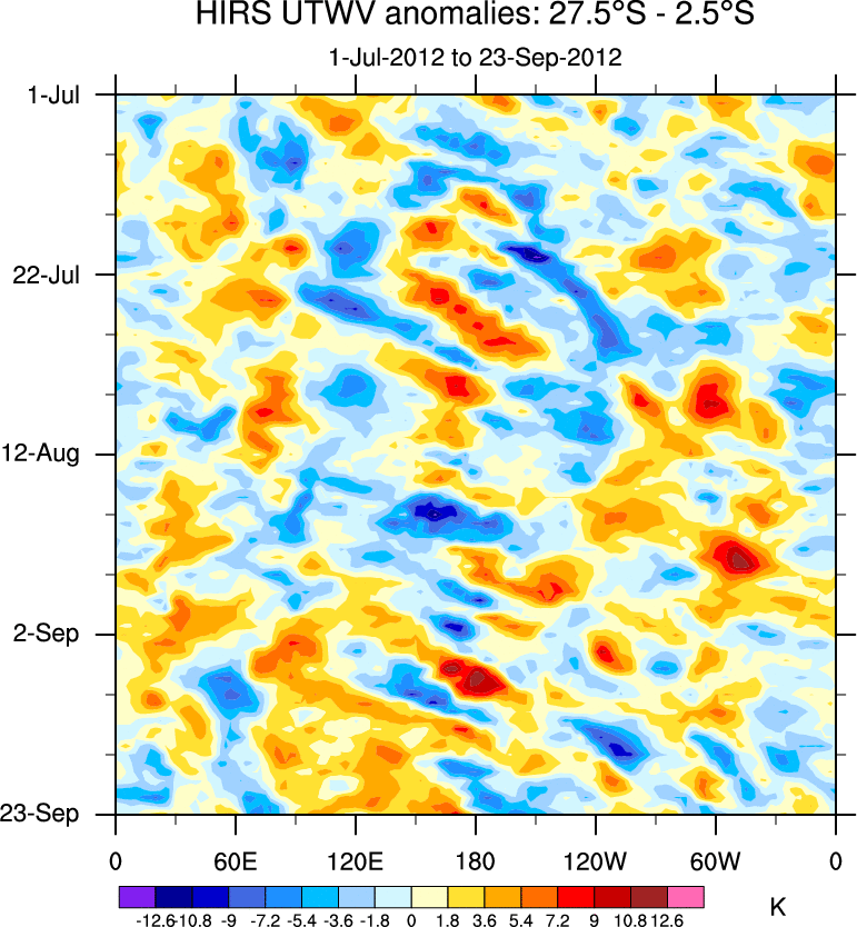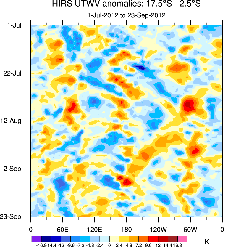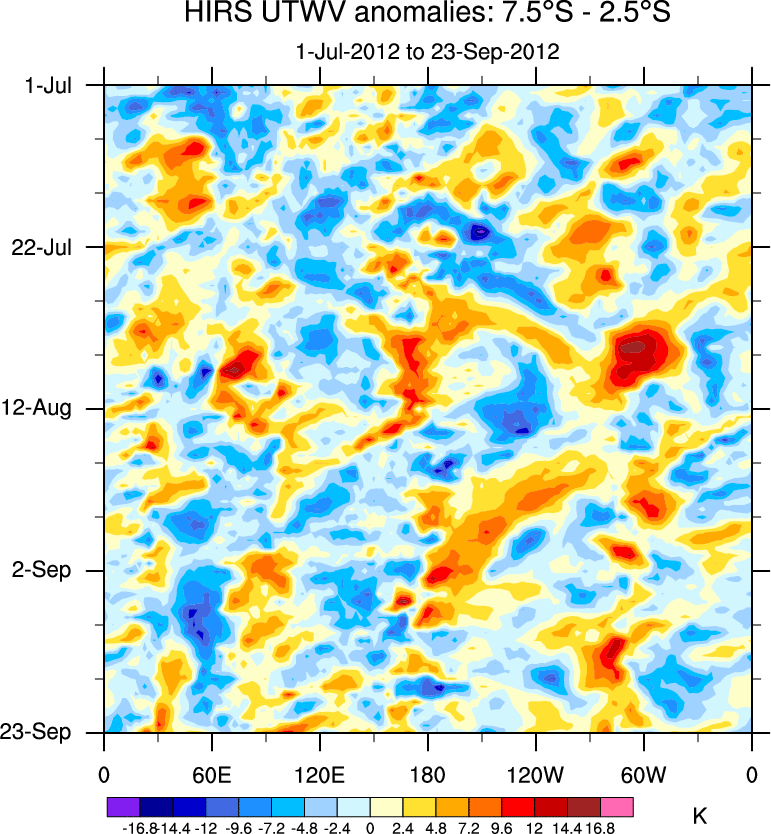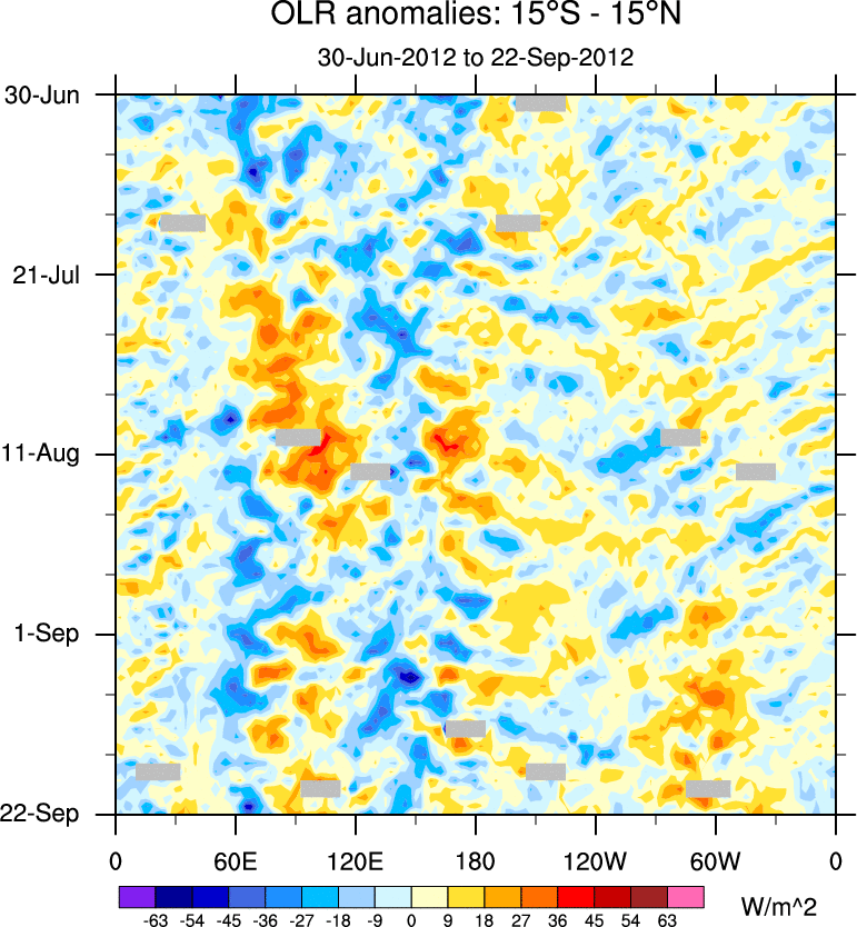 To identify tropical waves in near real-time, the OLR and UTWV data are filtered following Wheeler & Weickmann (2001 MWR). The daily anomalies are calculated using the first 3 harmonics of the seasonal cycle for 1979–2009. Missing values are then filled using linear interpolation in space and time. The most recent 365 days of anomalies are padded with 659 days of zeroes, and the result is filtered for each wave type.