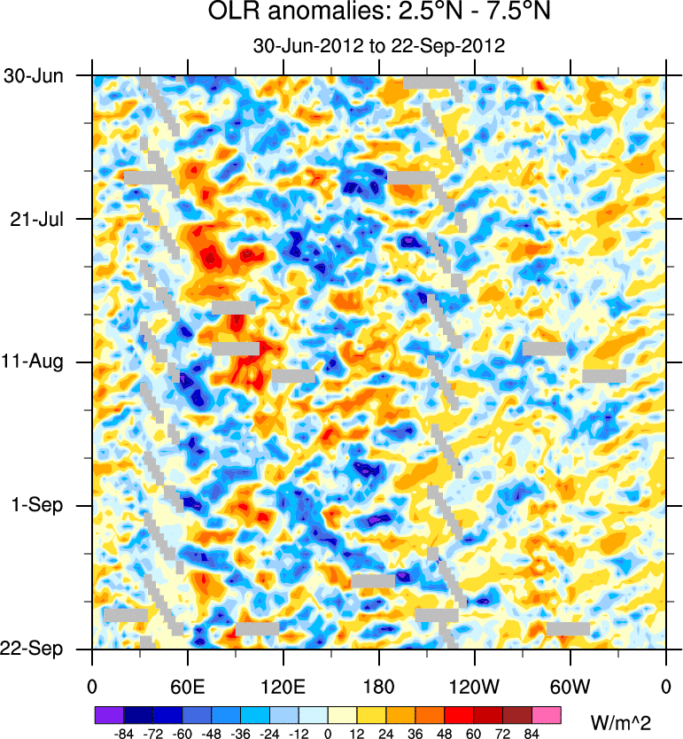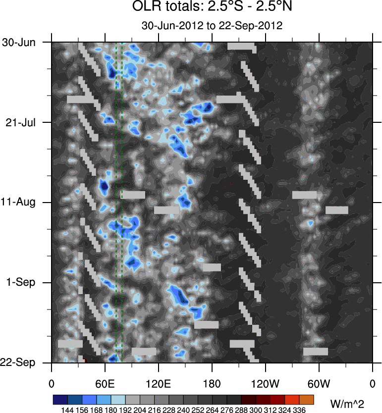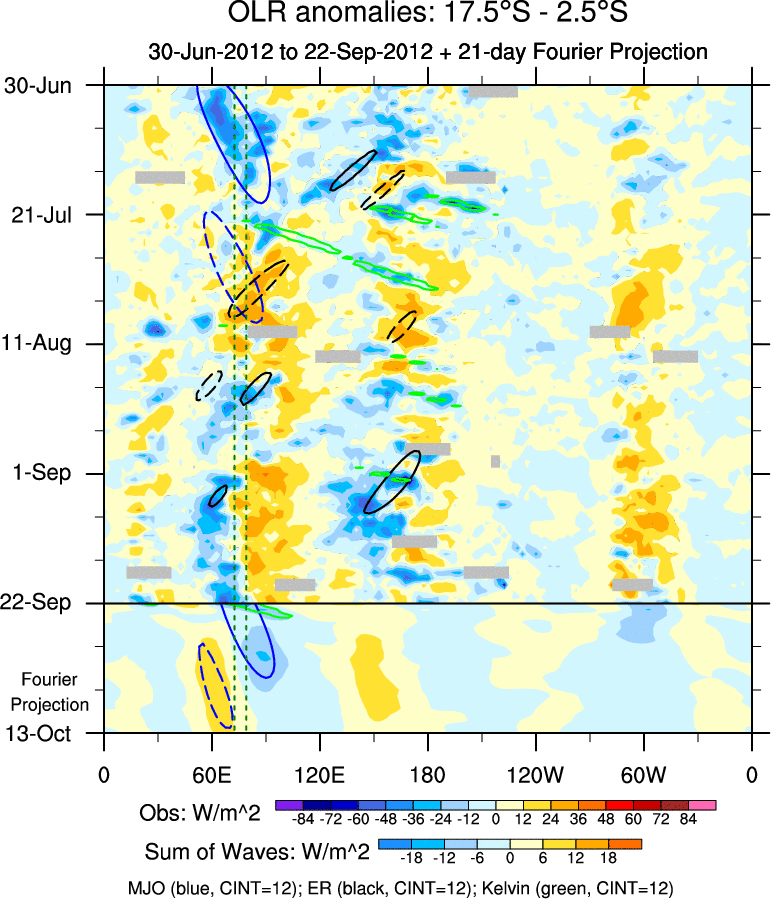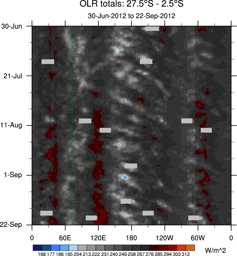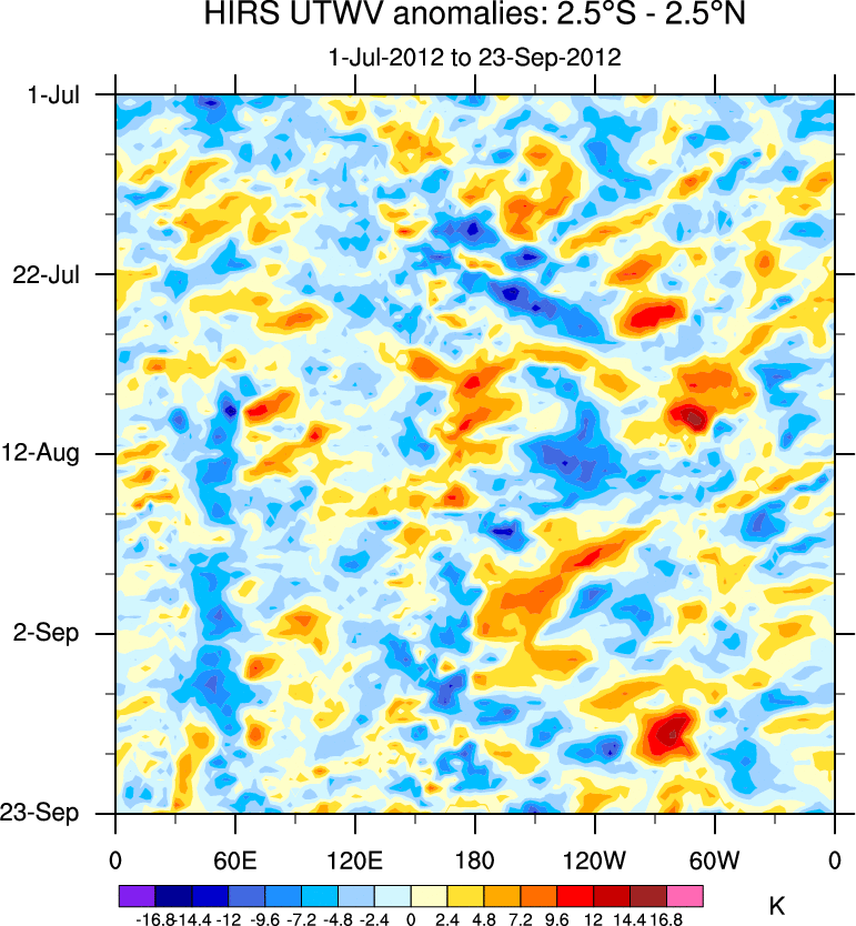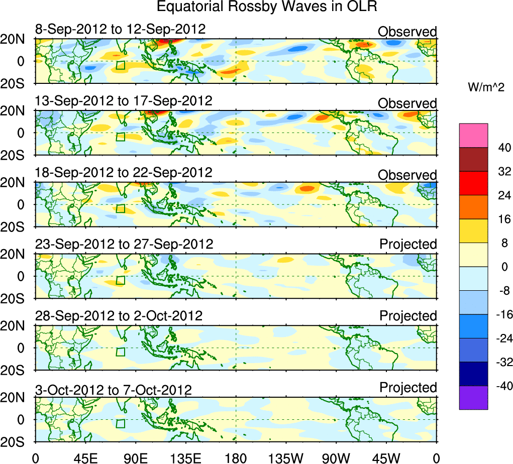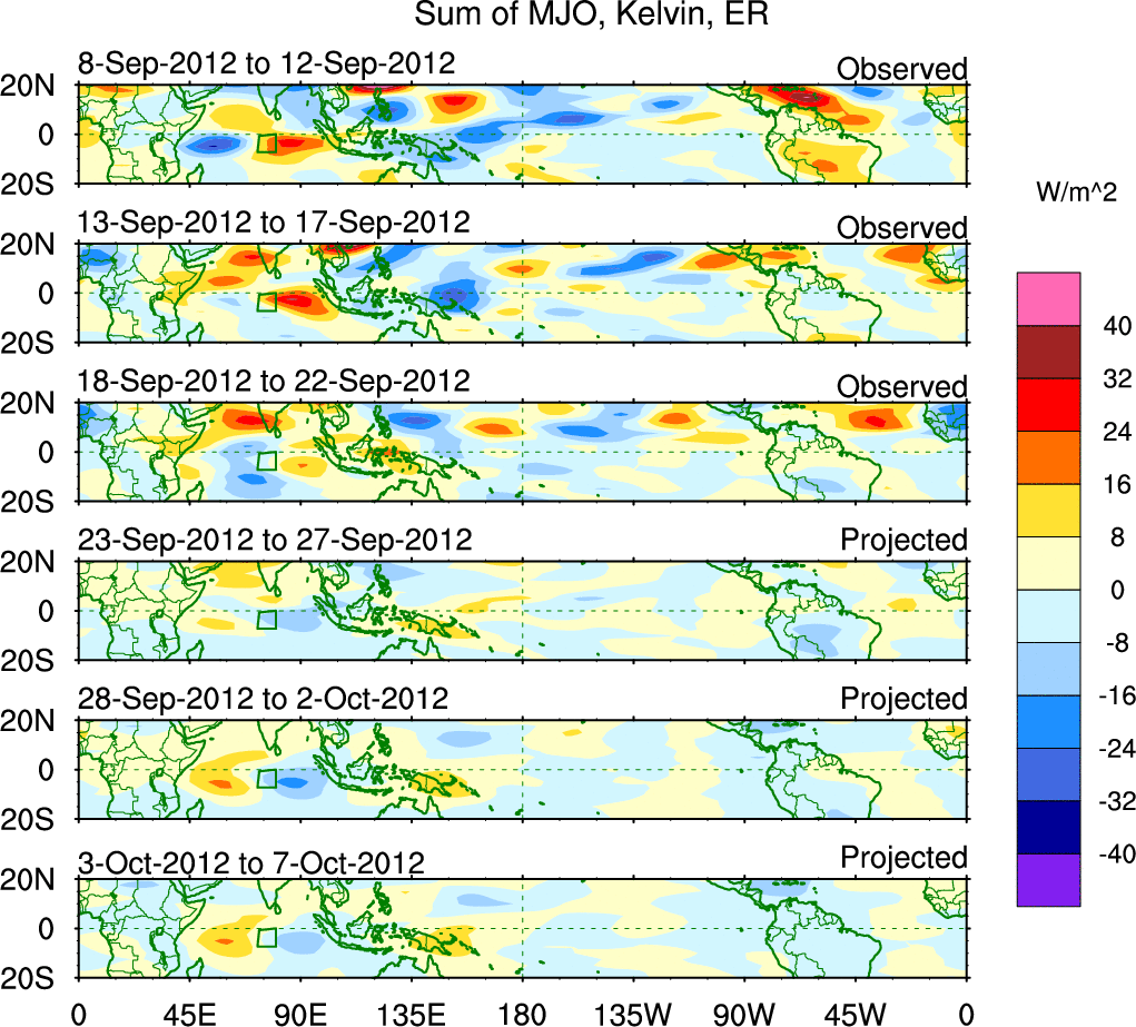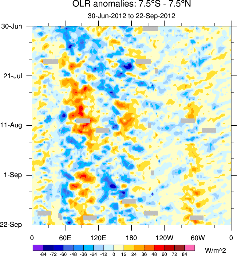 To identify tropical waves in near real-time, the OLR and UTWV data are filtered following Wheeler & Weickmann (2001 MWR). The daily anomalies are calculated using the first 3 harmonics of the seasonal cycle for 1979–2009. Missing values are then filled using linear interpolation in space and time. The most recent 365 days of anomalies are padded with 659 days of zeroes, and the result is filtered for each wave type.