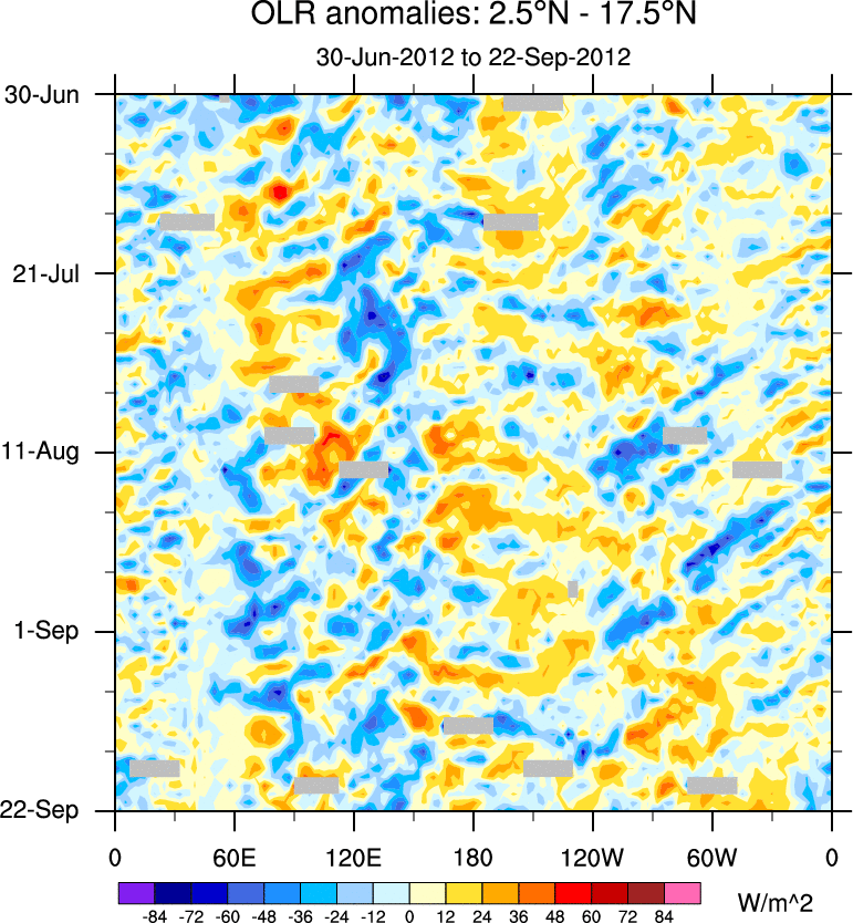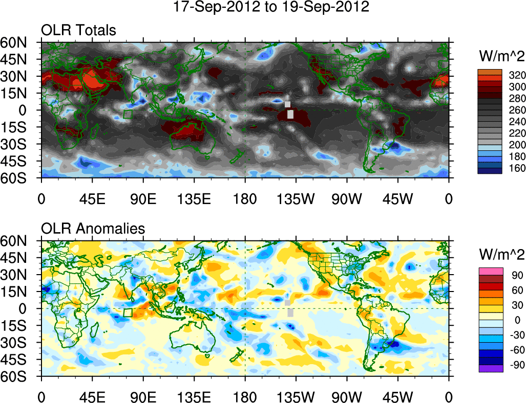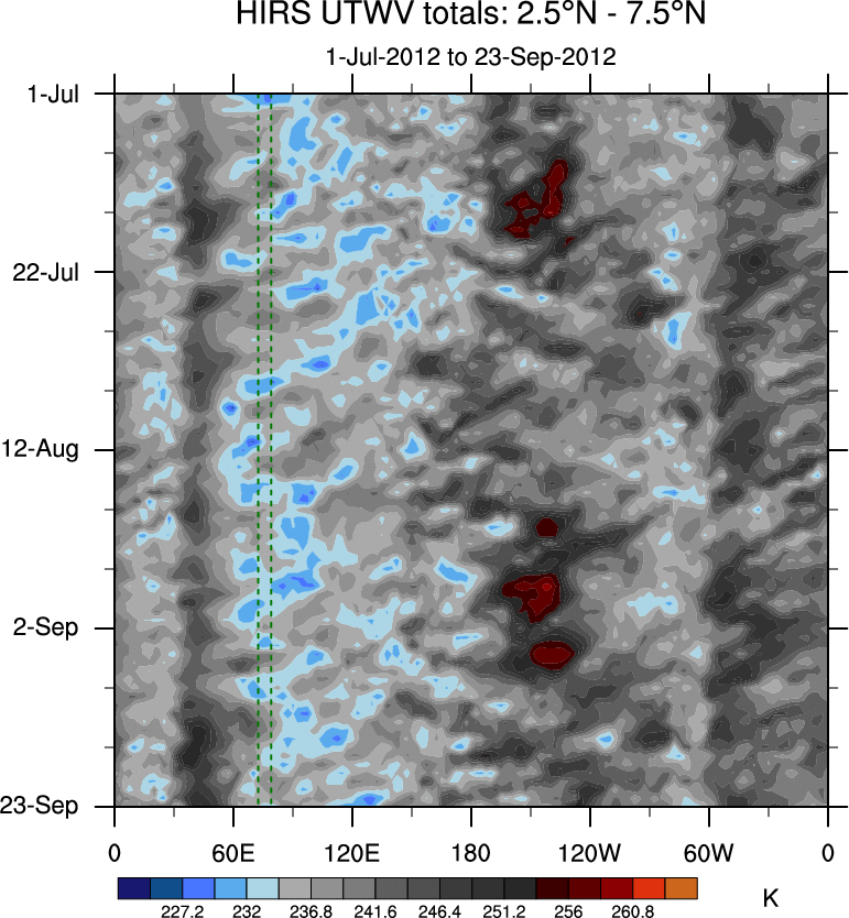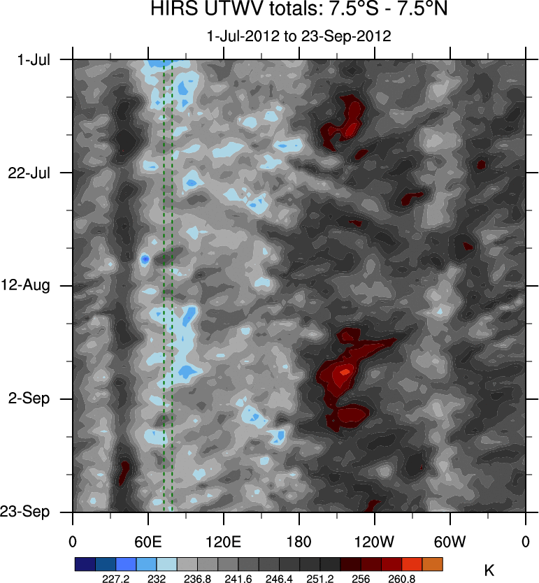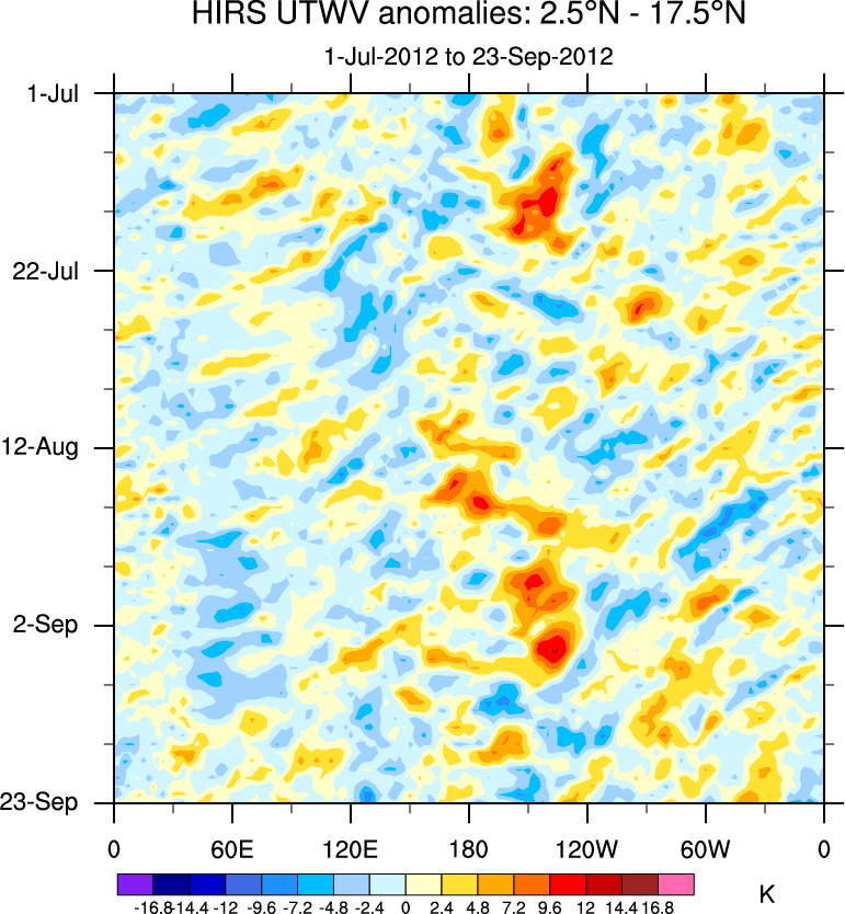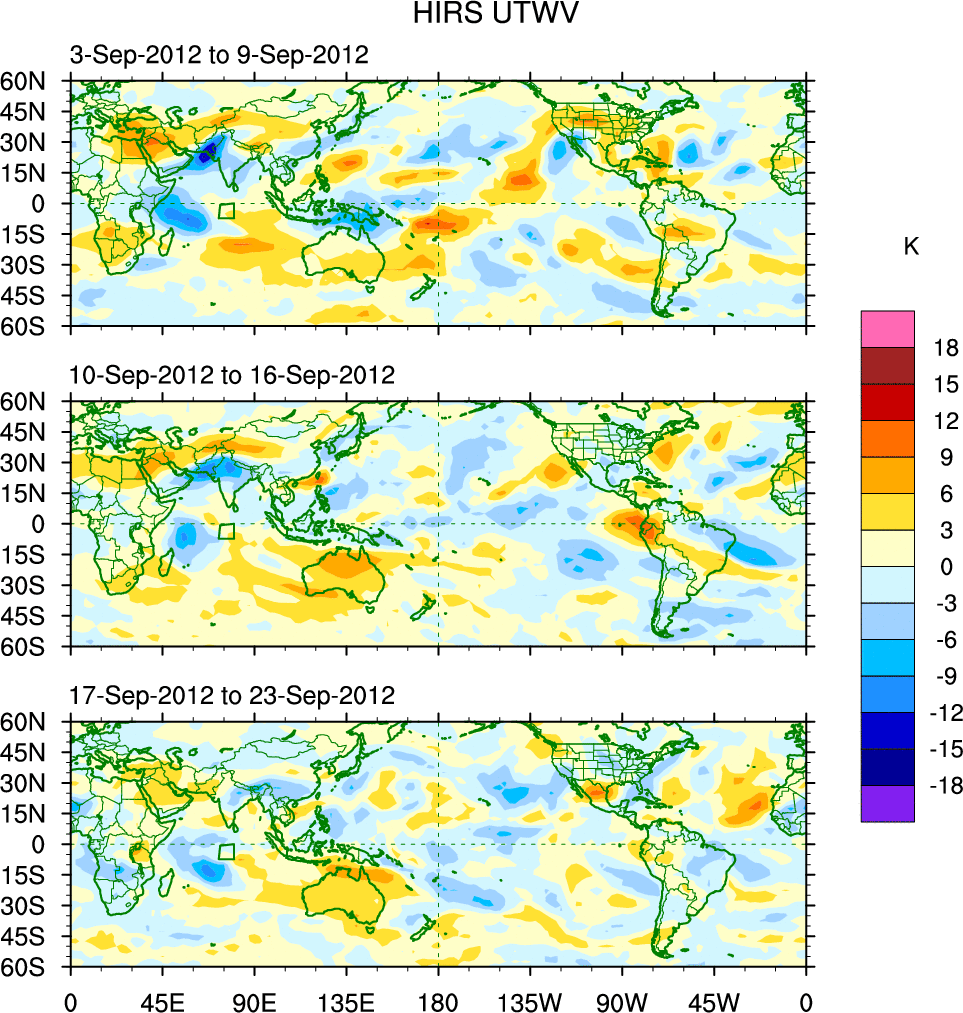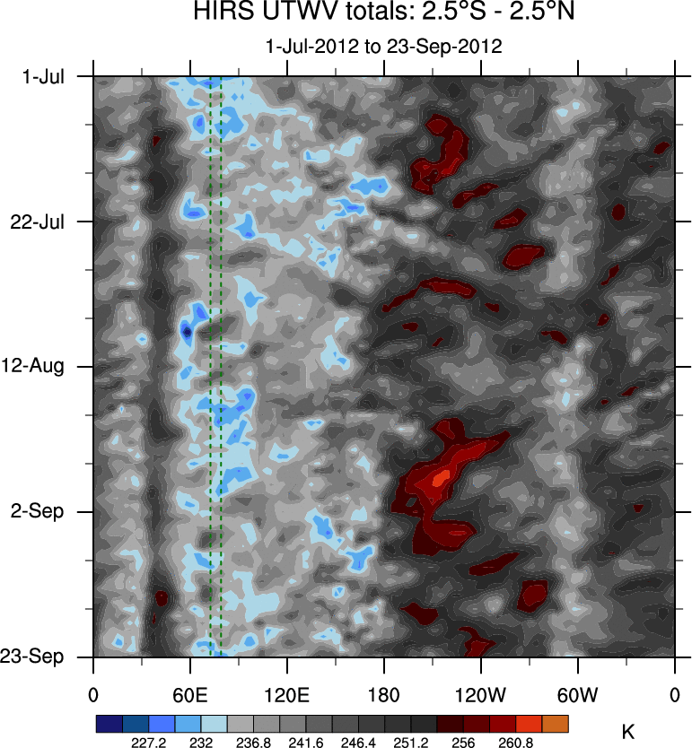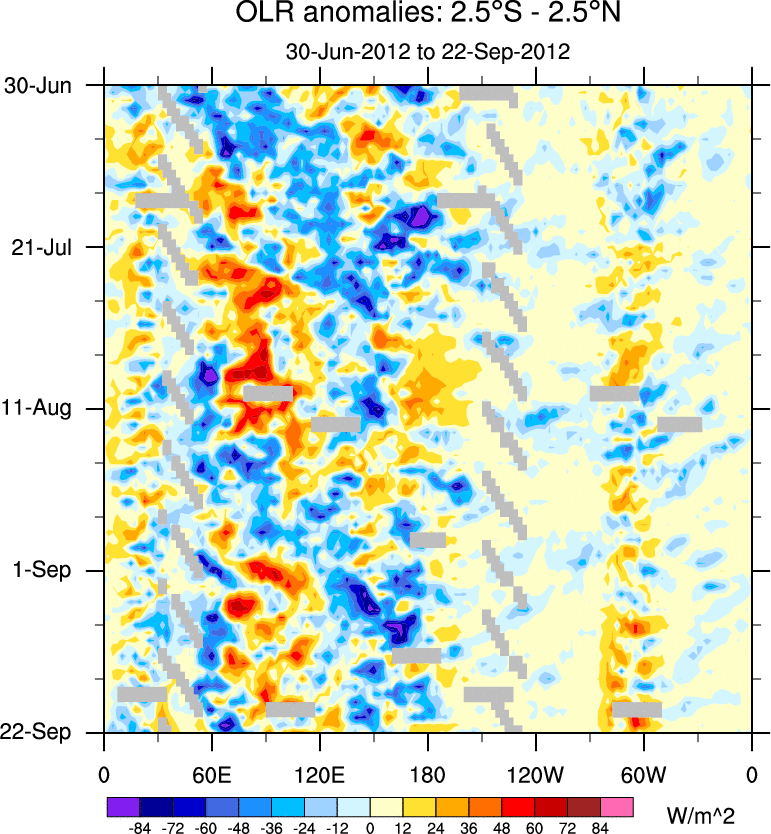 To identify tropical waves in near real-time, the OLR and UTWV data are filtered following Wheeler & Weickmann (2001 MWR). The daily anomalies are calculated using the first 3 harmonics of the seasonal cycle for 1979–2009. Missing values are then filled using linear interpolation in space and time. The most recent 365 days of anomalies are padded with 659 days of zeroes, and the result is filtered for each wave type.