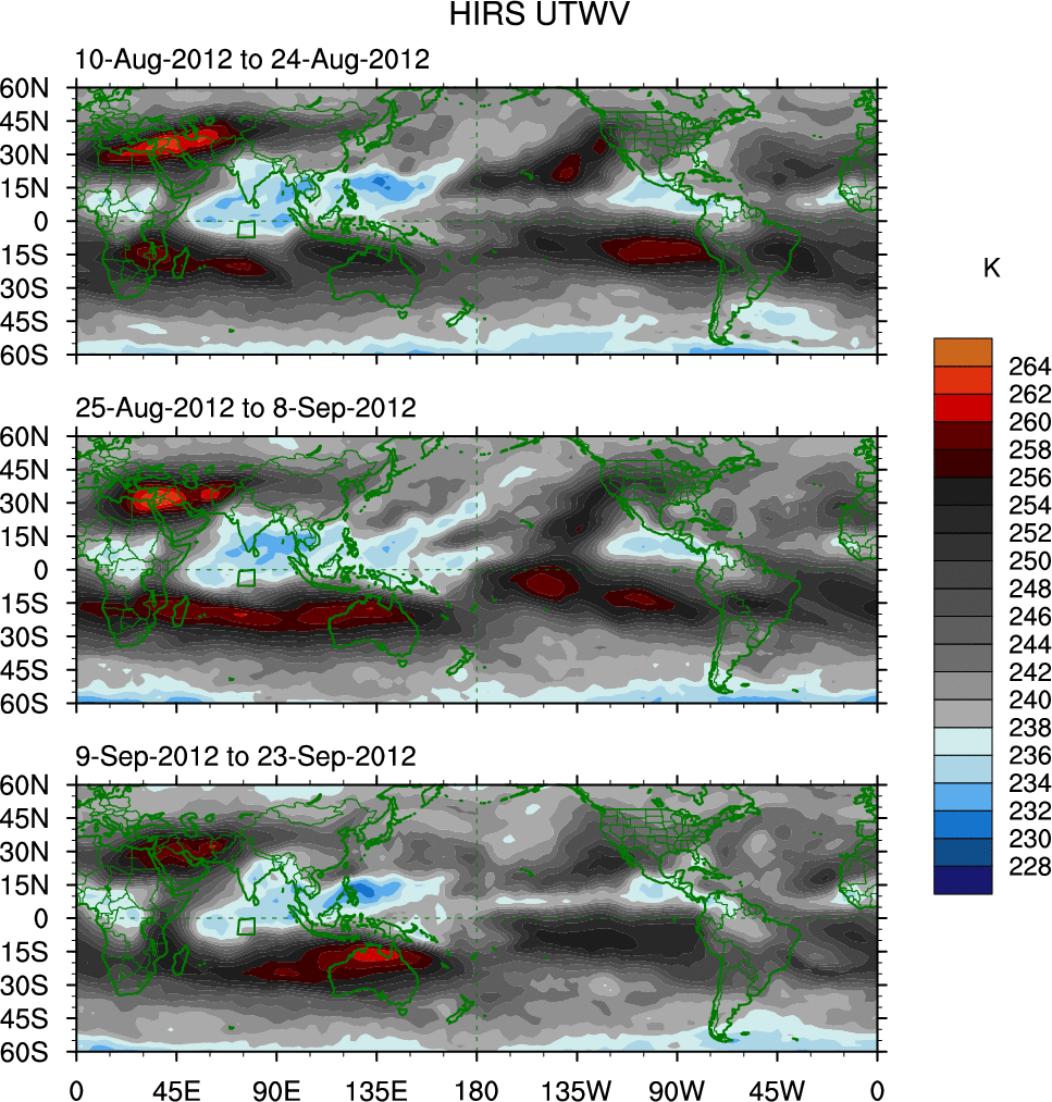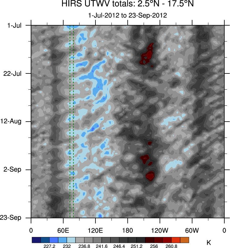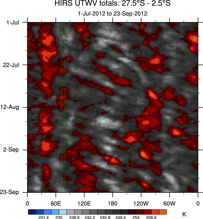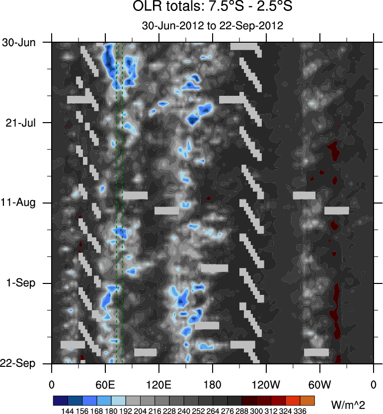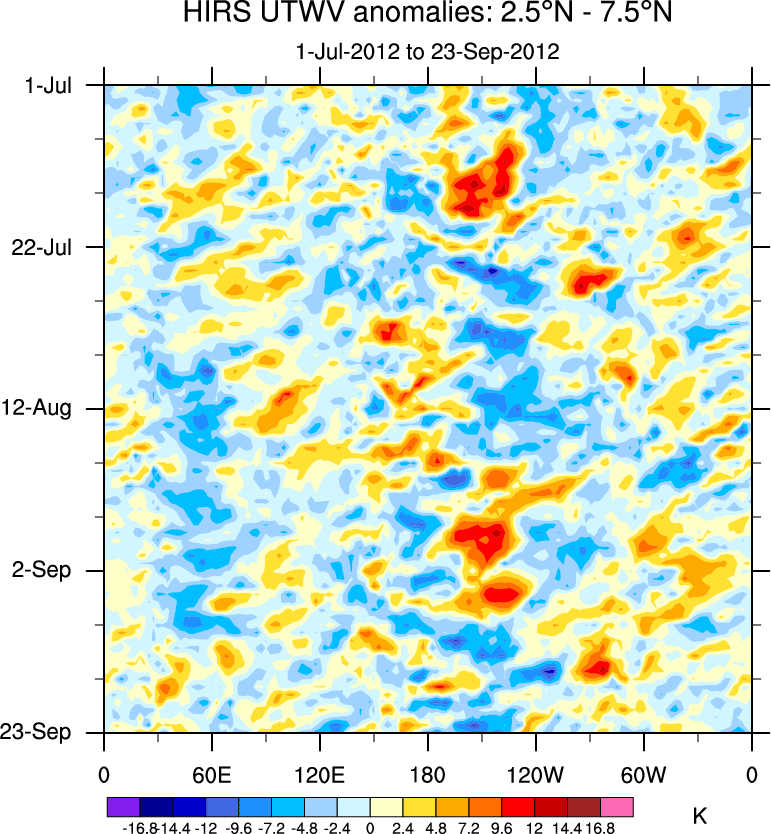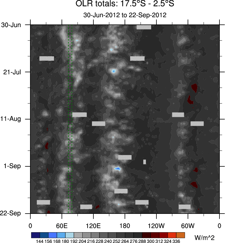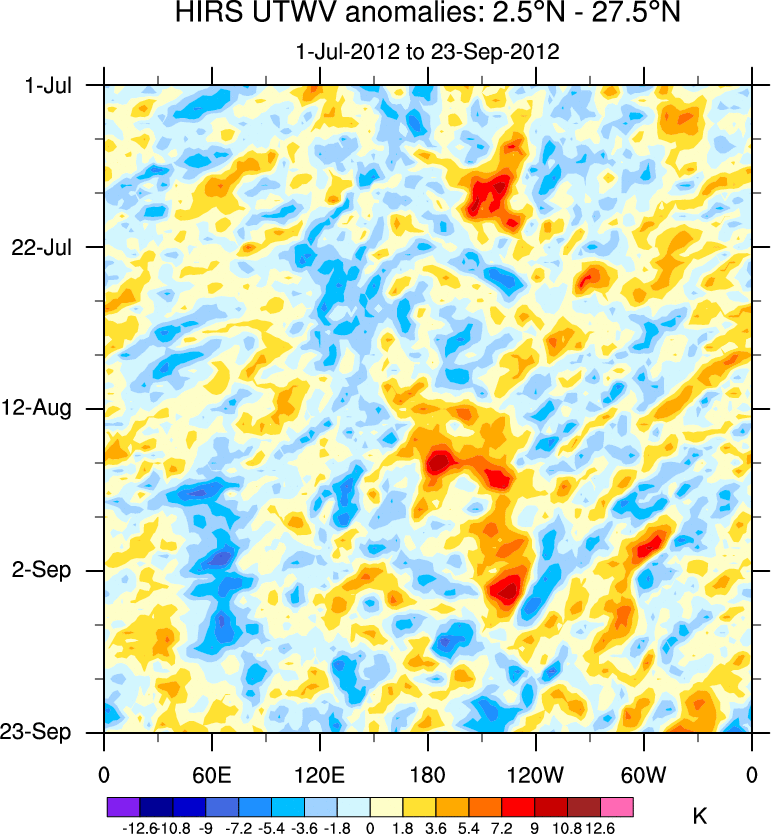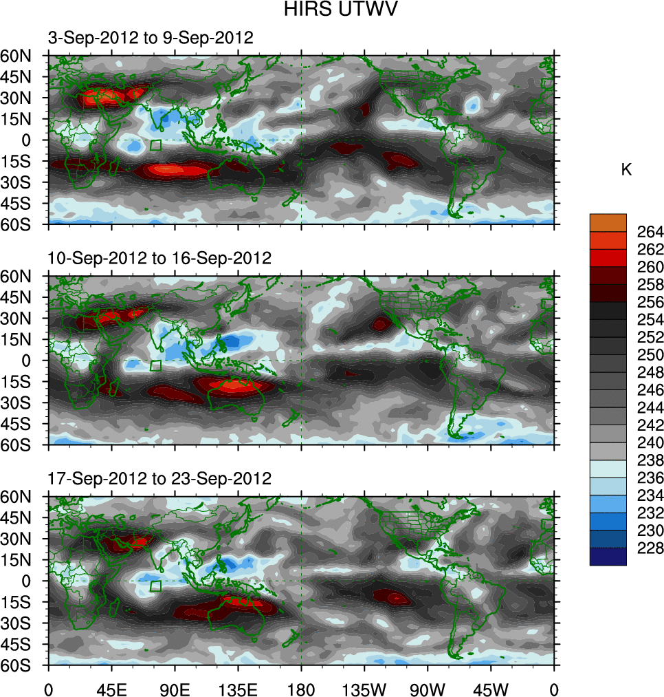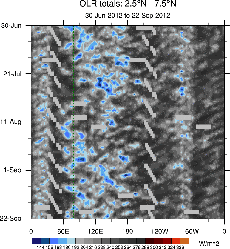 To identify tropical waves in near real-time, the OLR and UTWV data are filtered following Wheeler & Weickmann (2001 MWR). The daily anomalies are calculated using the first 3 harmonics of the seasonal cycle for 1979–2009. Missing values are then filled using linear interpolation in space and time. The most recent 365 days of anomalies are padded with 659 days of zeroes, and the result is filtered for each wave type.