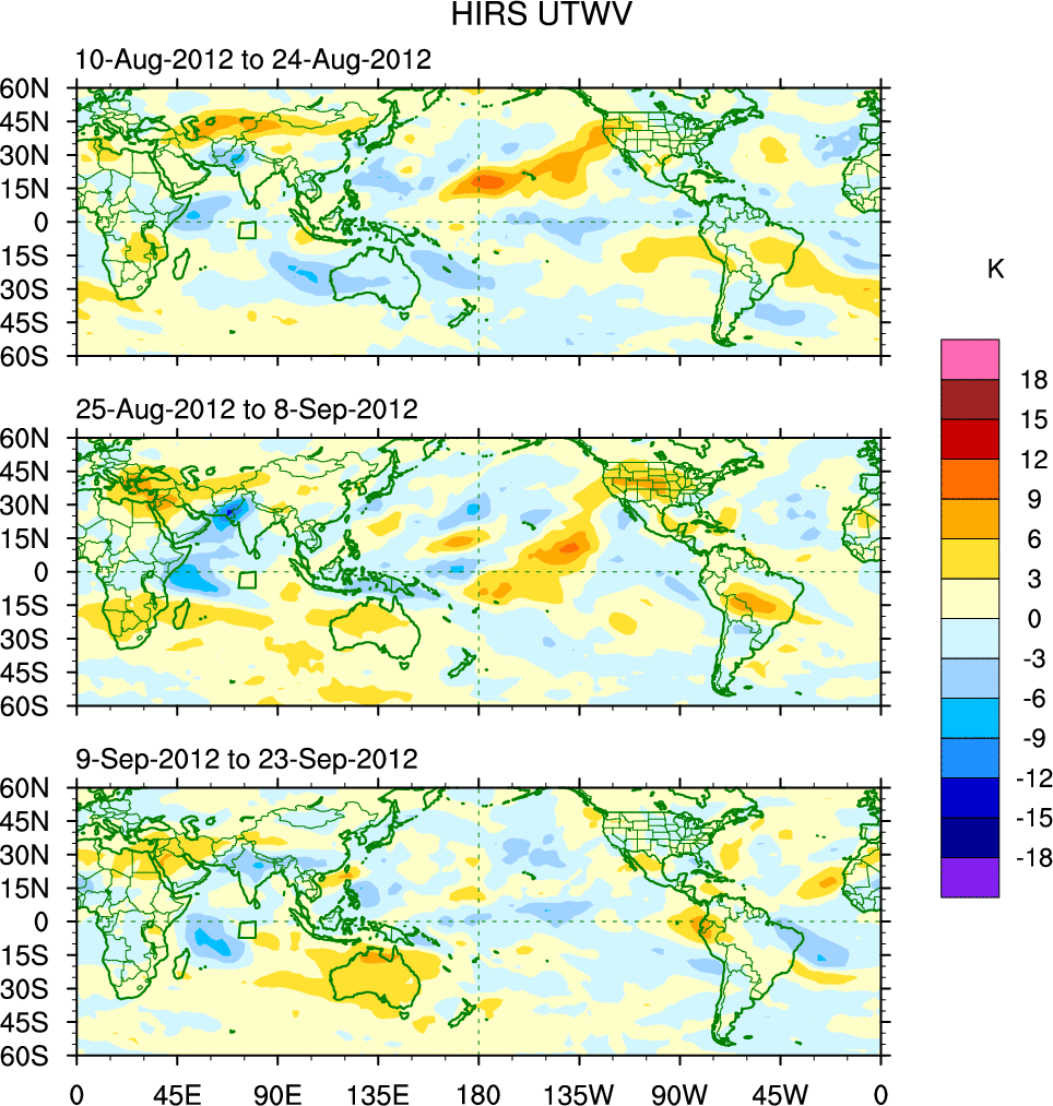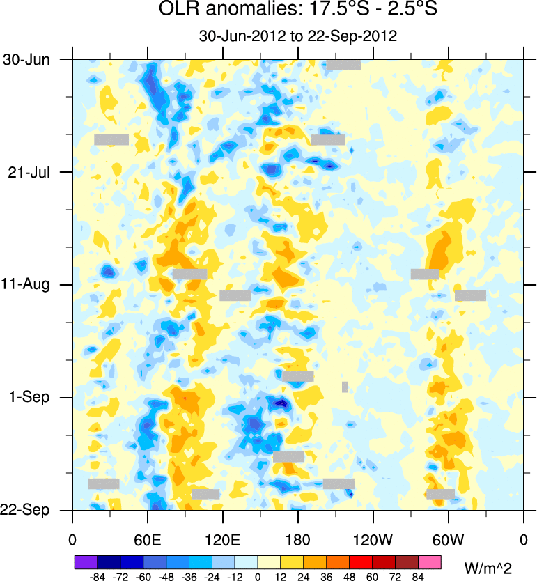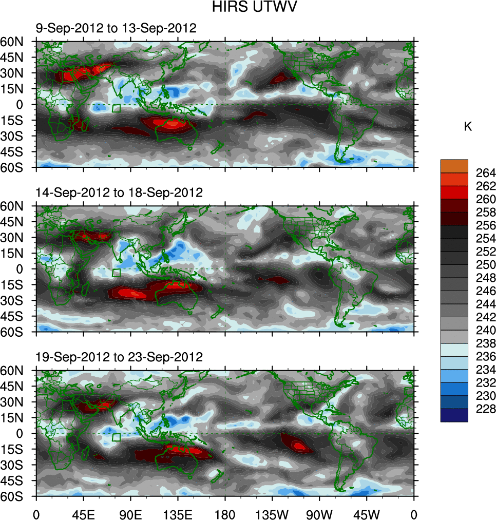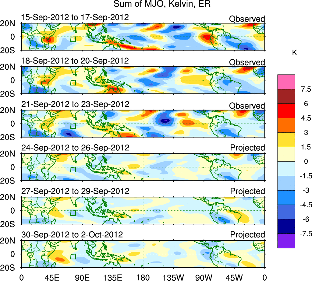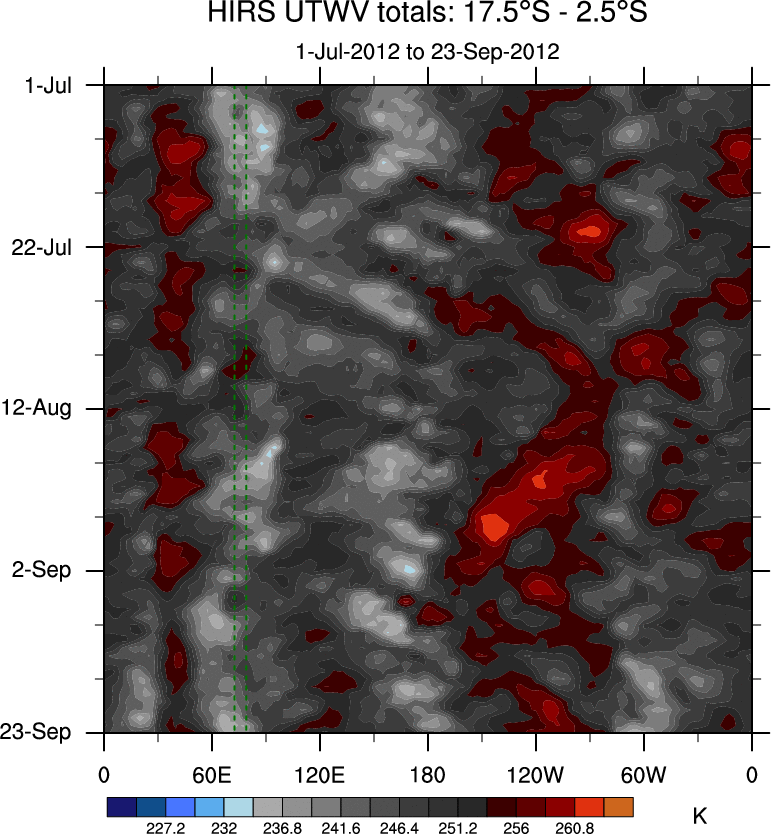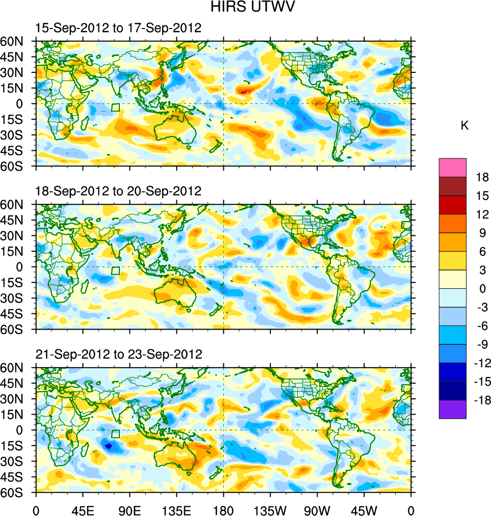 To identify tropical waves in near real-time, the OLR and UTWV data are filtered following Wheeler & Weickmann (2001 MWR). The daily anomalies are calculated using the first 3 harmonics of the seasonal cycle for 1979–2009. Missing values are then filled using linear interpolation in space and time. The most recent 365 days of anomalies are padded with 659 days of zeroes, and the result is filtered for each wave type.