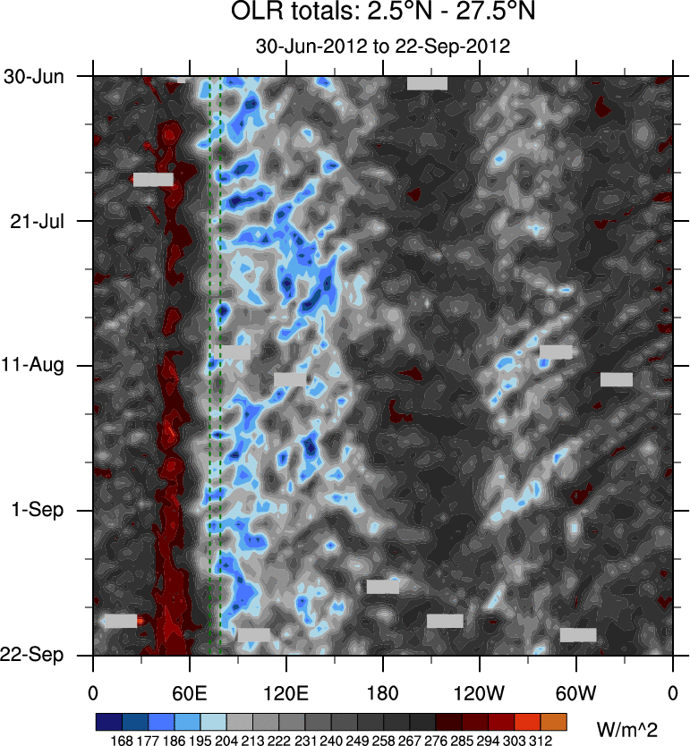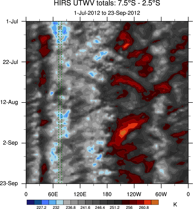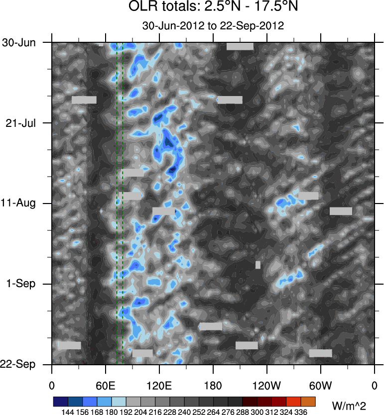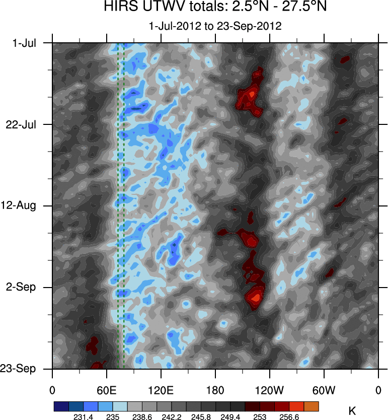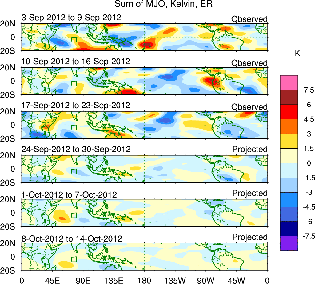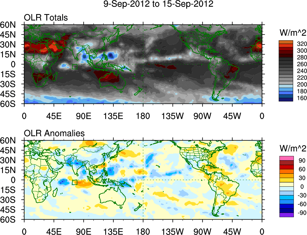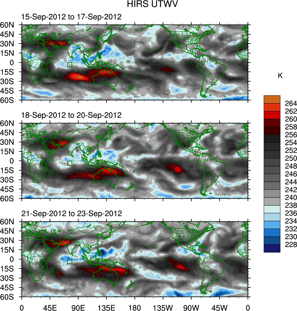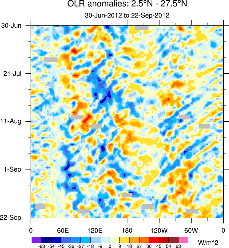 To identify tropical waves in near real-time, the OLR and UTWV data are filtered following Wheeler & Weickmann (2001 MWR). The daily anomalies are calculated using the first 3 harmonics of the seasonal cycle for 1979–2009. Missing values are then filled using linear interpolation in space and time. The most recent 365 days of anomalies are padded with 659 days of zeroes, and the result is filtered for each wave type.