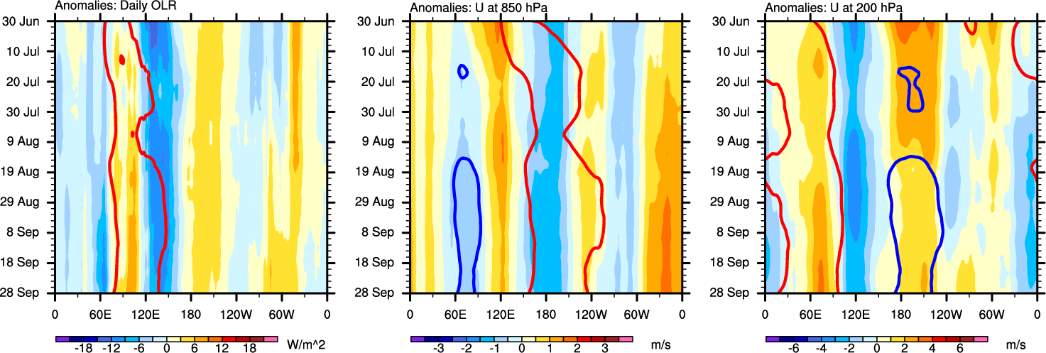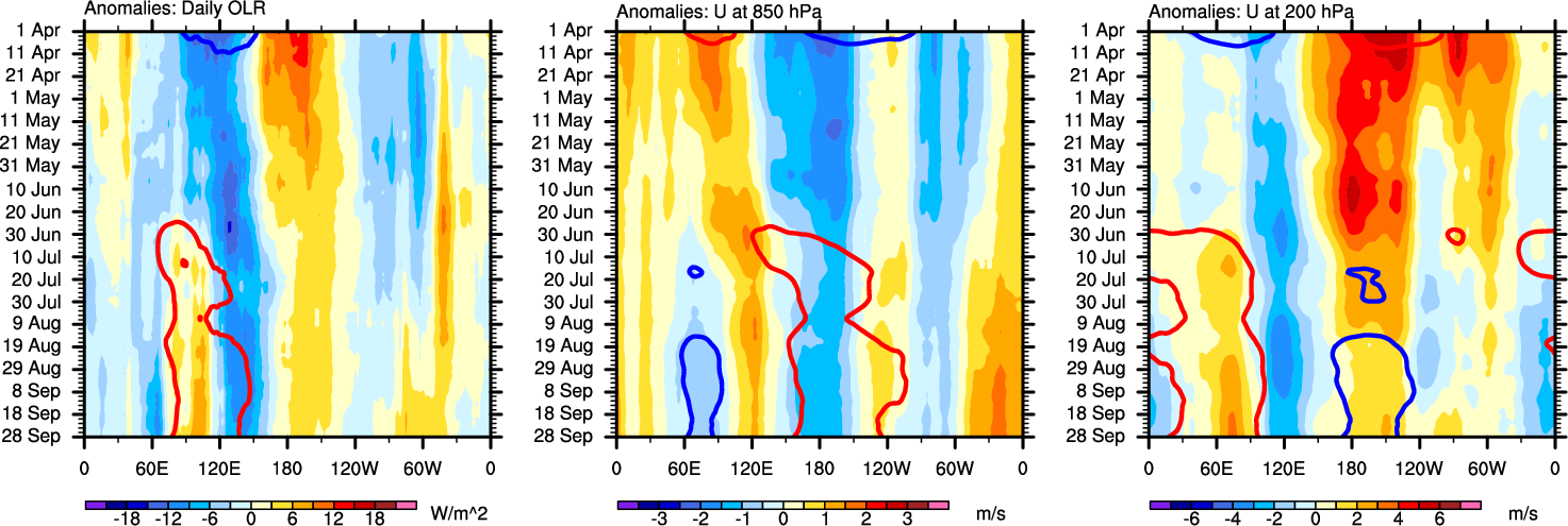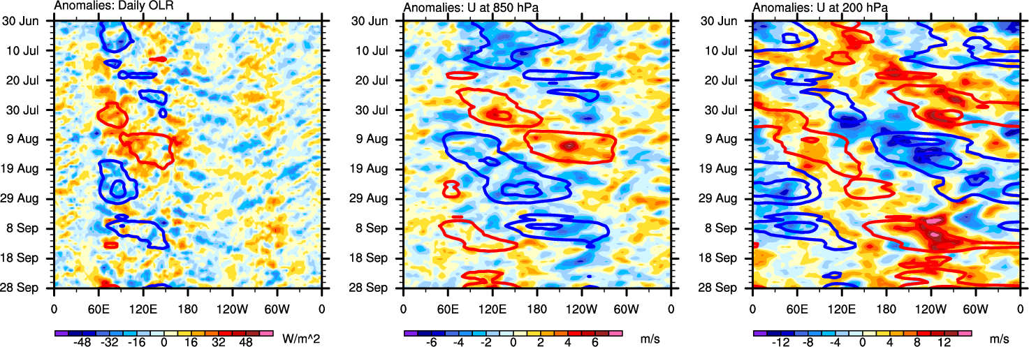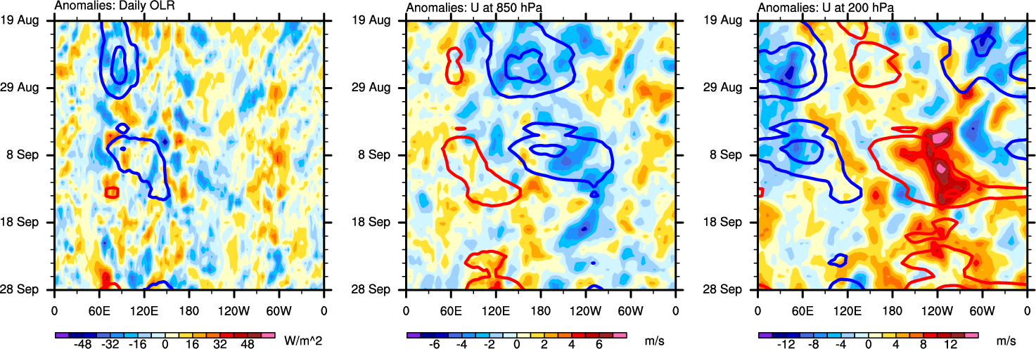 The Hovmollers show longitude-time plots for OLR, U-850, and U-200. The shading indicates the observed anomalies, while the contours are the projection of those anomalies onto the RMM EOFs.